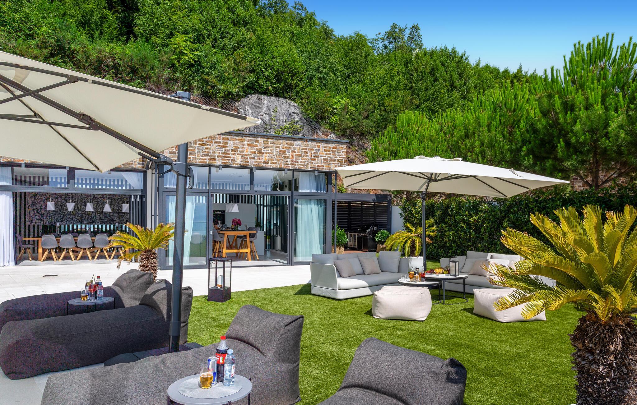 Genießen Sie wunderbare Stunden im Außenbereich des Hauses, Sie haben die Wahl zwischen mehreren Terrassen. Nehmen Sie ein Sonnenbad im Liegestuhl, schwimmen Sie ausgiebig im Pool vor zauberhafter Kulisse, servieren Sie leckere Gerichte vom Grill und lassen Sie den Tag im Whirlpool unter freiem Himmel ausklingen.