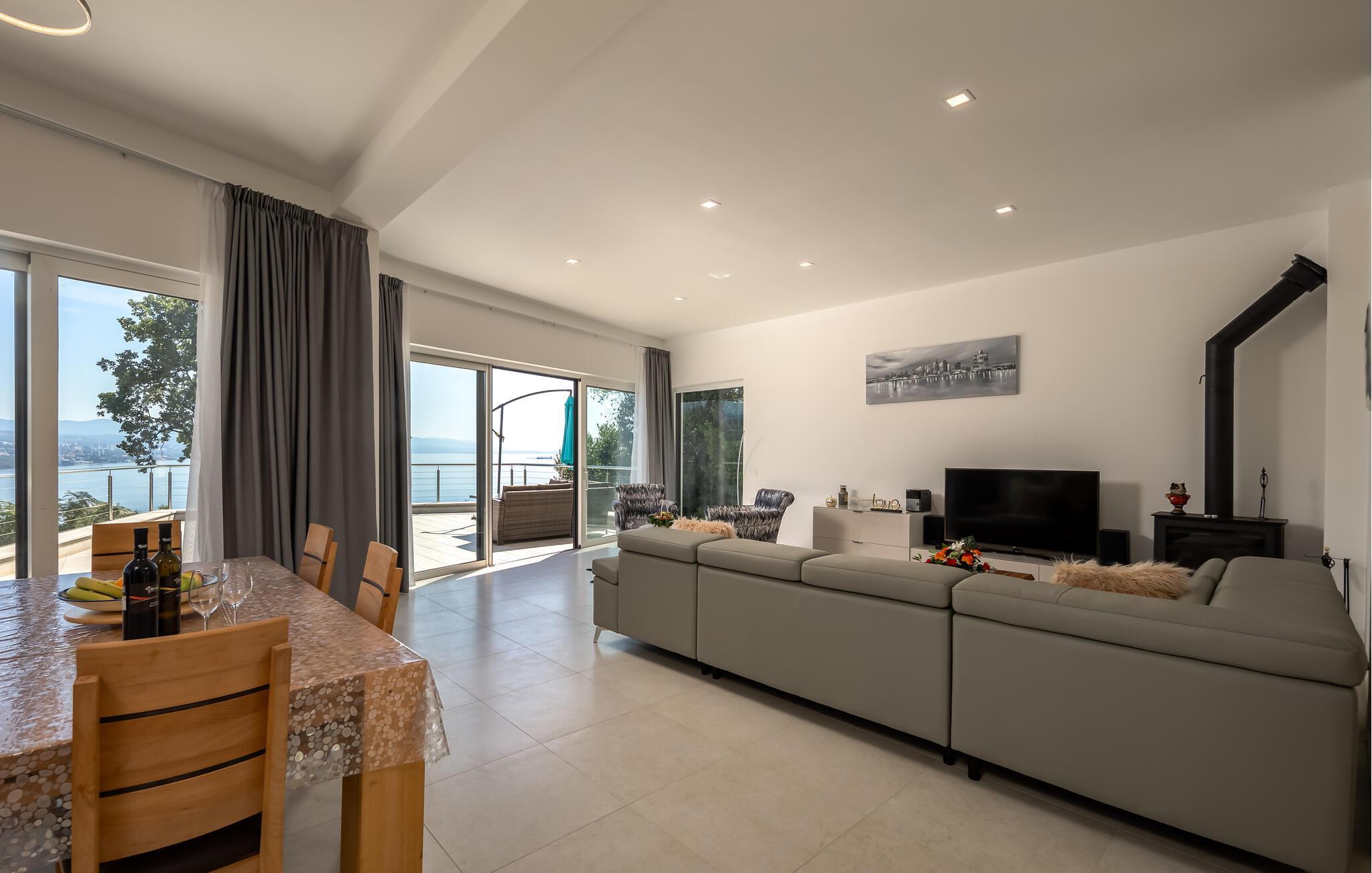 Diese komfortable Haus verspricht Ihnen einen Urlaub der Extraklasse. Helle, großzügige Räume, elegantes Mobiliar und liebevoll ausgesuchte Details schaffen eine Atmosphäre, die angenehm beruhigend ist. Verbringen Sie einen entspannten Nachmittag auf dem Sofa und genießen Sie den Panoramablick auf die Kvarner Bucht. Oder bereiten Sie in der modernen Küche frische Mahlzeiten zu – sie schmecken mit einem guten Glas Wein besonders lecker.