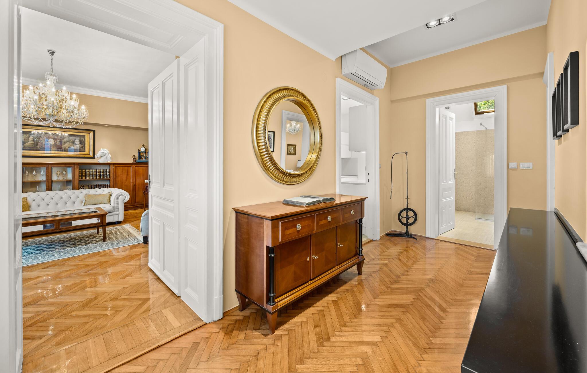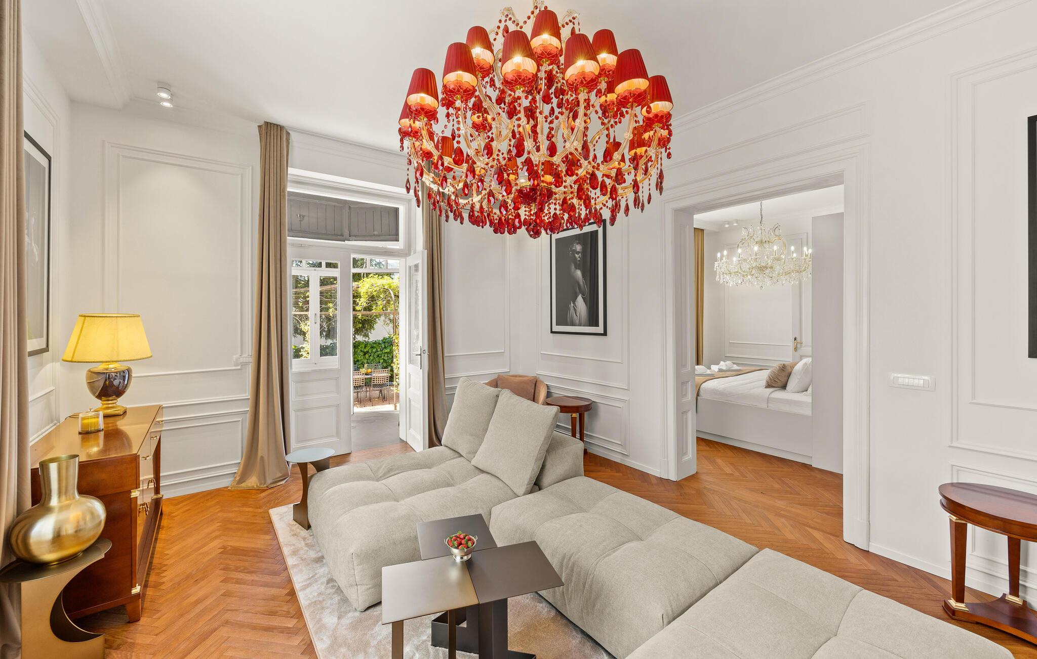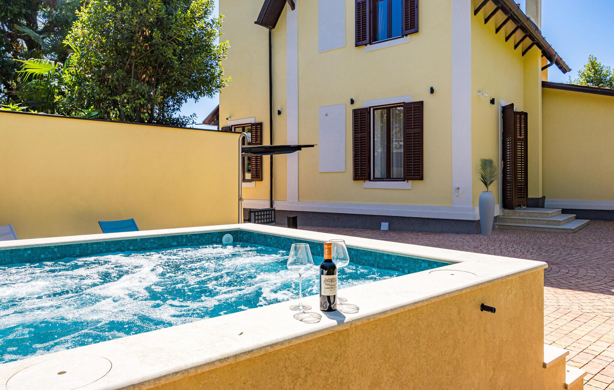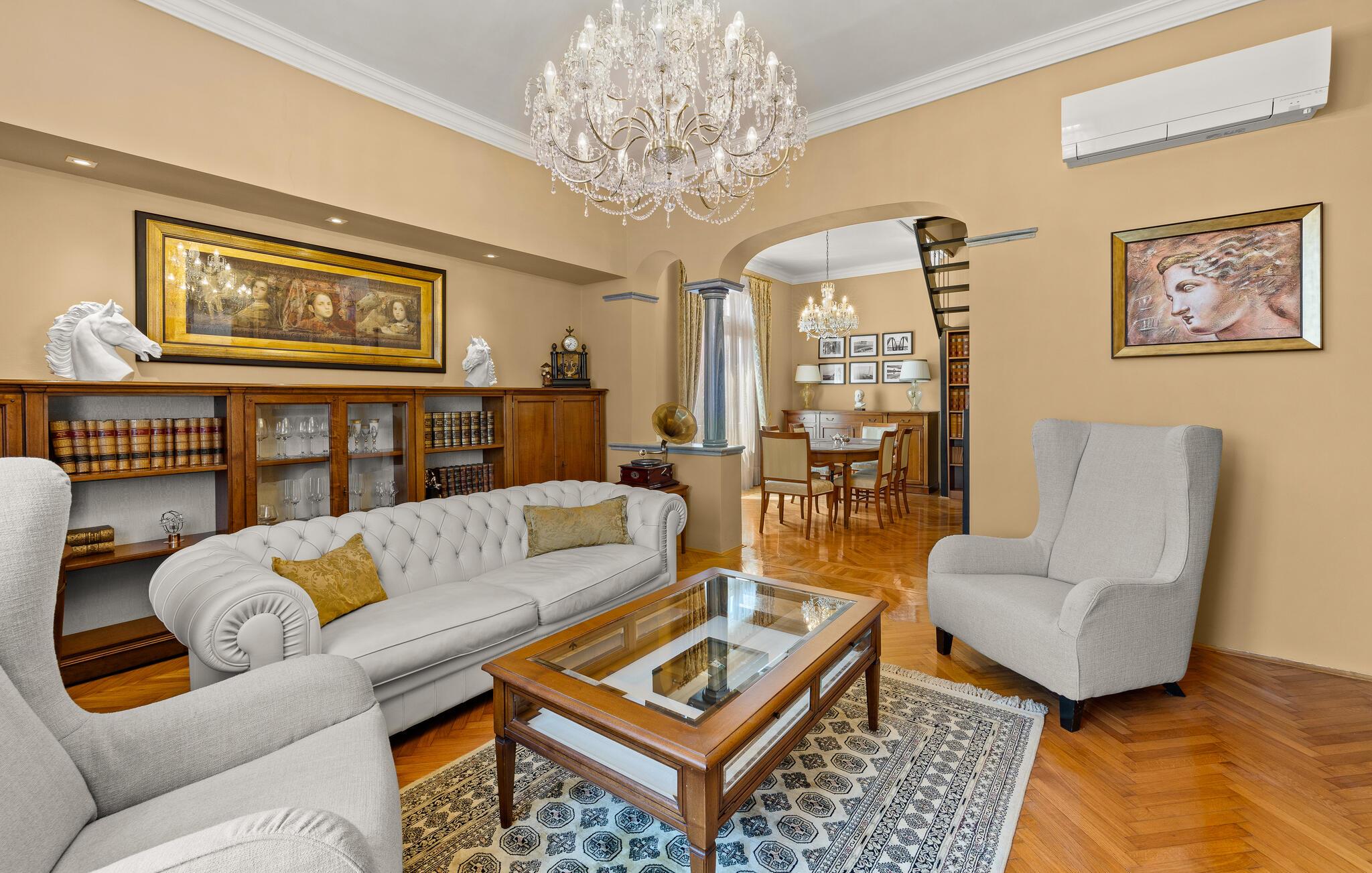 Diese majestätische Villa verspricht einen Urlaub vom Feinsten. Edles Parkett, stilvolles Mobiliar und elegante Kronleuchter schaffen eine ruhige Atmosphäre, in der sofort abschalten und neue Energie tanken können. Liebevolle Details geben dem Ganzen zusätzlich eine persönliche Note. Lehnen Sie sich entspannt auf der bequemen Sofalandschaft zurück, genießen Sie ein Glas Wein und geben Sie sich ganz dem erholsamen Urlaubsgefühl hin.