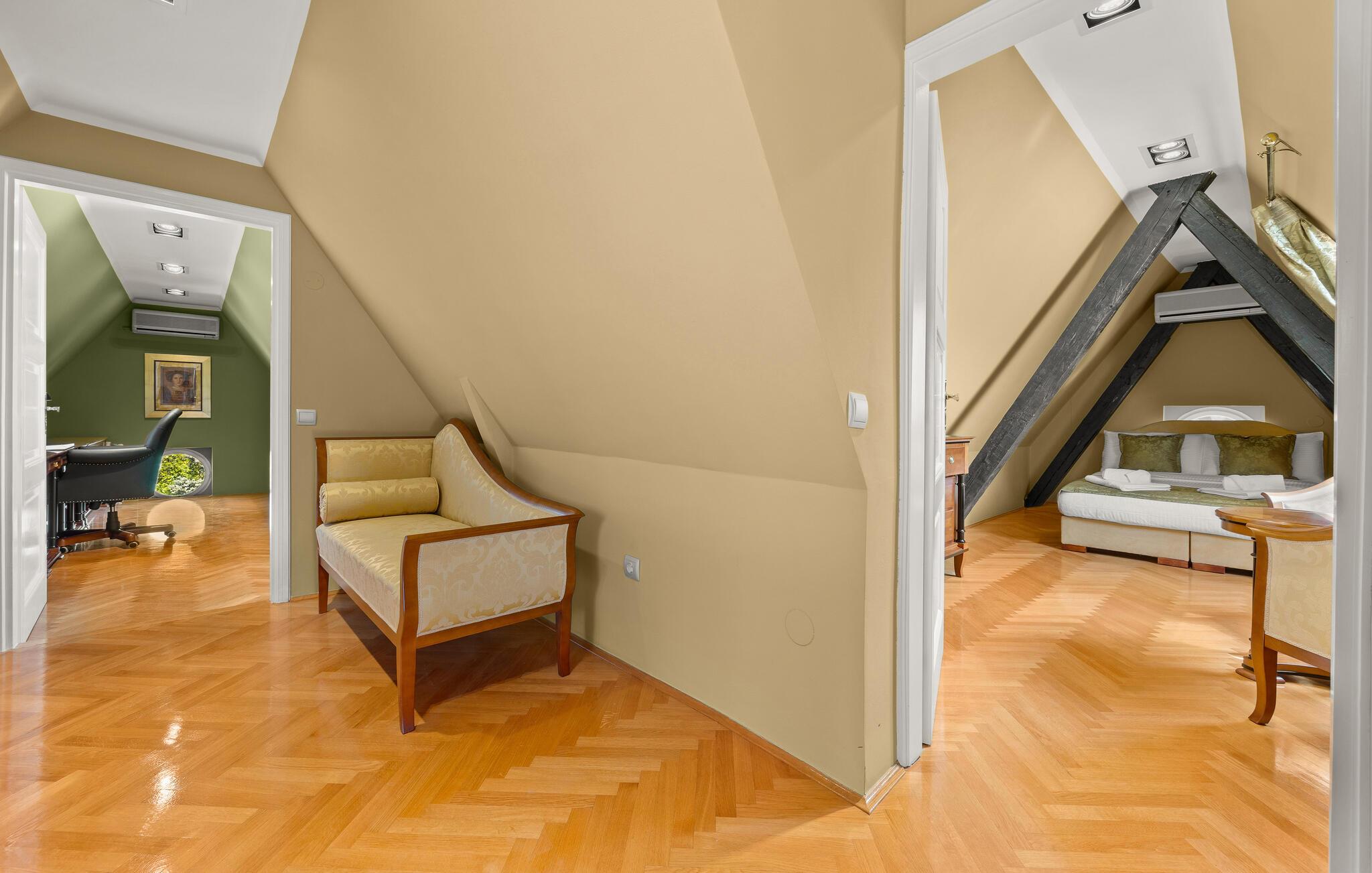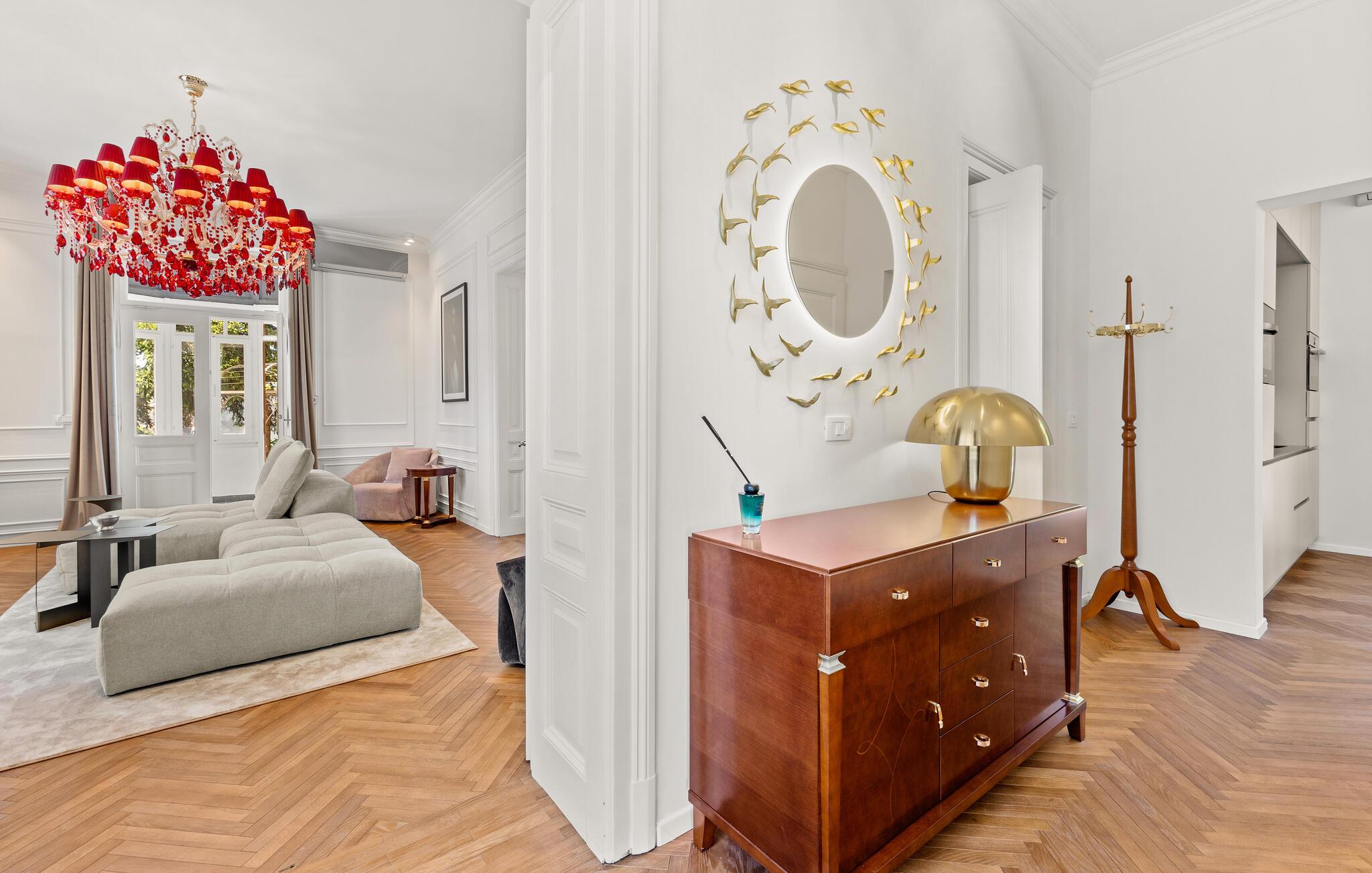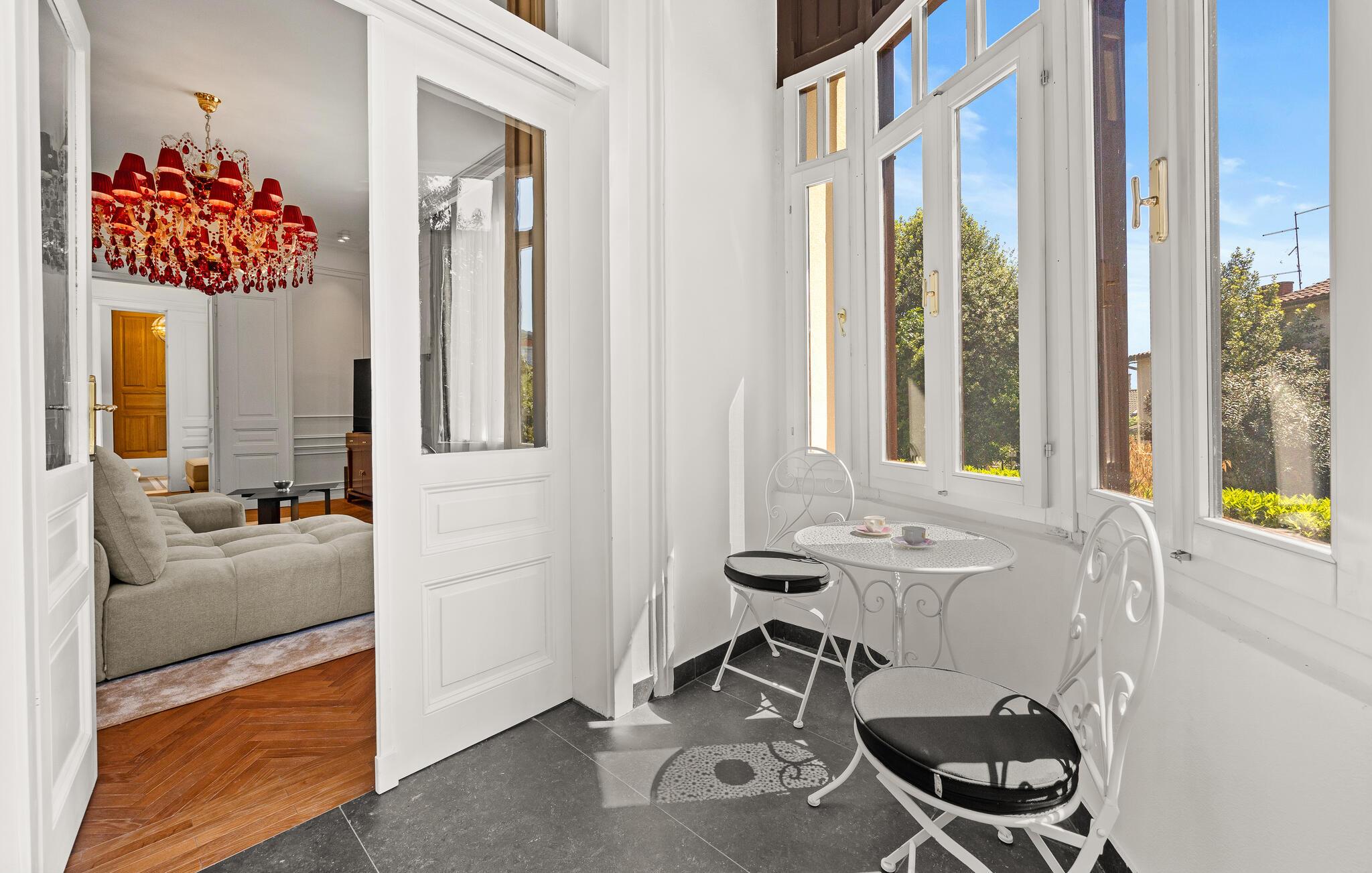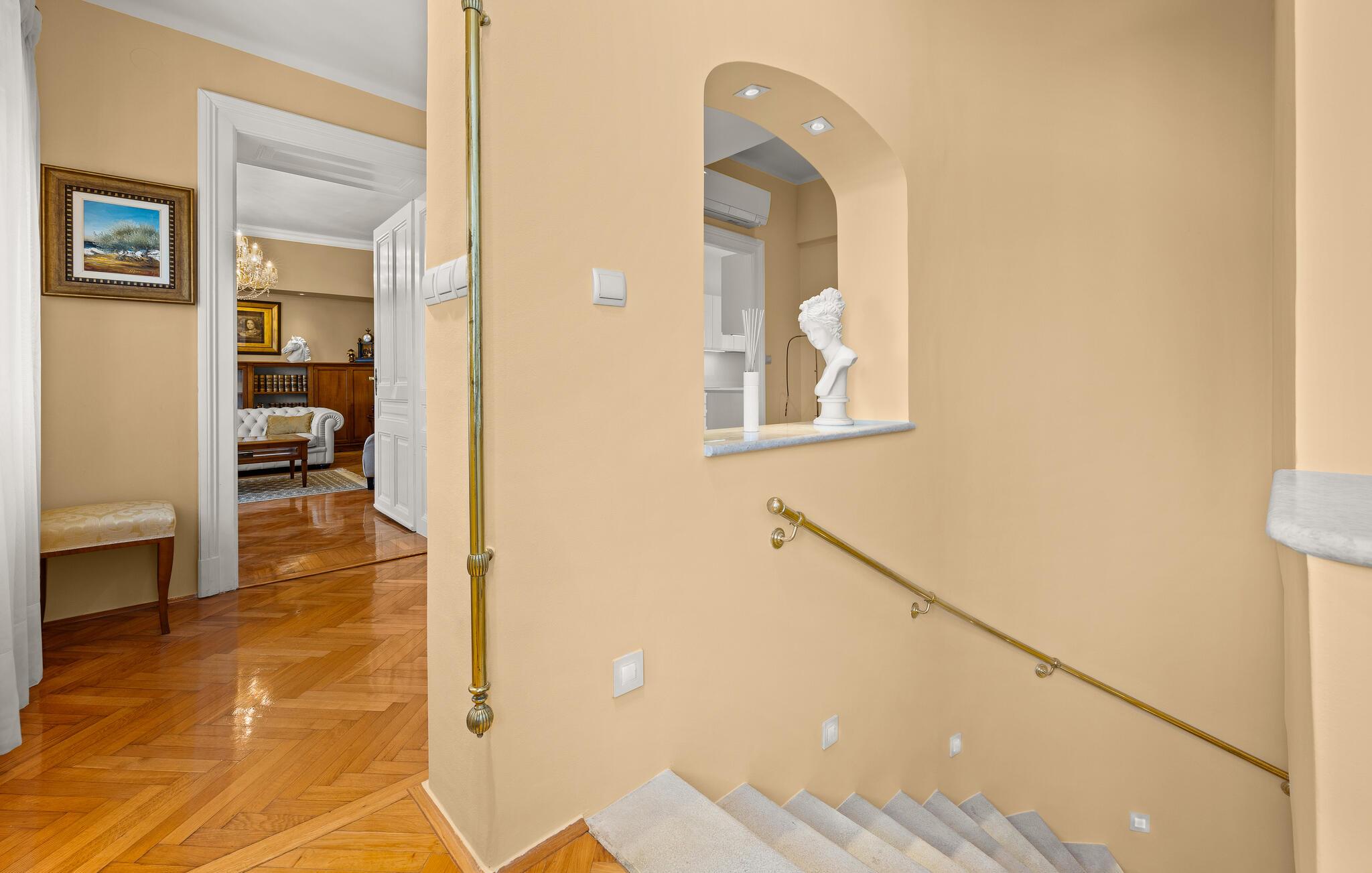 Diese majestätische Villa verspricht einen Urlaub vom Feinsten. Edles Parkett, stilvolles Mobiliar und elegante Kronleuchter schaffen eine ruhige Atmosphäre, in der sofort abschalten und neue Energie tanken können. Liebevolle Details geben dem Ganzen zusätzlich eine persönliche Note. Lehnen Sie sich entspannt auf der bequemen Sofalandschaft zurück, genießen Sie ein Glas Wein und geben Sie sich ganz dem erholsamen Urlaubsgefühl hin.