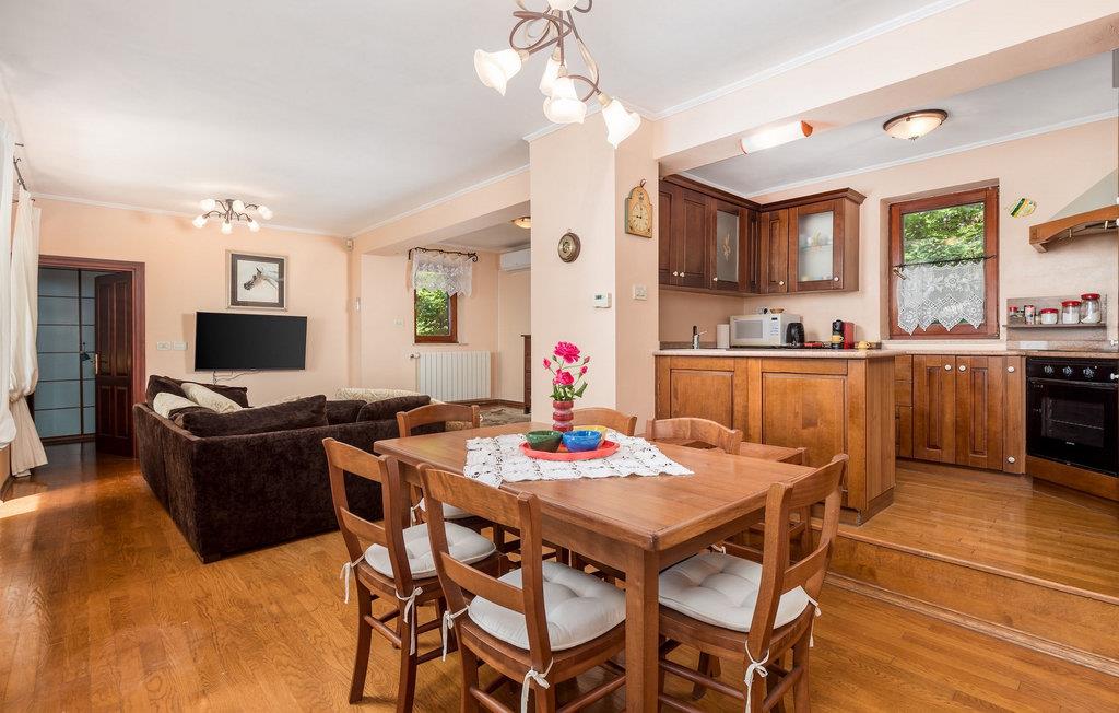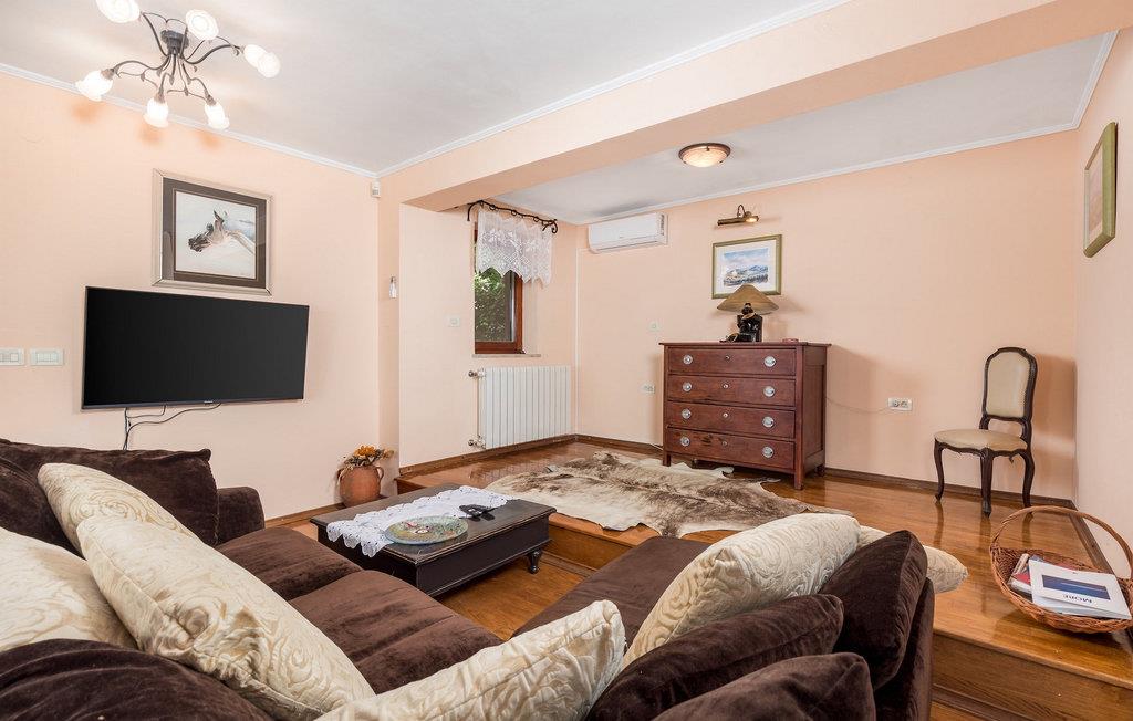 Villa Milli liegt in Veprinac, über der Perle der Adria, Opatija. Diese charmante Villa empfängt Sie mit einer romantischen Terrasse mit Hintergrund aus Natur und wunderschönen Blumen, die vom Balkon hängen. Hier können Sie eine der 8 Strandliegen nutzen, um sich unter freiem Himmel zu sonnen und den vorbeiziehenden Wolken zuzusehen, während Ihre Kinder in den erfrischenden Privatpool springen. Der Balkon umgibt den Pool an drei Seiten und bietet Schatten neben dem offenen Himmel. Im Hof ??finden Sie einen Holzkohlegrill für ein gemütliches Familiengrillen. Komplett mit einem Steintisch und einer Sitzbank, umgeben von Pflanzen, für einen perfekten Rückzugsort aus der Großstadt. Durch die Holztür mit schönem dekorativen Glasrahmen und ein paar Stufen hinauf erwartet Sie das Wohnzimmer. Auf der gleichen Etage befindet sich die voll ausgestattete Küche mit einem Esstisch für bis zu 10 Personen. Die Villa verfügt außerdem über eine Sauna, um alle Alltagssorgen dahinschmelzen zu lassen. Das Doppelzimmer mit Badezimmer und ein Zustellbett bieten gemütlichen Schlaf. Für die sportliche Familie gibt es einen Heimtrainer, Gewichte oder ein Springseil, um im Urlaub fit zu bleiben. Eine Etage höher bietet Ihnen die zweite Küche den Komfort, sich Ihre frische Tasse Kaffee direkt aus dem Bett zu holen und sich für einen ruhigen Morgen auf den Balkon zu begeben. Dank des zweiten Wohnzimmers können die Kinder auf einer Etage einen spaßigen Filmabend verbringen, während die Erwachsenen auf der anderen Etage Ihre Zeit für sich genießen und entspannen können. Schließlich laden zwei weitere entzückende Doppelzimmer mit jeweils eigenem Badezimmer nach langen Tagen voller Spaß in der Sonne zu angenehmen Nächten mit tiefem, erholsamem Schlaf ein. Besuchen Sie die Villa Milli für einen erholsamen Urlaub in einem schönen, authentischen Haus, ideal für Familien. Villa Milli liegt in der wunderschönen Bergstadt Veprinac, die über ein reiches Erbe und wichtige kulturelle und historische Denkmäler verfügt. Am bemerkenswertesten ist die Markuskirche mit ihrem berühmten Glockenturm. Die Villa liegt in unmittelbarer Nähe der „Perle der Adria“, der Stadt Opatija. Für einen entspannten Spaziergang entlang der Küste müssen Sie unbedingt die Promenade Lungomare besuchen. Sie bietet einen atemberaubenden Blick auf die Stadt und die umliegenden Inseln. Dies ist der perfekte Ort, um die natürlichen Sehenswürdigkeiten von Opatija bei einem Spaziergang mit leckerem Eis in der Hand, zu erkunden. Gibt es ein besseres Touristenziel als das Gebäude, das den Beginn der touristischen Epoche in der Geschichte von Opatija markierte? Die Villa Angiolina aus dem 19. Jahrhundert liegt inmitten eines Gartens mit exotischen Pflanzen und beherbergt das Kroatische Tourismusmuseum. Es sammelt, untersucht und zeigt Objekte und Geschichten, die die reiche Geschichte des Tourismus in Kroatien repräsentieren. Um die Schönheit und Geschichte Kroatiens an einem atemberaubenden Ort zu erleben, ist Opatija für einen bemerkenswerten Familienurlaub genau das Richtige.
