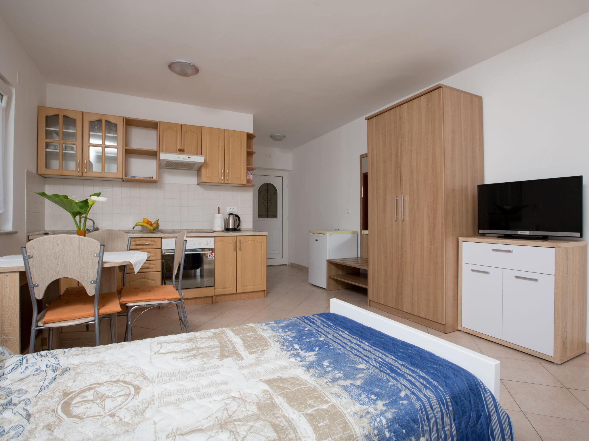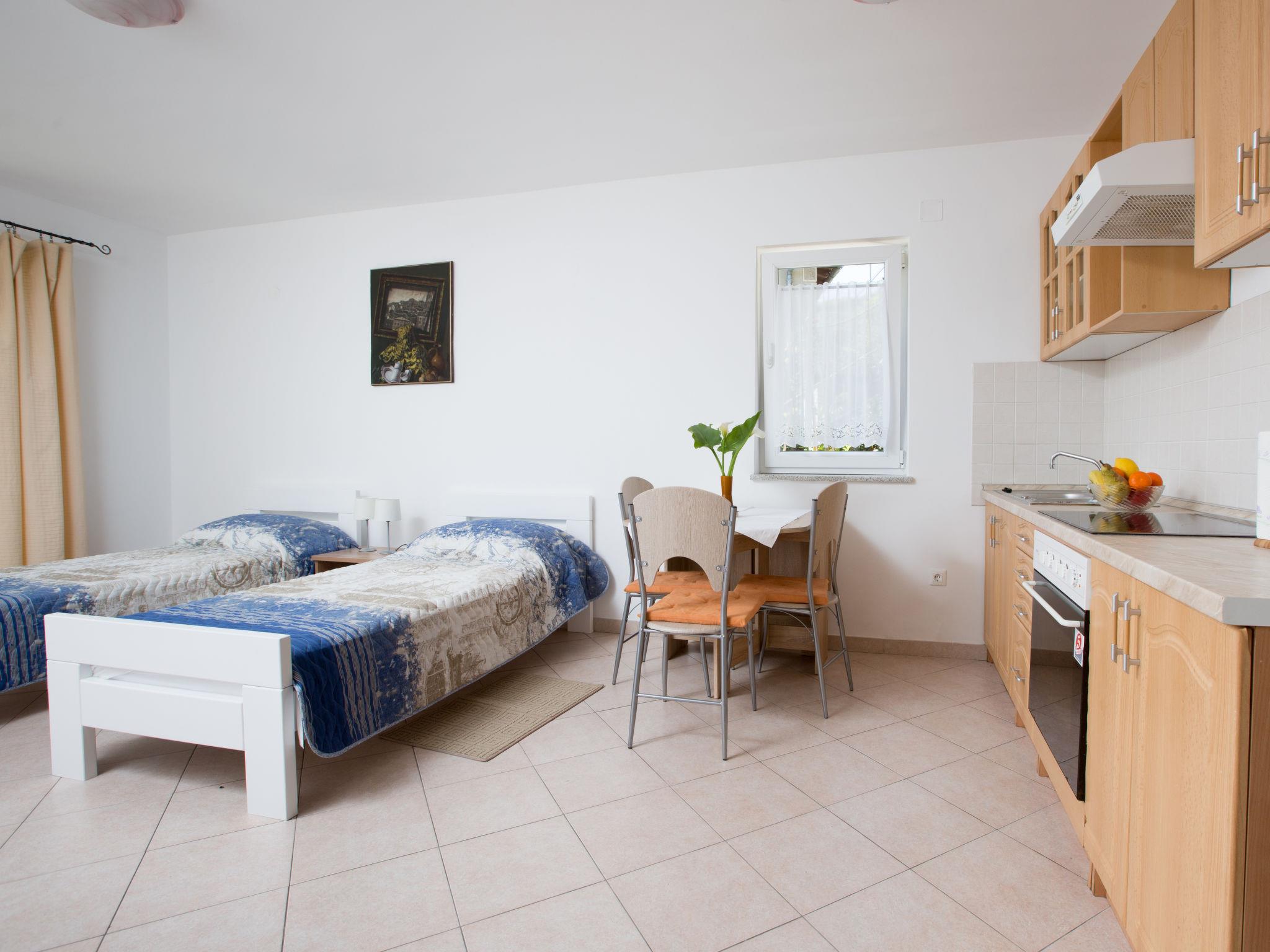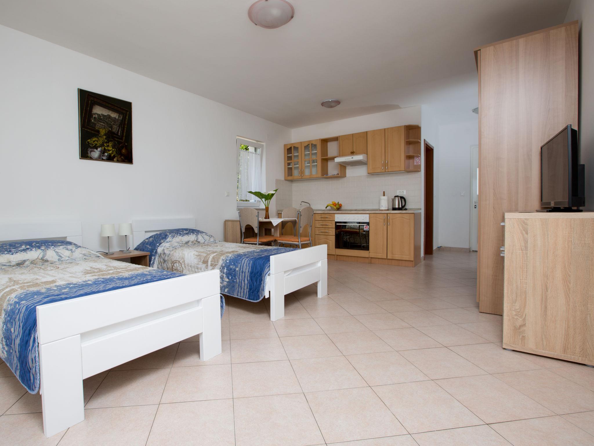 1-Zimmer-Wohnung 30 m2 im 1. Stock. Studio mit 2 Betten (90 cm, Länge 200 cm), Sat-TV und Klimaanlage. Ausgang zum Balkon. Offene Küche (Backofen, 4 Glaskeramikplatten, Toaster, Wasserkocher, elektrische Kaffeemaschine). Dusche/WC. Warmluftheizung. Balkon 14 m2. Balkonmöbel. Sicht auf das Meer. Zur Verfügung: Waschmaschine, Haartrockner. Internet (Wireless LAN, gratis). Bitte beachten: Nichtraucher-Haus. Eigener Eingang.