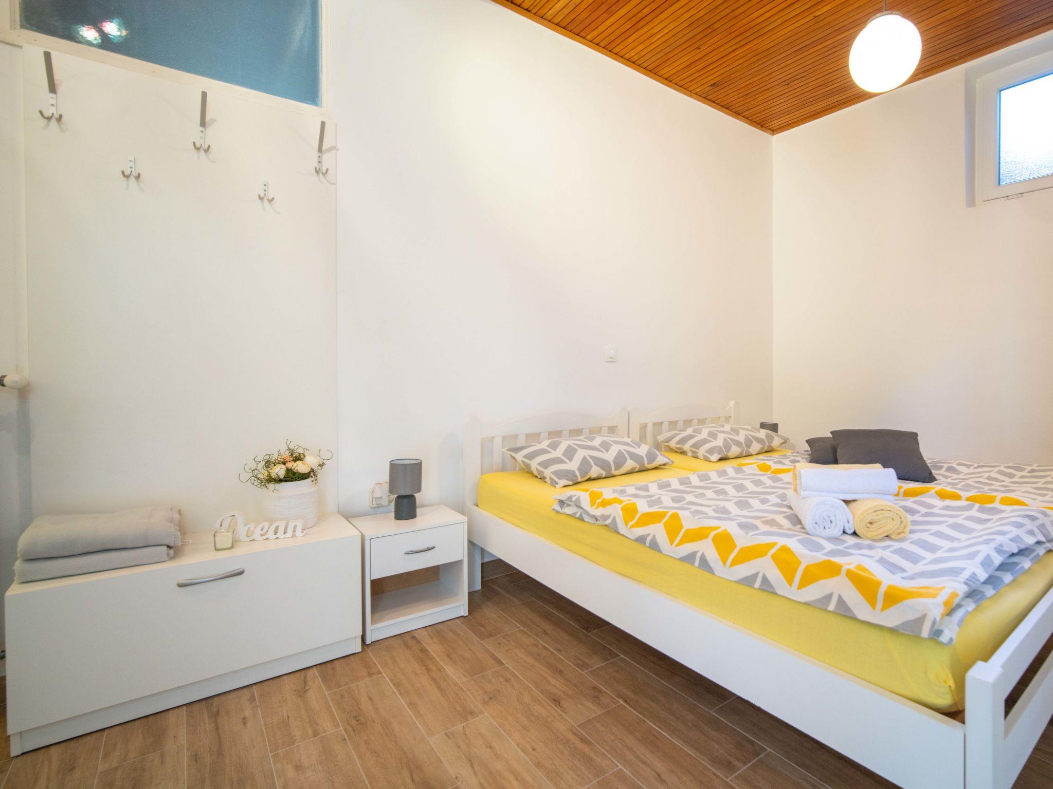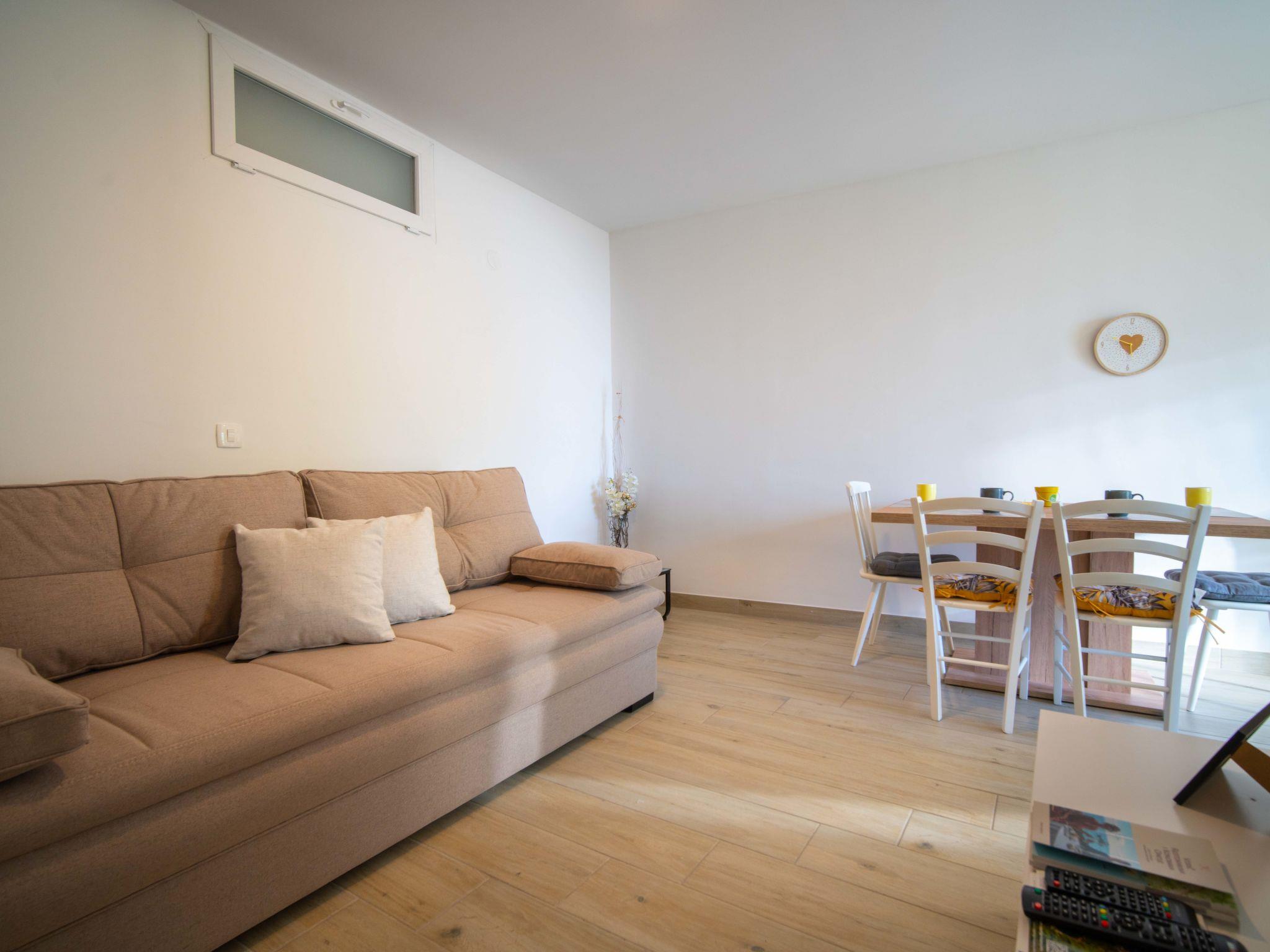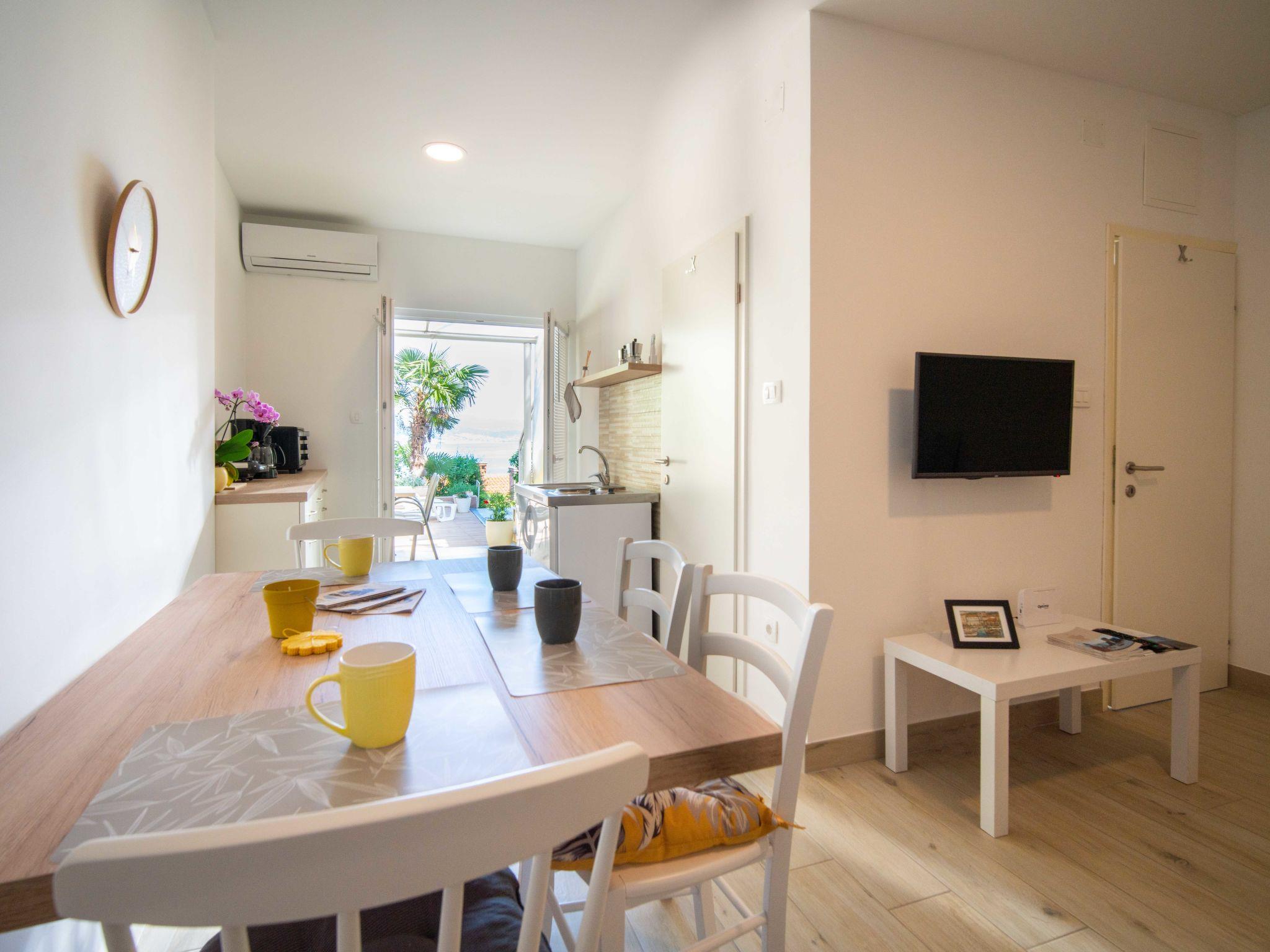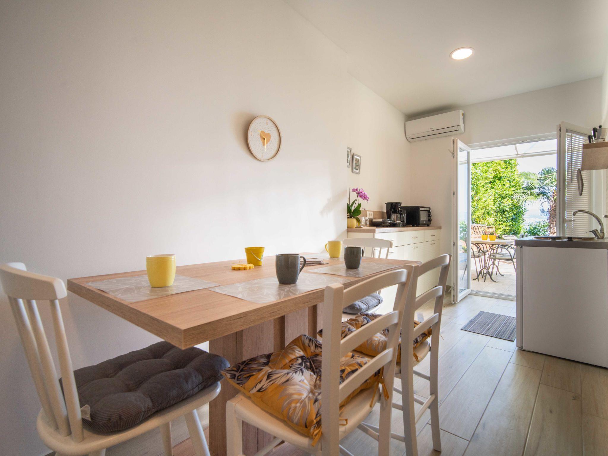 2-Zimmer-Doppelhaushälfte 25 m2, Südlage. Schön und modern eingerichtet: Wohn-/Esszimmer mit Sat-TV (Flachbildschirm), Klimaanlage. Ausgang zur Terrasse. 1 Zimmer mit 2 Betten (90 cm, Länge 200 cm), Dusche/WC. Offene Küche (2 Kochplatten, elektrische Kaffeemaschine) mit Esstisch. Dusche/WC. Keine Heizmöglichkeit. Terrasse 32 m2. Terrassenmöbel, Liegestühle. Sicht auf das Meer. Zur Verfügung: Babybett. Internet (WLAN, gratis). Verfügbar: Heissluftofen in der offenen Küche. Hochplatziertes Fenster im Wohn-/Essbereich und im Schlafzimmer.