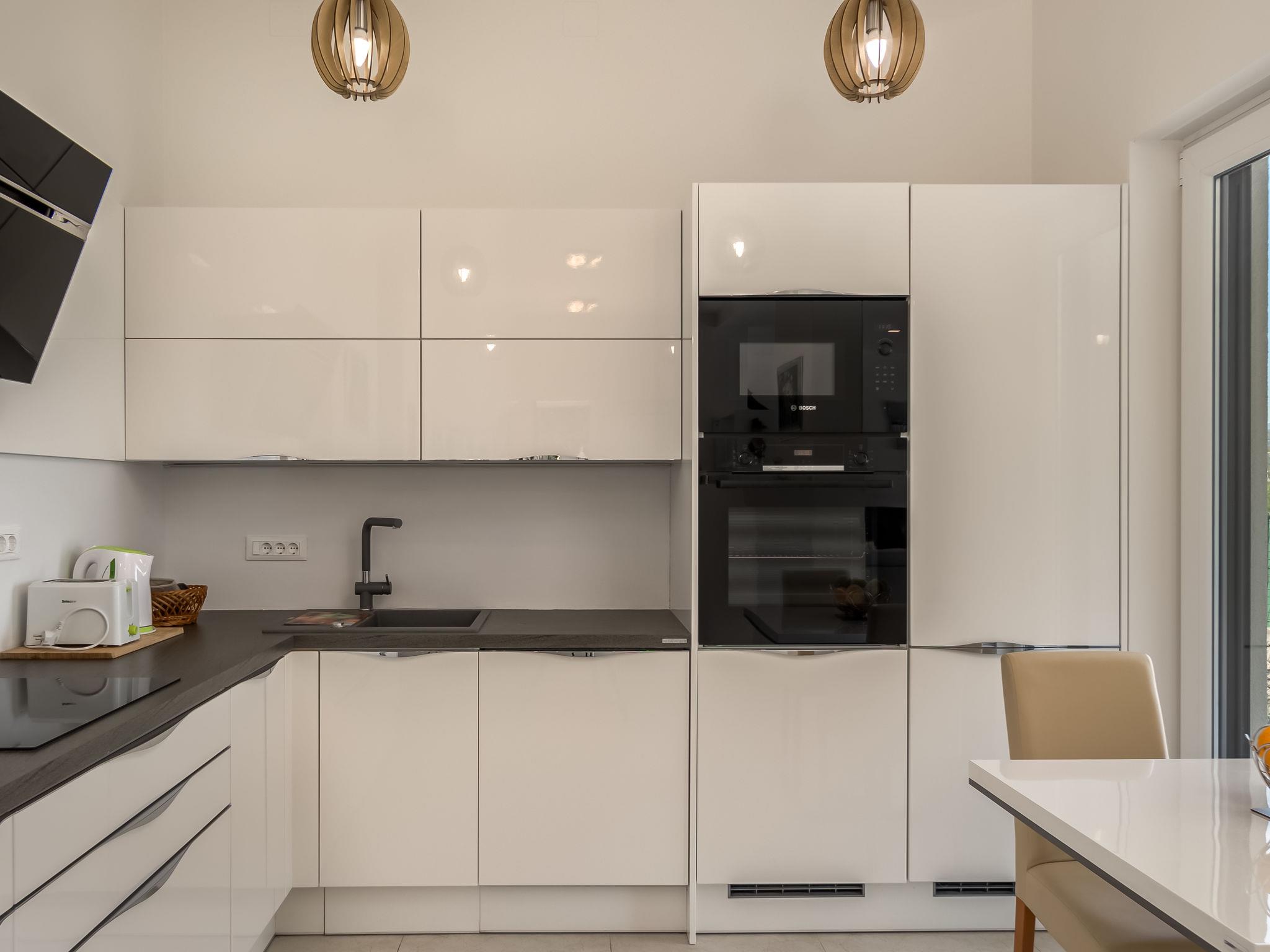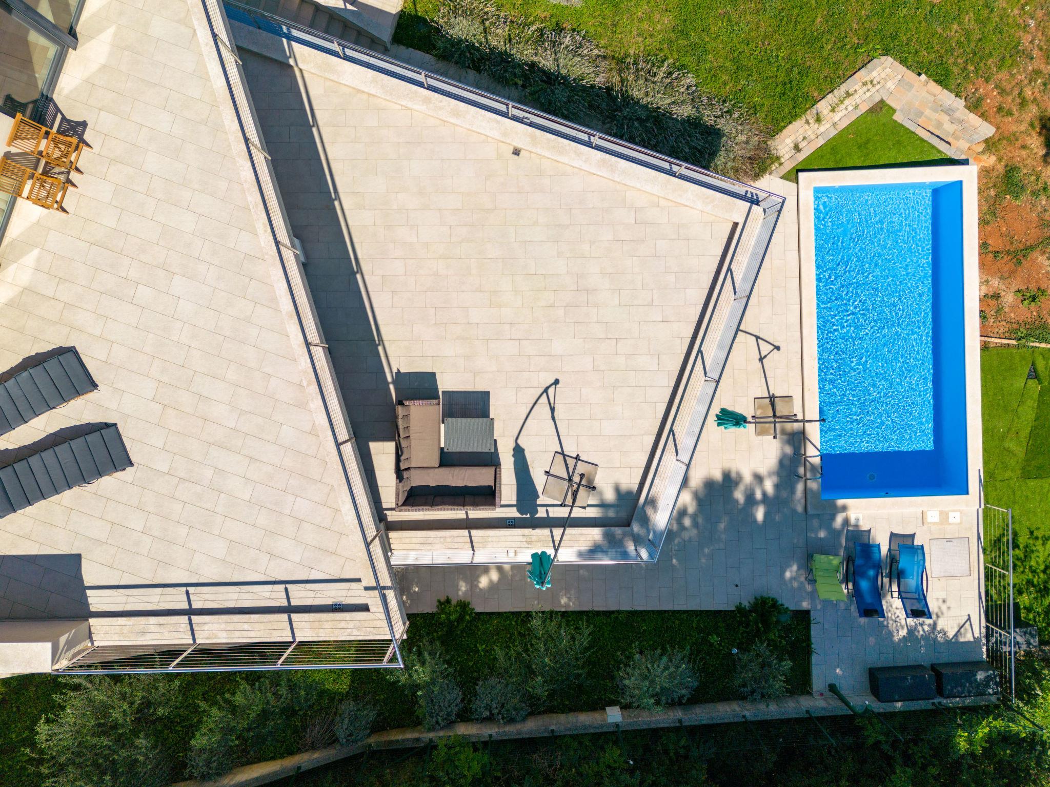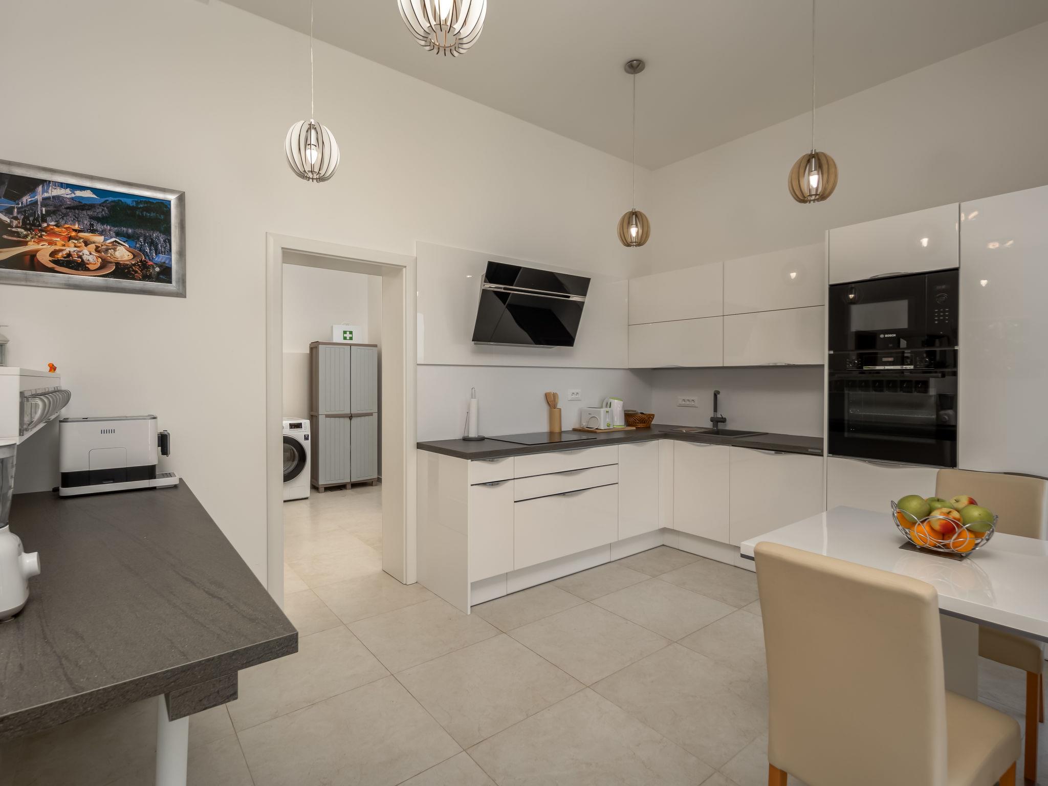 6-Zimmer-Villa 196 m2 auf 3 Stockwerken. Schön und modern eingerichtet: Wohn-/Esszimmer 65 m2 mit Sat-TV (Flachbildschirm). Ausgang zur Terrasse. Offene Küche (Backofen, Geschirrspüler, 4 Induktionskochplatten, Wasserkocher, Tiefkühler, elektrische Kaffeemaschine). Dusche/WC. Unteres Geschoss: (Aussentreppe) Wohn-/Esszimmer mit 1 Doppeldiwanbett (140 cm, Länge 200 cm), Sat-TV (Flachbildschirm). Ausgang zur Terrasse, zum Schwimmbad. 1 Zimmer mit 1 franz. Bett (180 cm, Länge 200 cm). Ausgang zur Terrasse. Offene Küche (2 Induktionskochplatten, Wasserkocher). Dusche/WC. Obergeschoss: 1 Zimmer mit 1 franz. Bett (180 cm, Länge 200 cm), Bad/Bidet/WC und Sat-TV (Flachbildschirm). Ausgang zur Terrasse. 2 Zimmer, jedes Zimmer mit 2 Betten (90 cm, Länge 200 cm), Sat-TV (Flachbildschirm). Ausgang zur Terrasse. Dusche/WC. Heizung (extra). Terrasse 65 m2, Terrasse 39 m2. Terrassenmöbel, Gartengrill (mobil), Liegestühle, Abstellkammer. Herrliche Sicht auf das Meer und die Bucht. Zur Verfügung: Waschmaschine, Bügeleisen. Internet (WLAN, gratis). Maximal 1 kleines Haustier/Hund erlaubt.