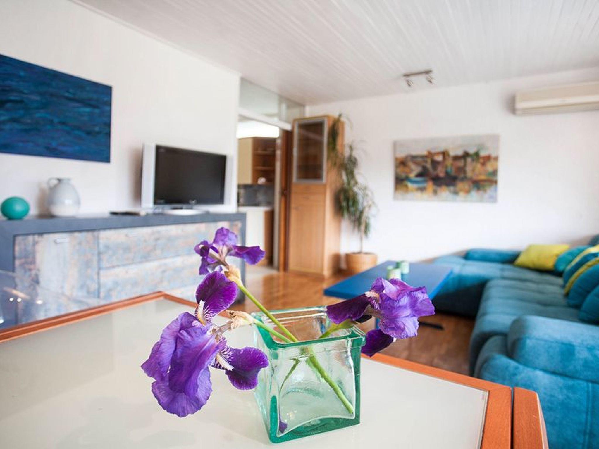 Die Wohnung befindet sich im ersten Stock der Villa und bietet Platz für fünf Personen. Sie verfügt über eine separate und voll ausgestattete Küche mit Gas- und Elektroherd, Backofen, Mikrowelle, Kühlschrank mit Gefrierfach und Geschirrspüler. Von der Küche aus gelangt man auf die Gartenterrasse. Es gibt zwei Schlafzimmer mit einem bequemen Doppelbett, zwei Einzelbetten und einem Schlafsofa. Beide Schlafzimmer haben auch einen Kleiderschrank und eine Kommode. Das Wohn- und Esszimmer hat ein großes Sofa und einen großen LCD-Fernseher mit Satellitenprogrammen im Wohnbereich und einen großen Esstisch mit Stühlen im Essbereich. Es gibt auch eine Klimaanlage und Zentralheizung für den Winter. Das Badezimmer bietet eine Dusche, ein Bidet und eine Toilette. Im Flur befindet sich ein Kleiderschrank. Das Wohnzimmer ist nach Süden ausgerichtet und bietet einen Blick auf den Garten der Villa, den jahrhundertealten Park und das blaue Meer.