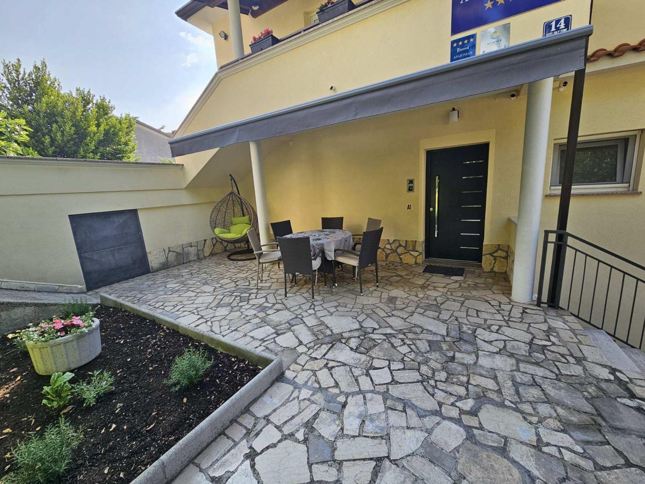 Umgebung des Objekts (Ordentlich), Hof (100m2, Wird mit einem anderen Objekt mitbenutzt, Kinderbereich, Sitzbereich), Parkplatz (Anzahl der Parkplätze: 1, Entfernung vom Objekt: im Hof), Pool: gemeinsam, Dimensionen: 7m x 3.5m x 1.45m, Wassertyp: Süßwasser, Grill: gemeinsam, WiFi Internet, Föhn, Bügeleisen, Bügelbrett, Sonnenschirm, Liegestühle