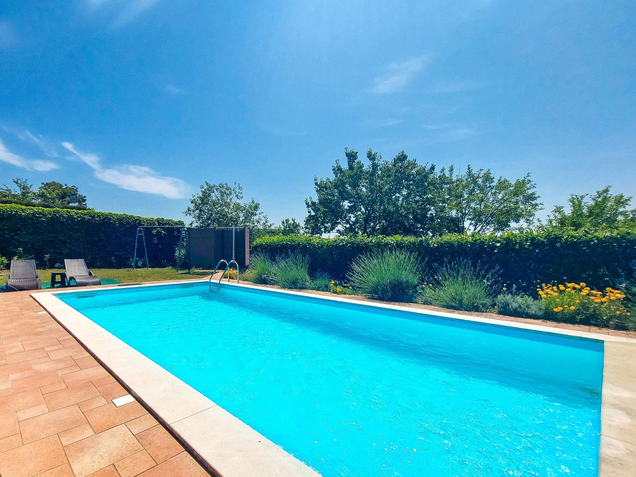 4-Zimmer-Wohnung 130 m2 im 1. Stock. Geräumig, komfortabel und geschmackvoll eingerichtet: Wohn-/Esszimmer 40 m2 mit TV und Klimaanlage. Ausgang zum Balkon. 1 Zimmer mit 1 Doppelbett (2 x 90 cm, Länge 200 cm). Ausgang zum Balkon. 1 Zimmer mit 2 Betten (90 cm, Länge 200 cm). 1 Zimmer mit 1 Doppelbett (2 x 90 cm, Länge 200 cm), Dusche/WC. Ausgang zum Balkon. Offene Küche (Backofen, Geschirrspüler, 4 Glaskeramikplatten, Toaster, Wasserkocher, Tiefkühler, elektrische Kaffeemaschine). Bad/WC, Dusche/WC. Warmluftheizung. Balkon 4 m2, Balkon 10 m2. Balkonmöbel. Sicht auf das Schwimmbad, den Garten und die Landschaft. Zur Verfügung: Internet (WLAN, gratis). Bitte beachten: geeignet für Familien. Nichtraucher-Haus. Feuerlöscher.