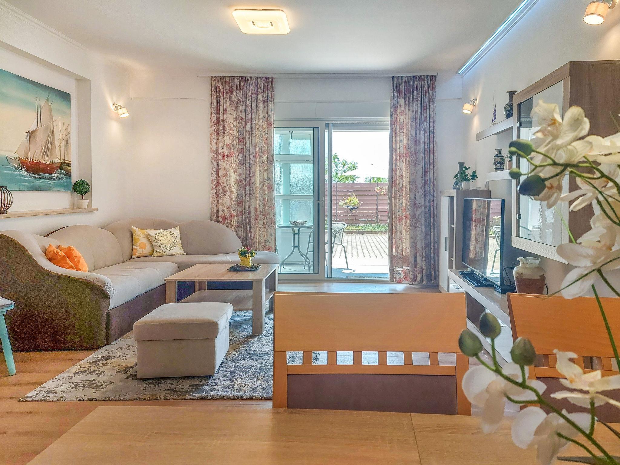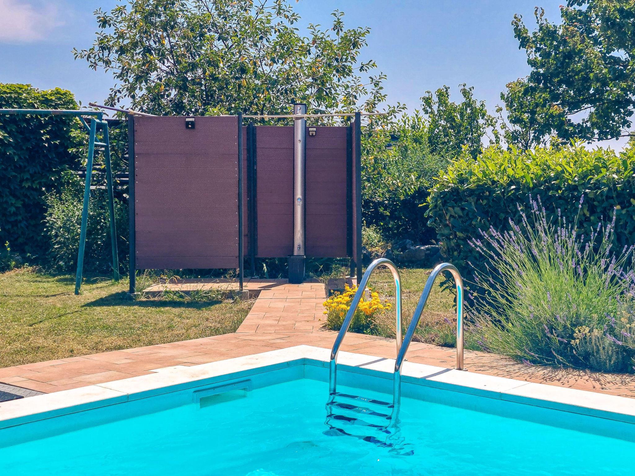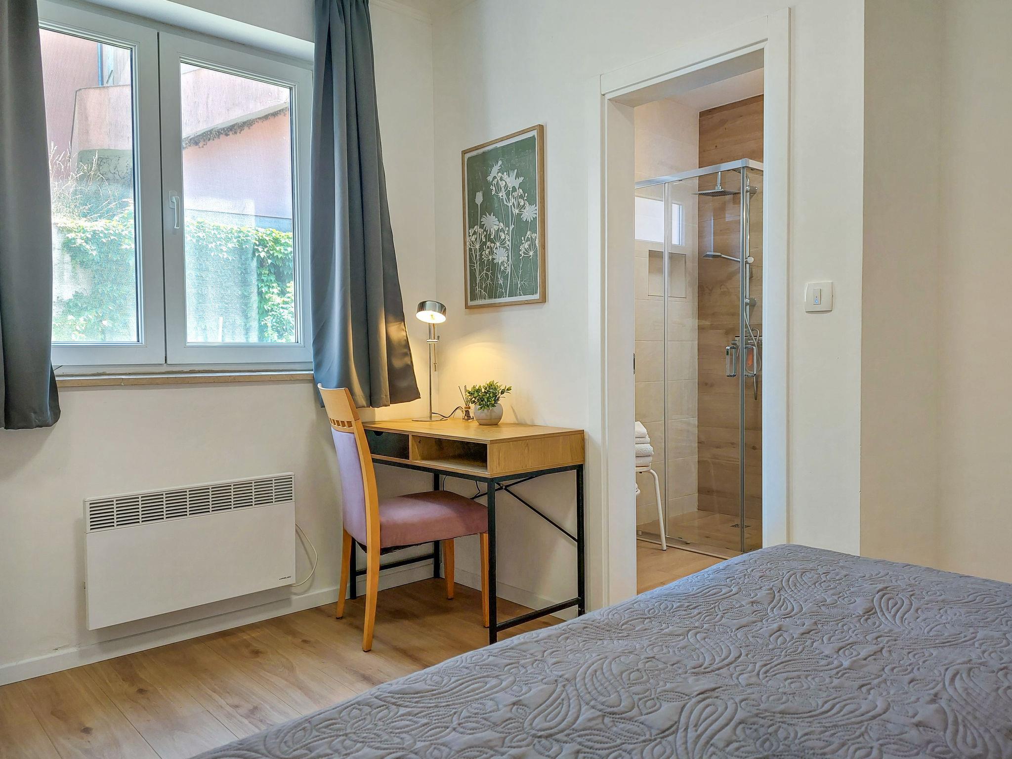 2-Zimmer-Wohnung 40 m2, im Erdgeschoss. Komfortabel eingerichtet: Wohn-/Esszimmer mit Sat-TV und Klimaanlage. Ausgang zum Garten, zum Schwimmbad. 1 Zimmer mit 1 franz. Bett (180 cm, Länge 200 cm), Dusche/WC. Offene Küche (Backofen, Geschirrspüler, 4 Glaskeramikplatten, Toaster, Wasserkocher, Tiefkühler, elektrische Kaffeemaschine). Warmluftheizung. Kleine Terrasse 5 m2. Terrassenmöbel. Zur Verfügung: Internet (WLAN, gratis). Bitte beachten: Nichtraucher-Haus.