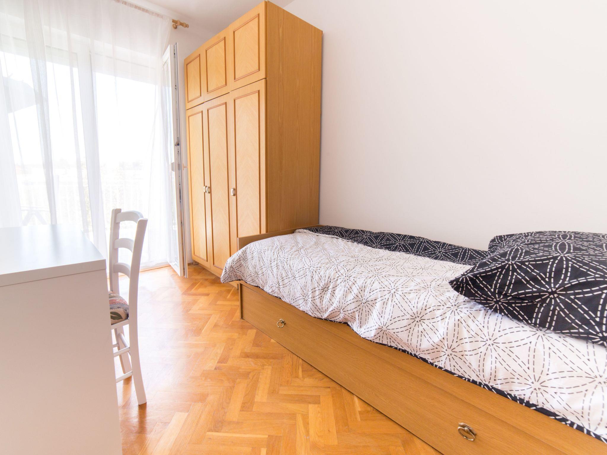 In dem dreistöckigen Gebäude gibt es insgesamt sieben Ferienwohnungen. Diese Wohnung mit einer Wohnfläche von 55m2 befindet sich im ersten Stock. Sie besteht aus einer geräumigen Küche und einem Wohnzimmer, zwei Schlafzimmern, einem Badezimmer und einem großen Balkon. Die Küche ist voll ausgestattet, das Wohnzimmer verfügt über ein Schlafsofa (Doppelbett für zwei Personen), Sat-TV und Klimaanlage. Ein Schlafzimmer hat ein Doppelbett (180 × 200), einen Kleiderschrank, einen Schreibtisch und ist ebenfalls klimatisiert. Das zweite Schlafzimmer hat ein Bett für eine Person, Kleiderschrank und Schreibtisch. Kostenloses WiFi ist in der ganzen Wohnung verfügbar.