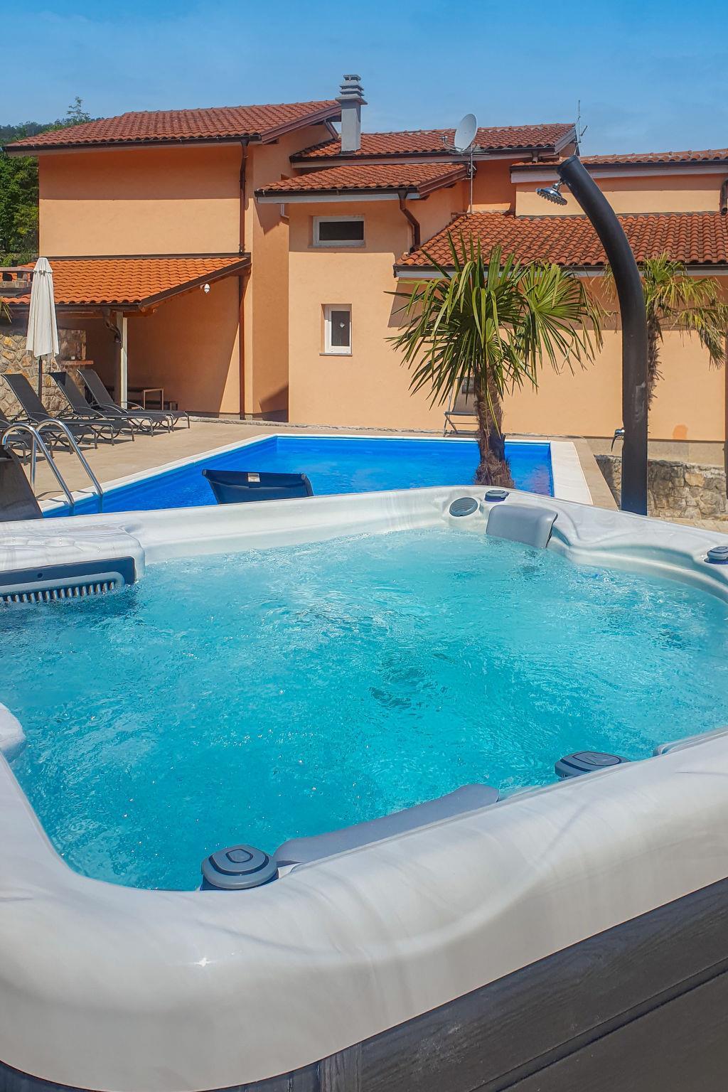 Mihelici 6 km von Opatija: Zweifamilienhaus "Matej", auf 2 Stockwerken. Im Weiler Mihelici, 3.5 km vom Zentrum von Matulji, 5.5 km vom Zentrum von Opatija, ruhige, sonnige, erhöhte Lage im Villenviertel, 5.5 km vom Meer. Zur Alleinbenutzung: Grundstück 700 m2 (eingezäunt) mit Rasen und Blumen, Schwimmbad eckig, beheizt (7 x 4 m, 150 cm tief, saisonale Verfügbarkeit: 15.Mai. - 15.Okt.) mit Innentreppe. Aussendusche, Poolhaus, Terrasse, Gartenmöbel, Grill, Feuerstelle. Im Hause: Internetzugang, Sprudelbad (alles inkl.), Tischfussball, Zentralheizung, Klimaanlage. Parkplatz (für 3 Autos) beim Haus auf dem Grundstück. Einkaufsgeschäft 800 m, Supermarkt 3 km, Restaurant 800 m, Bar 750 m, Bushaltestelle 700 m, Kieselstrand 5.5 km, betonierter Strand 5.5 km. Jugendgruppen nur auf Anfrage.