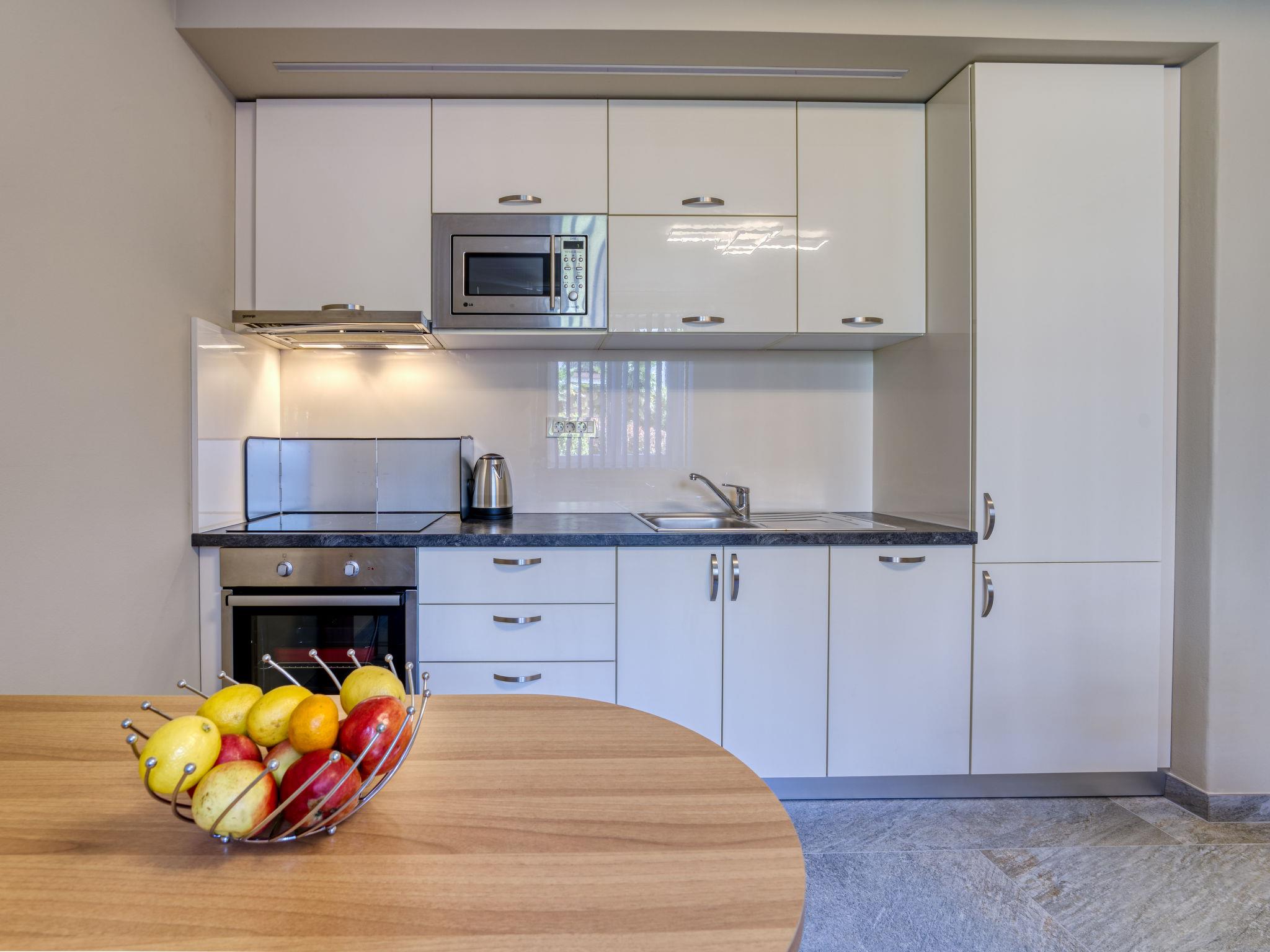 3-Zimmer-Wohnung 98 m2 im 2. Stock. Wohnzimmer 32 m2 mit Kabel-TV und Klimaanlage. Ausgang zur Terrasse. 2 Zimmer, jedes Zimmer mit 1 franz. Bett (140 cm, Länge 190 cm). Küche (Backofen, 4 Glaskeramikplatten, Wasserkocher, Mikrowelle, Tiefkühler, elektrische Kaffeemaschine) mit Esstisch. Bad/Dusche/WC. Terrasse 7 m2, überdacht. Terrassenmöbel. Sicht auf die Landschaft. Zur Verfügung: Babybett, Haartrockner. Internet (Wireless LAN, gratis).