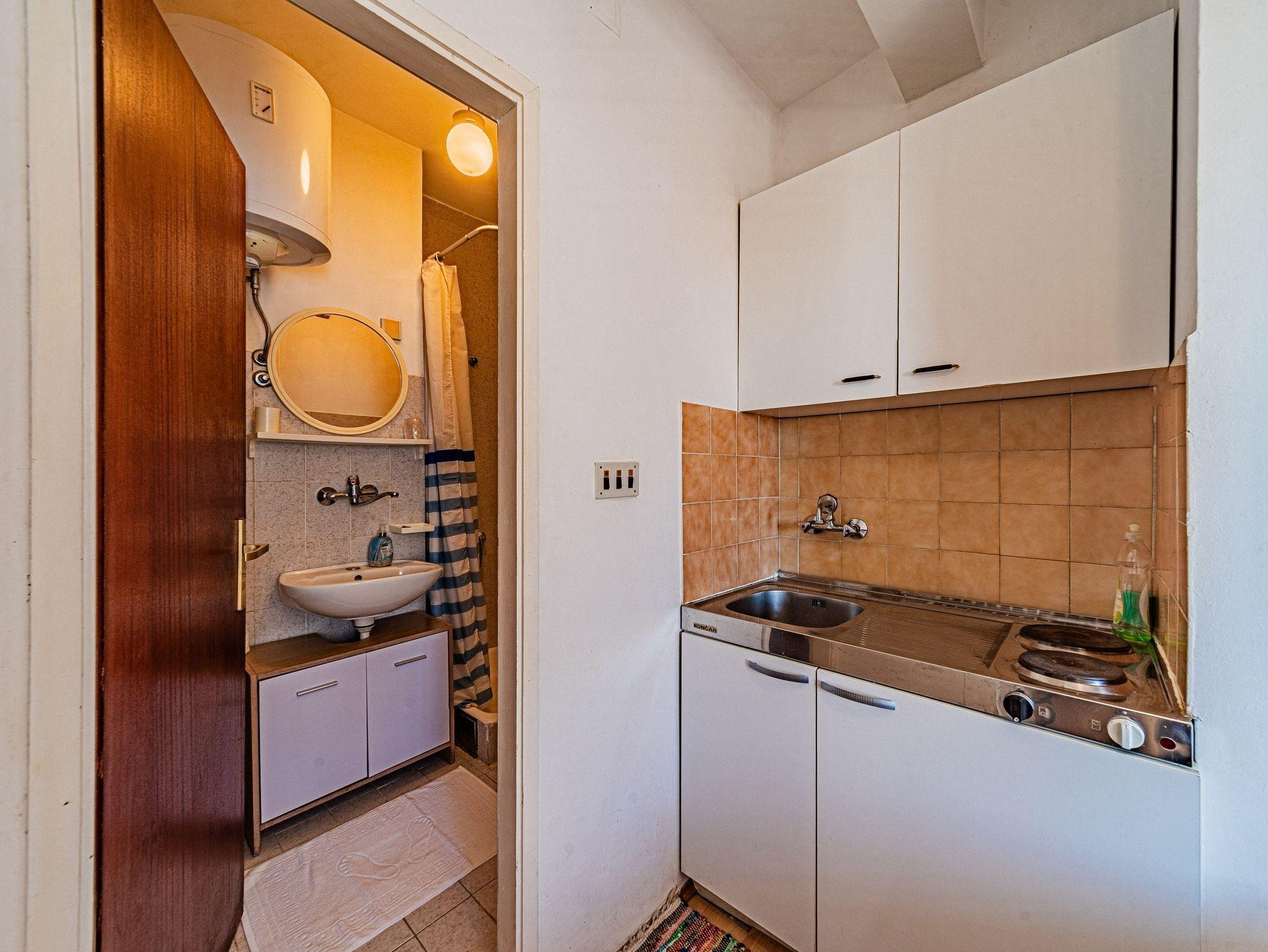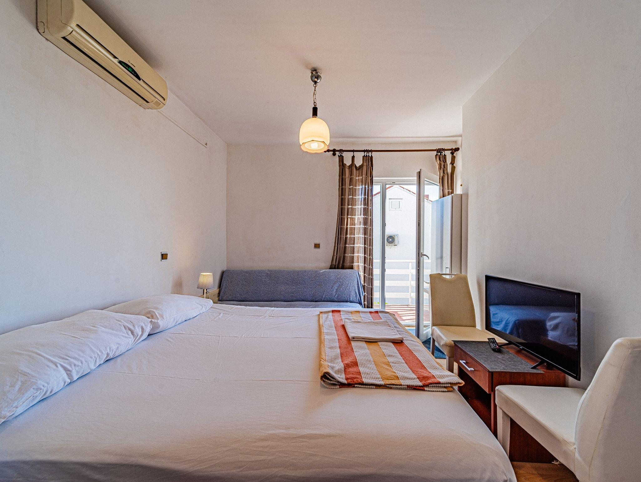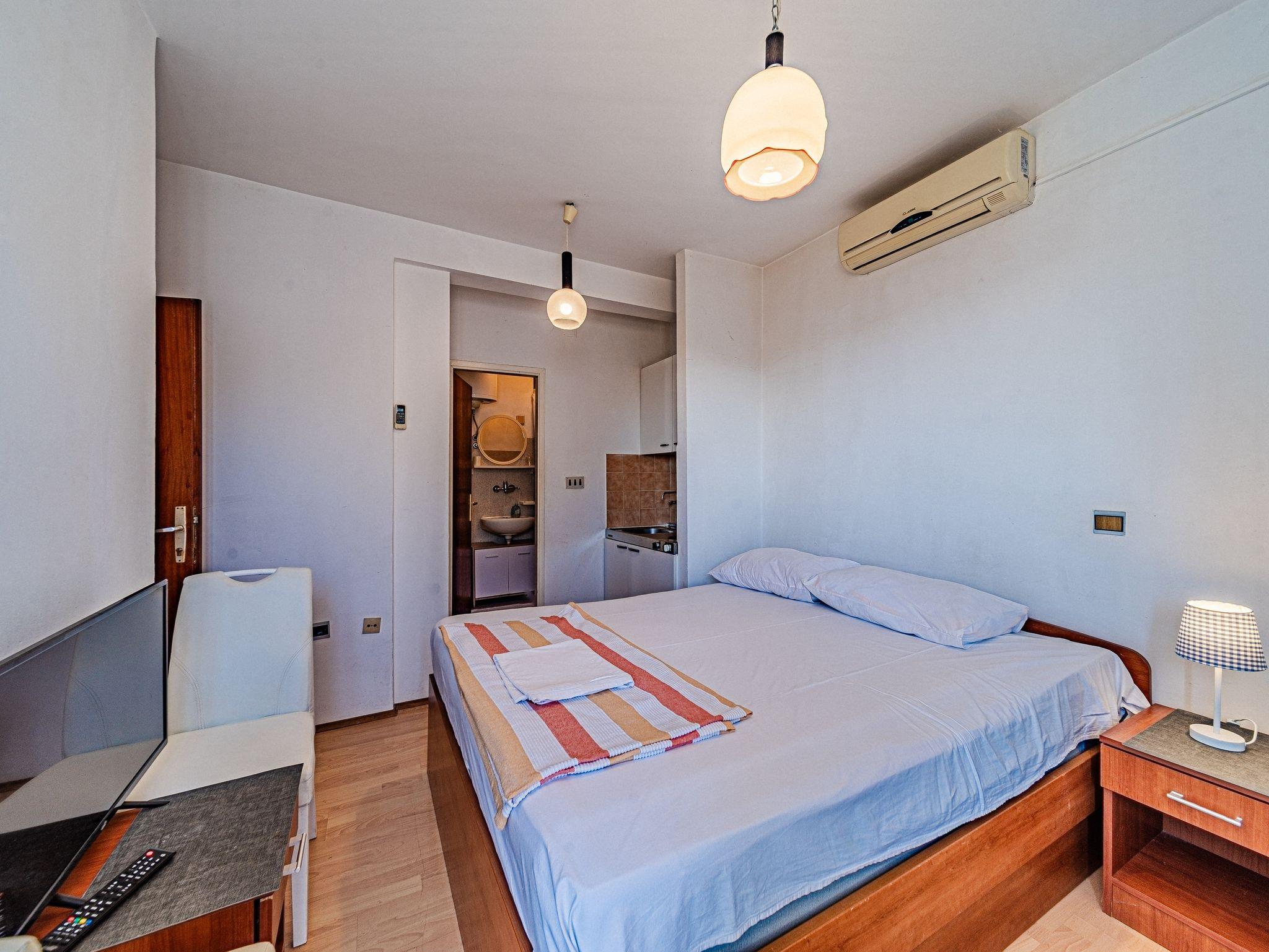 Studio bietet Platz für 2 Gäste. Die Betten sind in Schlafzimmern, die es 1 gibt, innerhalb einer Gesamtfläche von 11m2, angeordnet. Die Gäste haben einen eigenen Balkon zur Verfügung, auf der sie in warmen Sommernächten genießen können. Das Studio-Apartment bietet Meerblick. IM PREIS INBEGRIFFEN: Kurtaxe, Endreinigung, Klimatisierung, Parkplatz, Internet. VERBINDLICHE ZUSÄTZLICHE KOSTEN: Aufzahlung für Kurzaufenthalte (prozentualer Zuschlag pro Nächtigungsanzahl: 30% - 1, 20% - 2, 10% - 3). Die Verfügbarkeit zusätzlicher Dienstleistungen in Ihrem reservierten Termin und die Preise derselben (falls nicht aufgeführt) müssen im Voraus überprüft werden. Zusätzliche Dienstleistungen die in der Zahlungsaufforderung nicht aufgeführt sind werden direkt beim Vermieter bezahlt, angenommen der Gast nutzt auch diese.