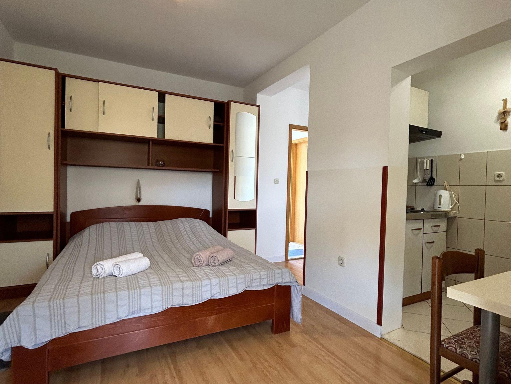Studio bietet Platz für 2 Gäste. Die Betten sind in Schlafzimmern, die es 1 gibt, innerhalb einer Gesamtfläche von 19m2, angeordnet. Die Gäste haben eine eigene Terrasse zur Verfügung, auf der sie in warmen Sommernächten genießen können. Es ist erlaubt, Speisen auf dem Gemeinschafts-Grill vorzubereiten. In der Unterkunftseinheit besteht die Möglichkeit des Mitbringens von Haustieren, und die Dienstleistung ist im Preis der Unterkunft enthalten. IM PREIS INBEGRIFFEN: Kurtaxe, Endreinigung, Klimatisierung, Parkplatz, Internet, Haustiere, Föhn. Die Verfügbarkeit zusätzlicher Dienstleistungen in Ihrem reservierten Termin und die Preise derselben (falls nicht aufgeführt) müssen im Voraus überprüft werden. Zusätzliche Dienstleistungen die in der Zahlungsaufforderung nicht aufgeführt sind werden direkt beim Vermieter bezahlt, angenommen der Gast nutzt auch diese. Ermäßigung auf den Grundpreis: Gratistag 21=19 (bei einem Aufenthalt von 21 Tagen oder mehr erhalten Sie 2 Gratistage für den Aufenthalt bis 31.12.26).
