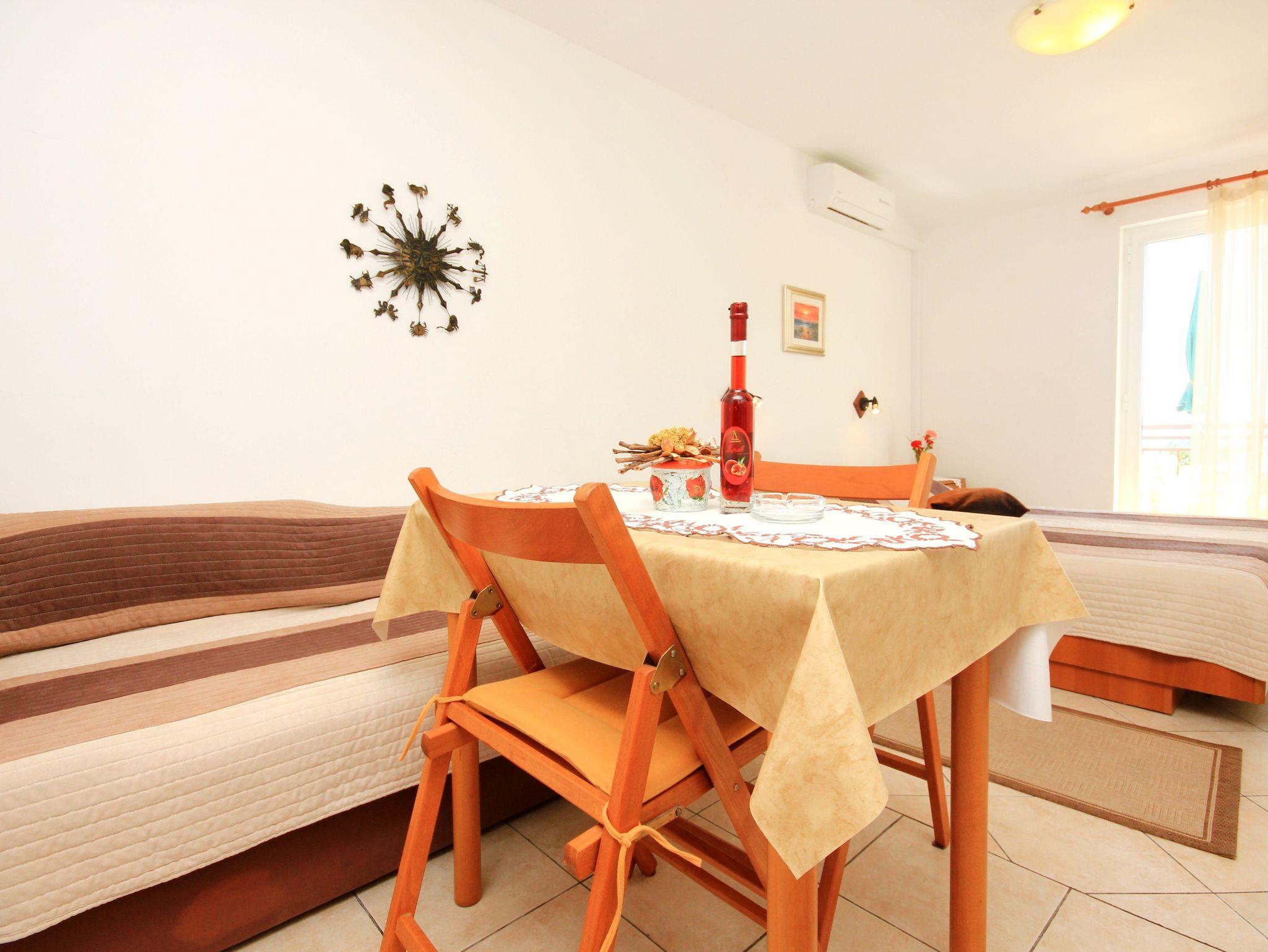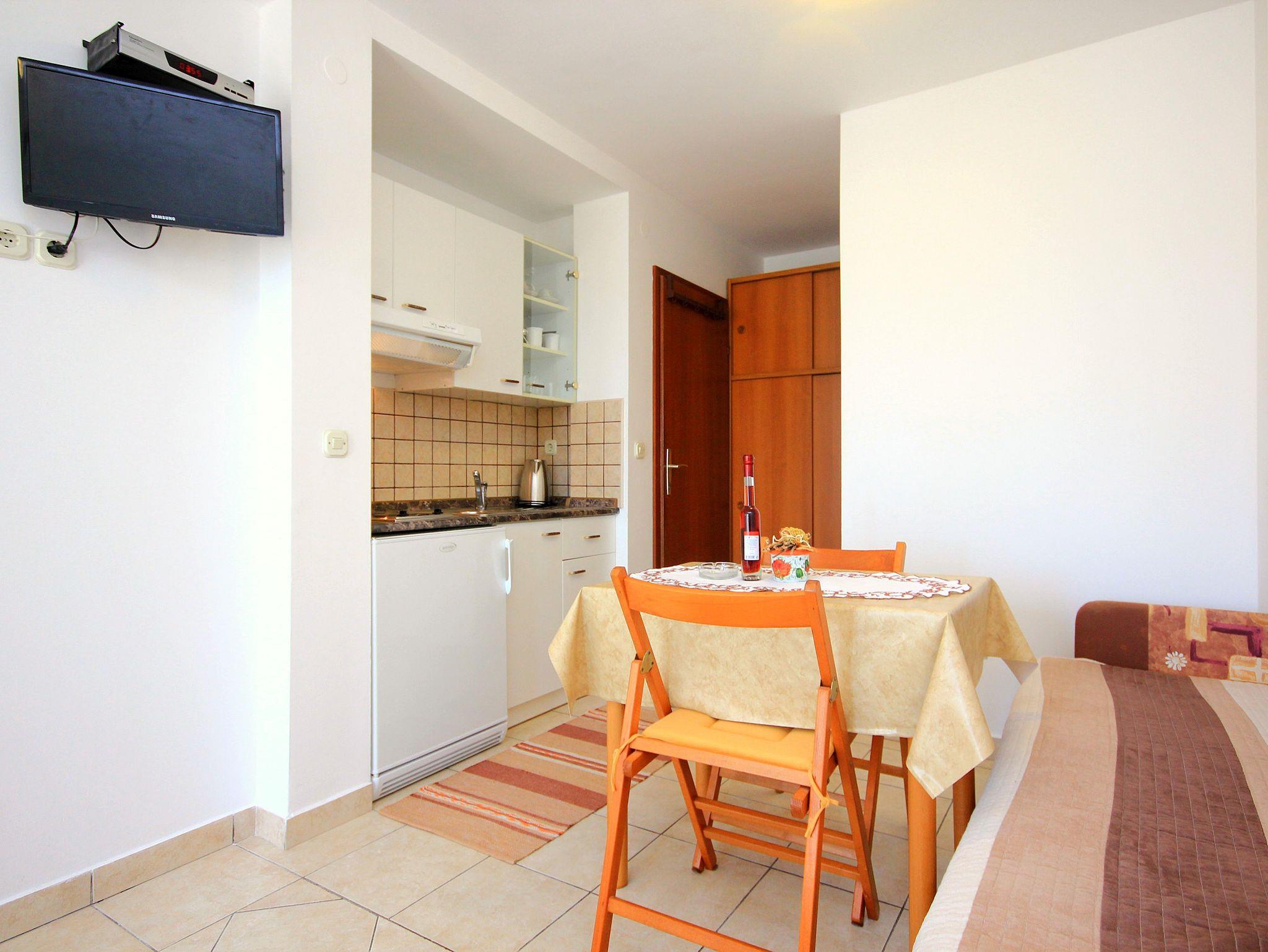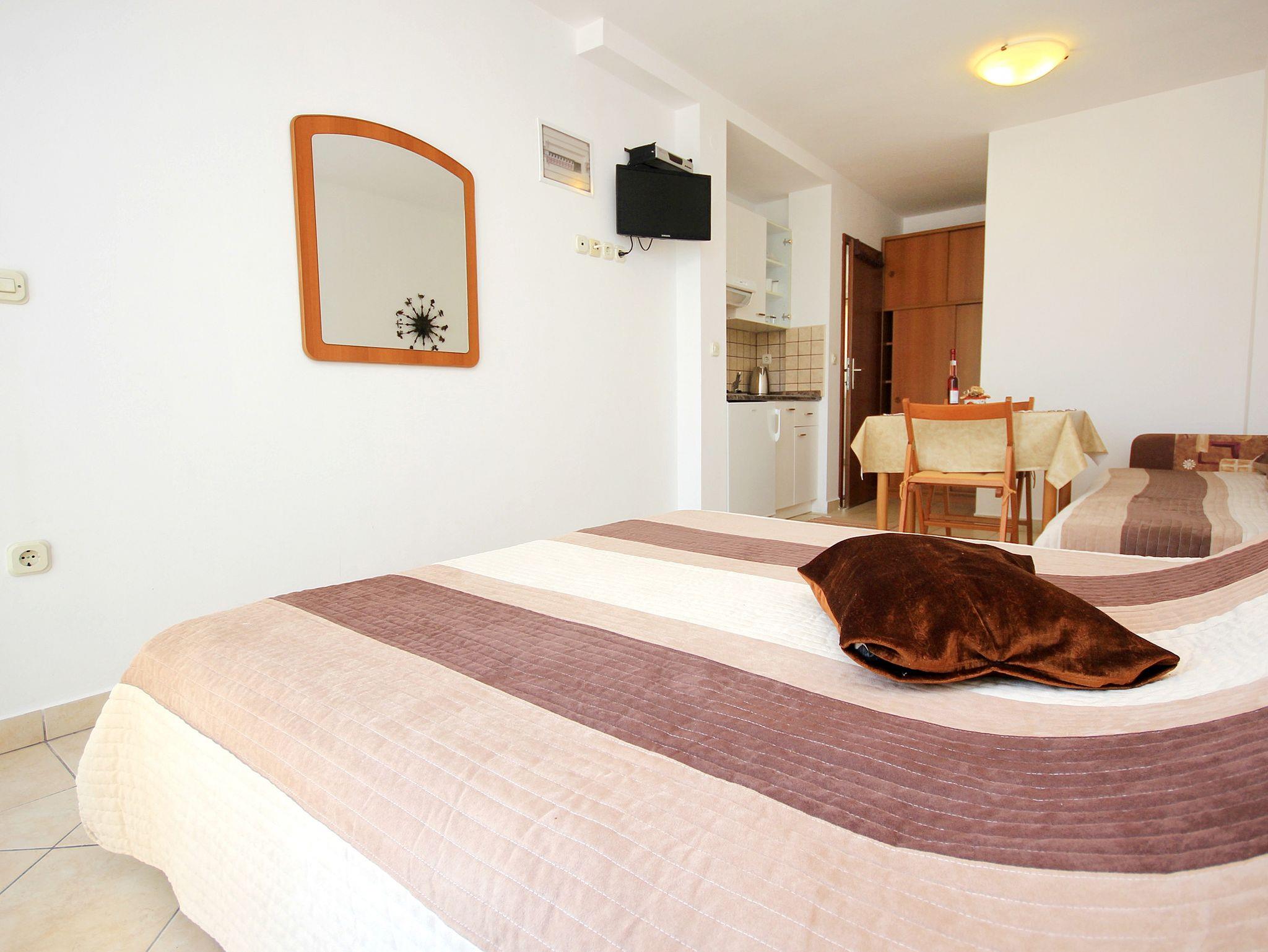 Studio bietet Platz für 3 Gäste. Die Betten sind in Schlafzimmern, die es 1 gibt, und in Esszimmer, innerhalb einer Gesamtfläche von 18m2, angeordnet. Die Gäste haben einen eigenen Balkon zur Verfügung, auf der sie in warmen Sommernächten genießen können. Das Studio-Apartment bietet Meerblick. Es ist erlaubt, Speisen auf dem Gemeinschafts-Grill vorzubereiten. IM PREIS INBEGRIFFEN: Kurtaxe, Endreinigung, Klimatisierung, Parkplatz, Internet, Bügeleisen, Bügelbrett, Föhn. VERBINDLICHE ZUSÄTZLICHE KOSTEN: Aufzahlung für Kurzaufenthalte (prozentualer Zuschlag pro Nächtigungsanzahl: 30% - 1, 20% - 2, 10% - 3). Die Verfügbarkeit zusätzlicher Dienstleistungen in Ihrem reservierten Termin und die Preise derselben (falls nicht aufgeführt) müssen im Voraus überprüft werden. Zusätzliche Dienstleistungen die in der Zahlungsaufforderung nicht aufgeführt sind werden direkt beim Vermieter bezahlt, angenommen der Gast nutzt auch diese.