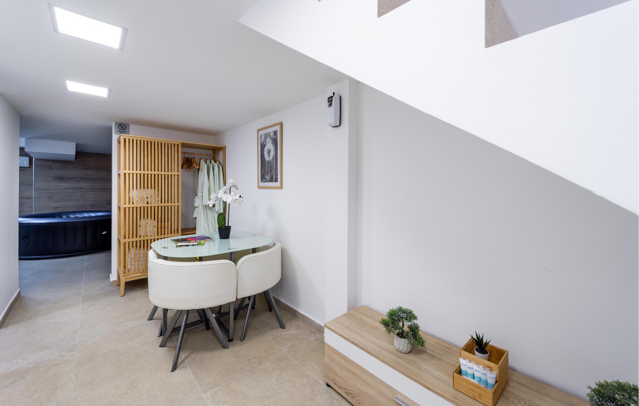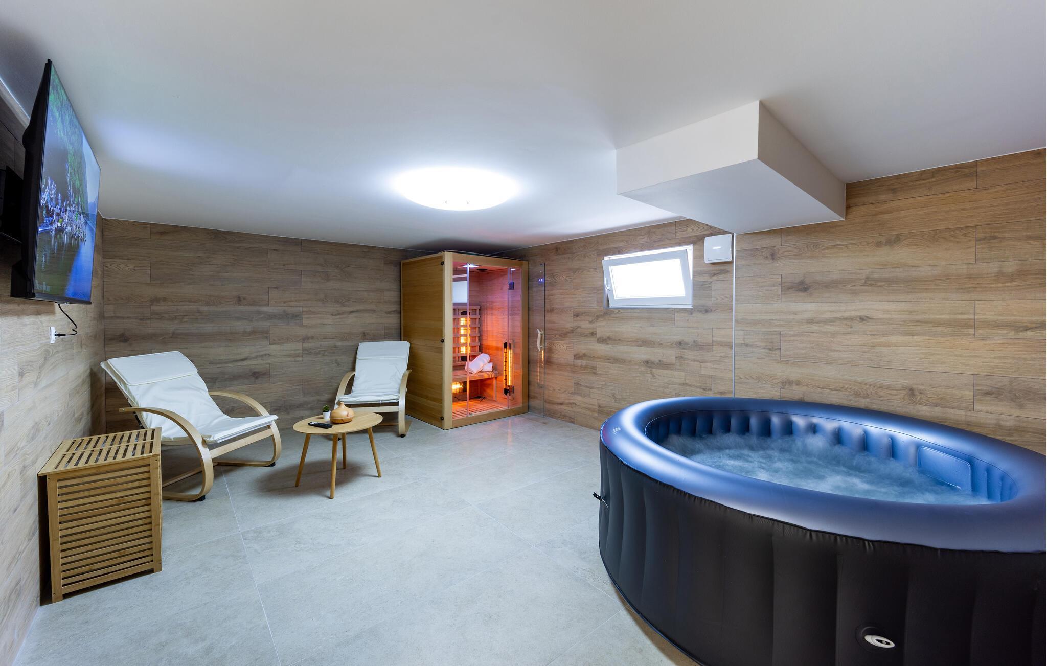 Drinnen erwartet Sie ein stilvoller Wohnbereich mit bequemen Sitzmöglichkeiten und einem großzügigen Esstisch, ideal für gemeinsame Mahlzeiten und gemütliche Abende. Die Küche bietet alles, was Sie zum Zubereiten köstlicher Gerichte benötigen. Lassen Sie Ihrer kulinarischen Kreativität freien Lauf. Nutzen Sie den Whirlpool und die Sauna, um voll und ganz abzuschalten.
