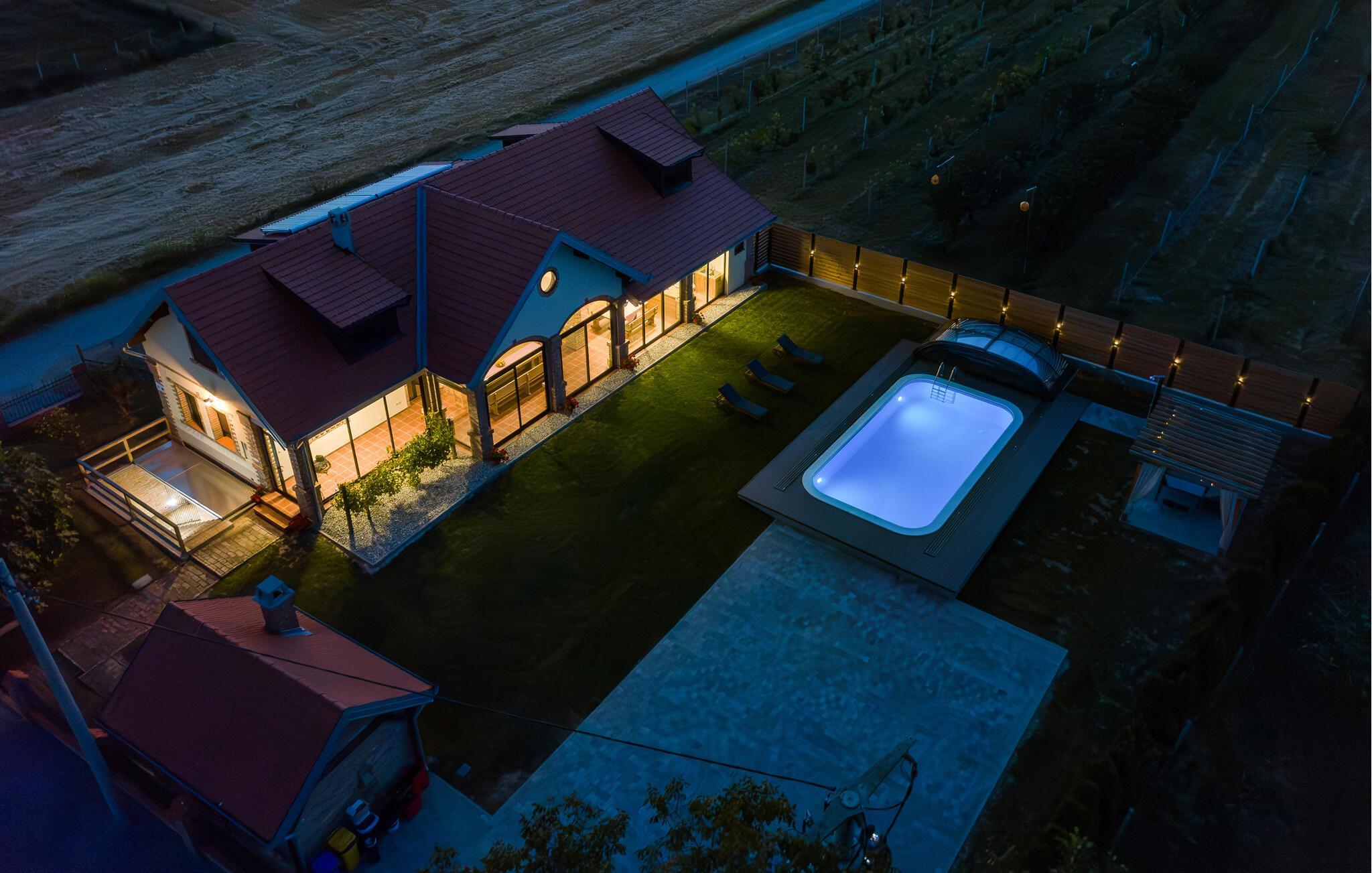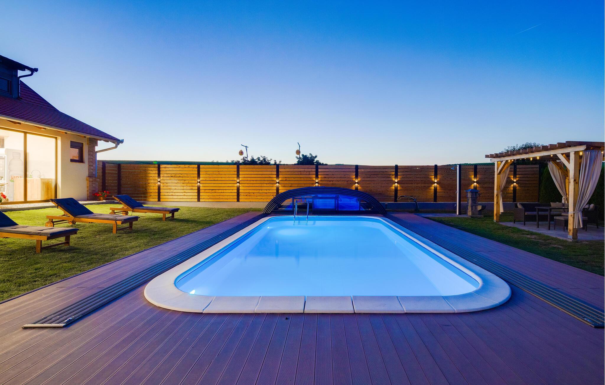 Tauchen Sie in den großzügigen Pool ein oder genießen Sie die ländliche Atmosphäre unter der stilvollen Pergola. Freuen Sie sich auf stimmungsvolle Abende mit der Familie oder Freunden auf der überdachten Terrasse mit Grillplatz.