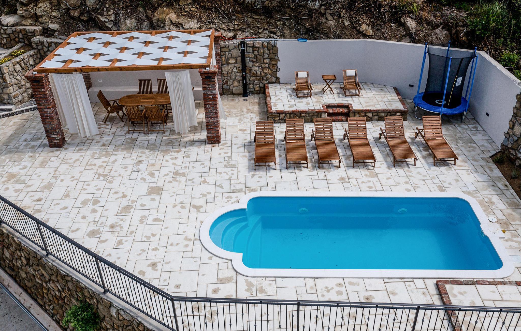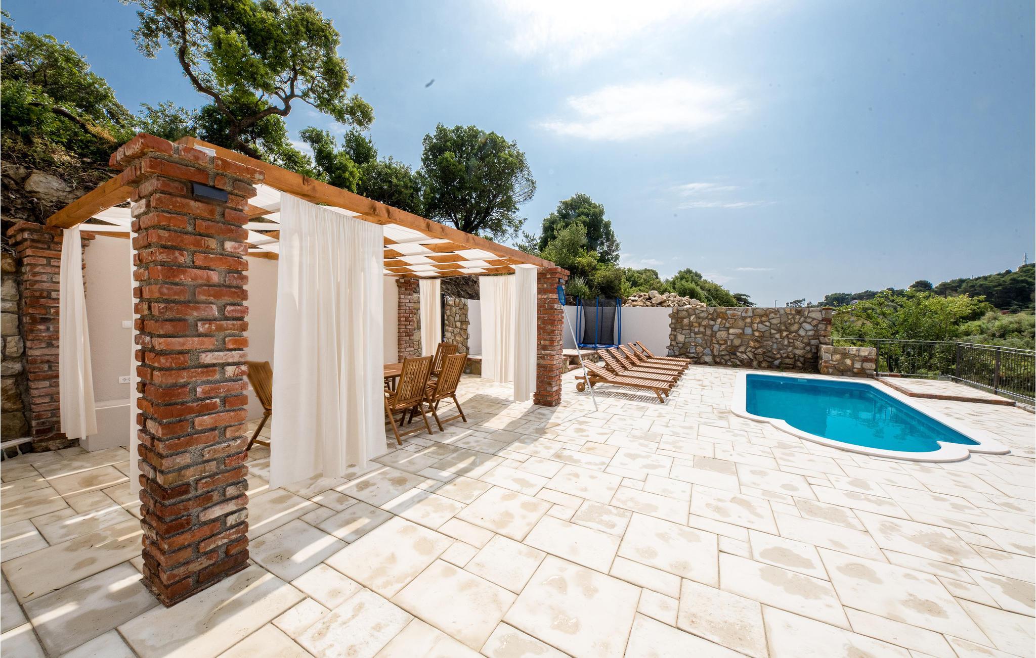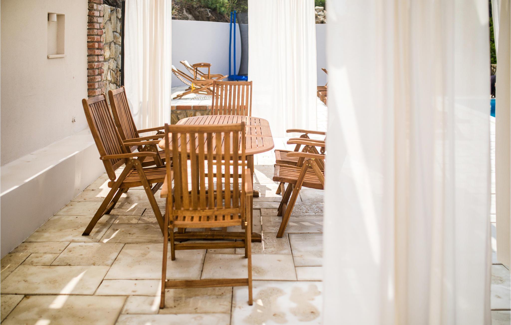 Auch der Außenbereich, mit mehreren Terrassen braucht sich nicht verstecken. Hier können Sie die Sonne genießen und im privaten Pool baden. Genießen Sie den schönen Garten und schauen Ihren Kindern beim Umhertoben zu. Am Abend können Sie unter dem Pavillon mit Grill die Urlaubstage ausklingen lassen und Ausflüge planen.