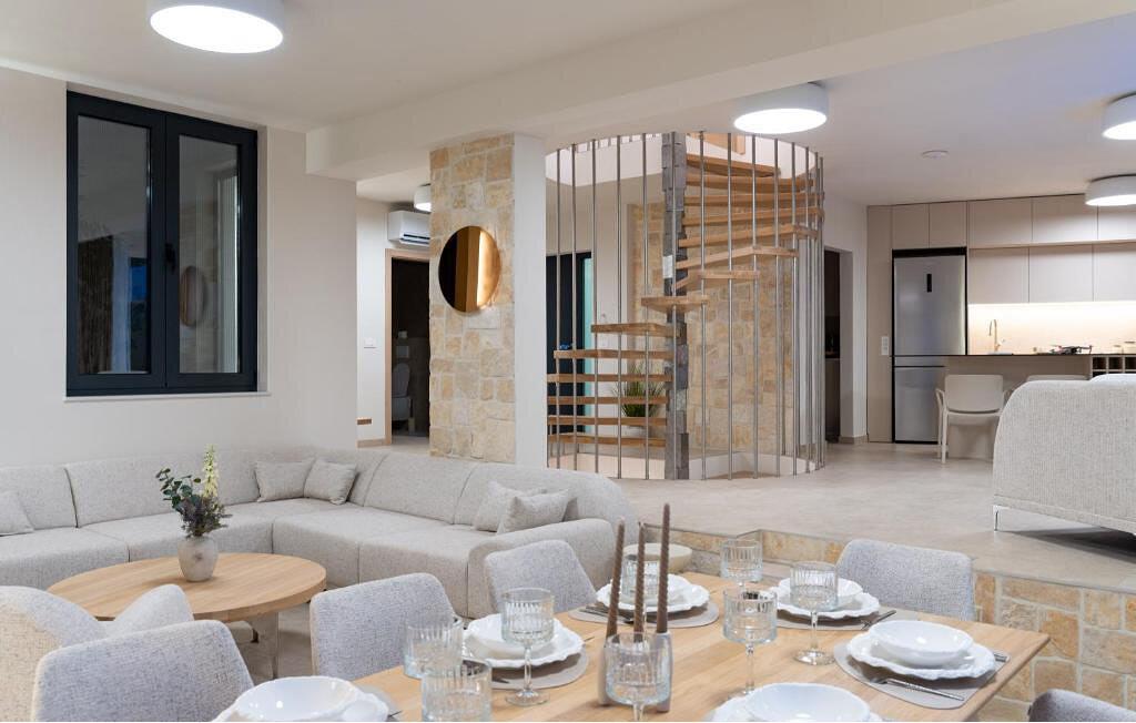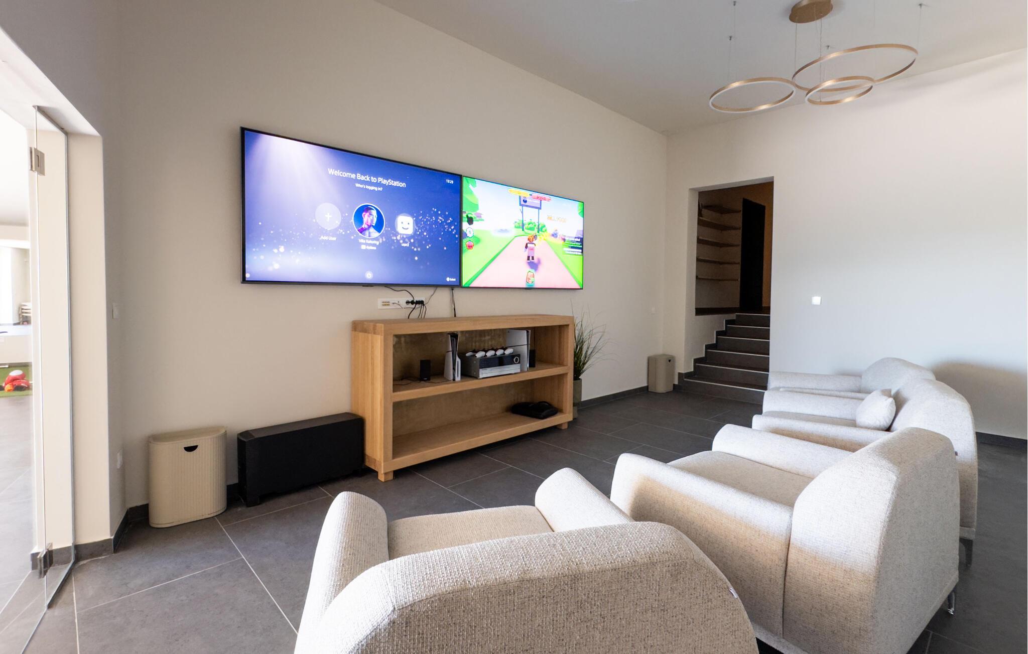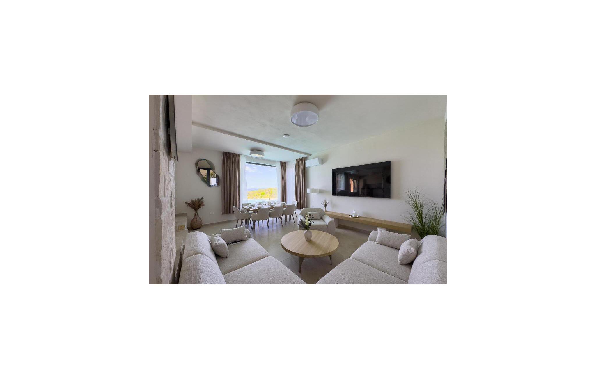 Diese großzügige und mit zahlreichen luxuriösen Annehmlichkeiten ausgestattete Villa heißt Sie in privilegierter Lage oberhalb einer türkisblauen Badebucht willkommen. Eine geschmackvolle, hochwertige Einrichtung und eine harmonische Beleuchtung sorgen für entspannte Stunden beim Speisen, Spielen und Relaxen. Zaubern Sie in geselliger Runde kulinarische Highlights, vergnügen Sie sich an der PlayStation oder an der Tischtennisplatte und nutzen Sie die Trimmgeräte für Ihr Workout. Abends laden gemütliche Sofas zu entspannten Filmabenden ein.