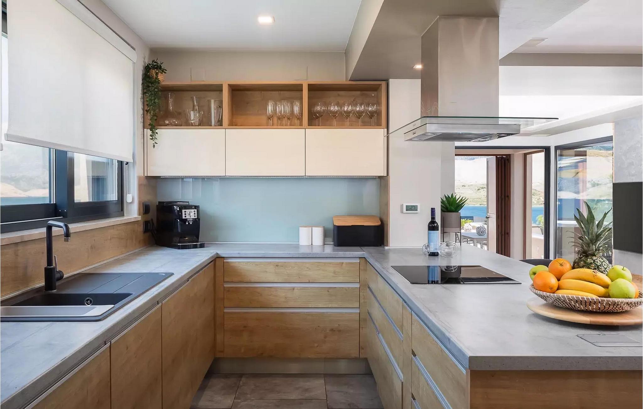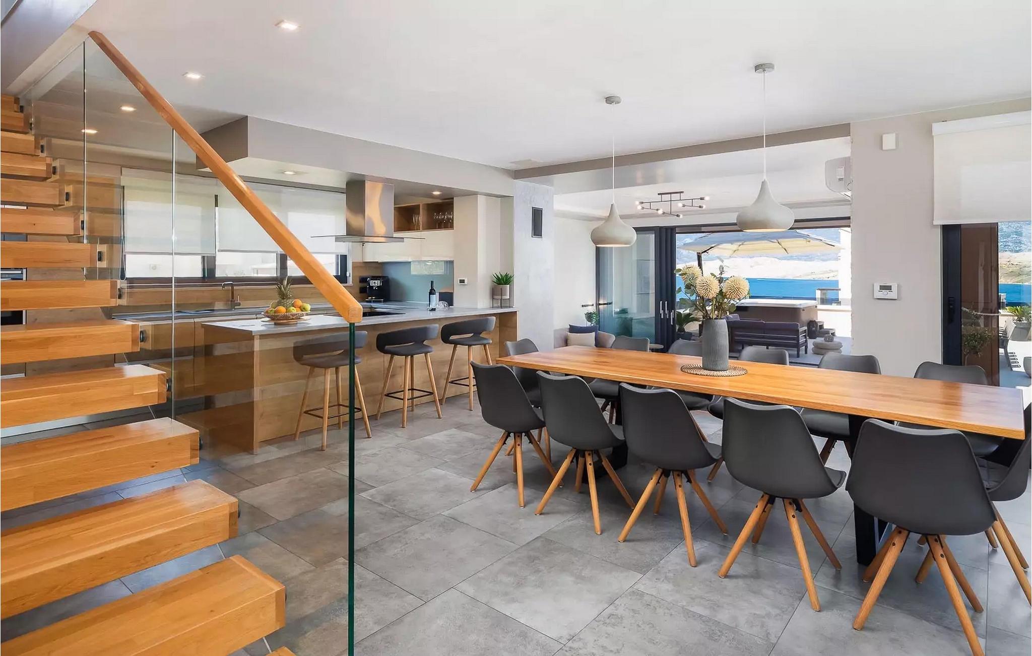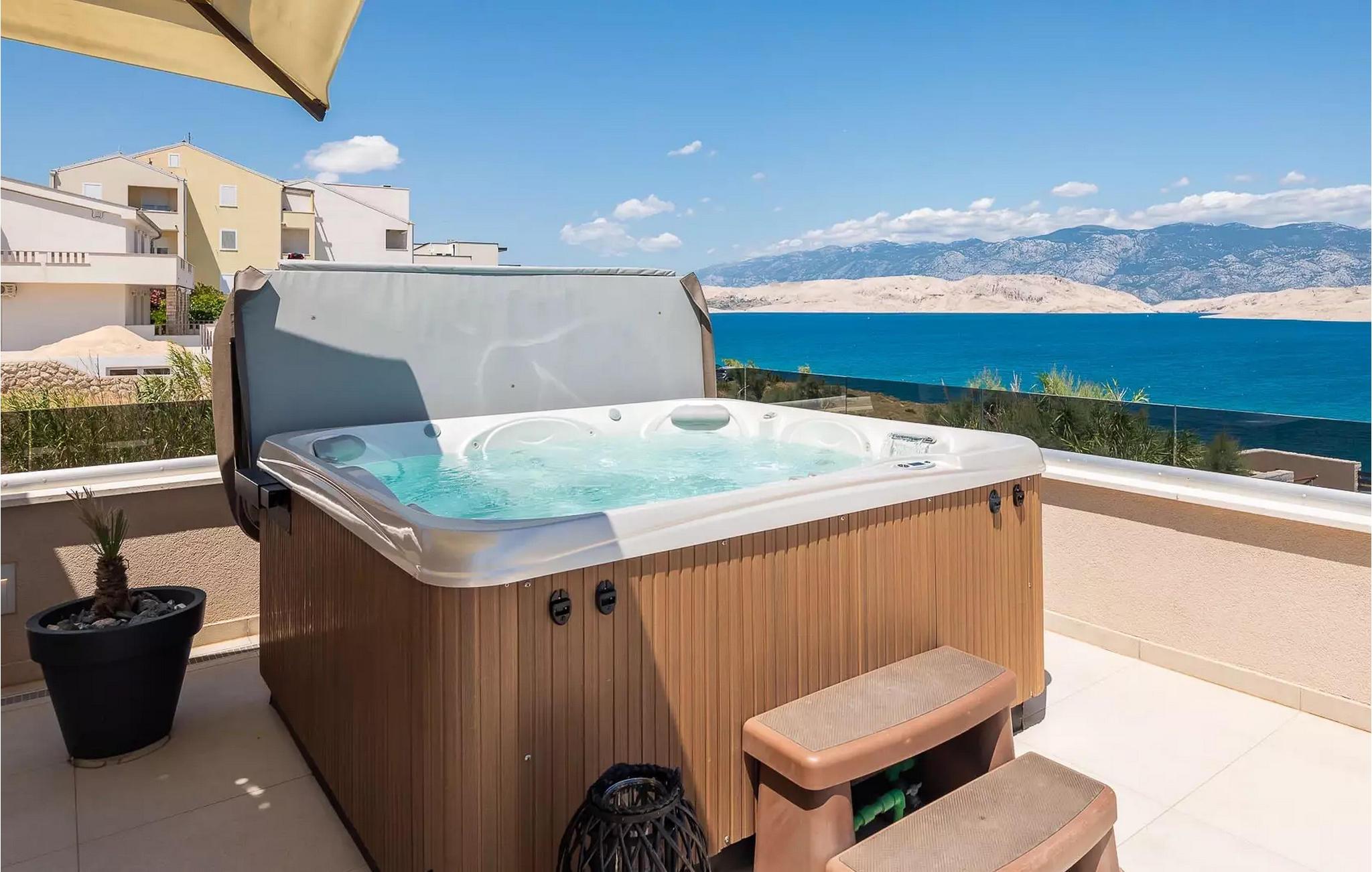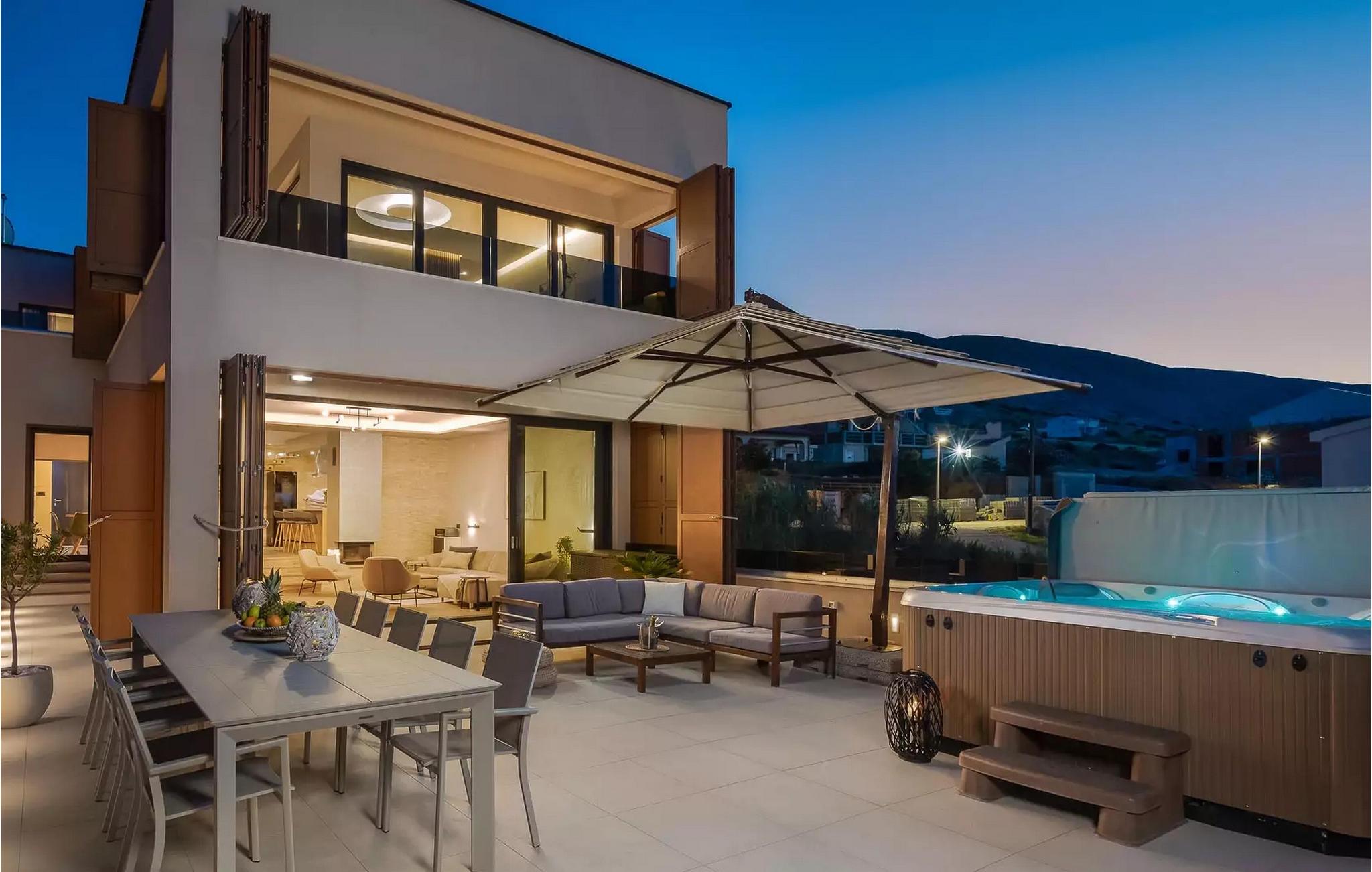 Im Erdgeschoss befindet sich der eindrucksvolle offene Wohn- und Essbereich mit Küche und einem Bad. Ein majestätischer Meerblick, das hochwertige und stilvolle Interieur und ein wunderschöner, moderner Kamin schaffen eine entspannende und zugleich luxuriöse Atmosphäre, die zum Verweilen einlädt. Die professionell ausgestattete Küche bietet den Gästen die Möglichkeit, ihre Kochkünste zum Ausdruck zu bringen und die Rezepte aus der Region nachzukochen. Das Erdgeschoss öffnet sich zu der geräumigen Terrasse mit einem gemütlichen Lounge-Bereich, einem Außenessbereich und einem einladenden Jacuzzi mit herrlichem Meerblick und wunderschöner Aussicht auf die historische Stadt Pag bis hin zum Velebit Gebirge in der Ferne. Ein kurze Treppe führt Sie hinab zur zweiten Terrasse mit dem großzügigen