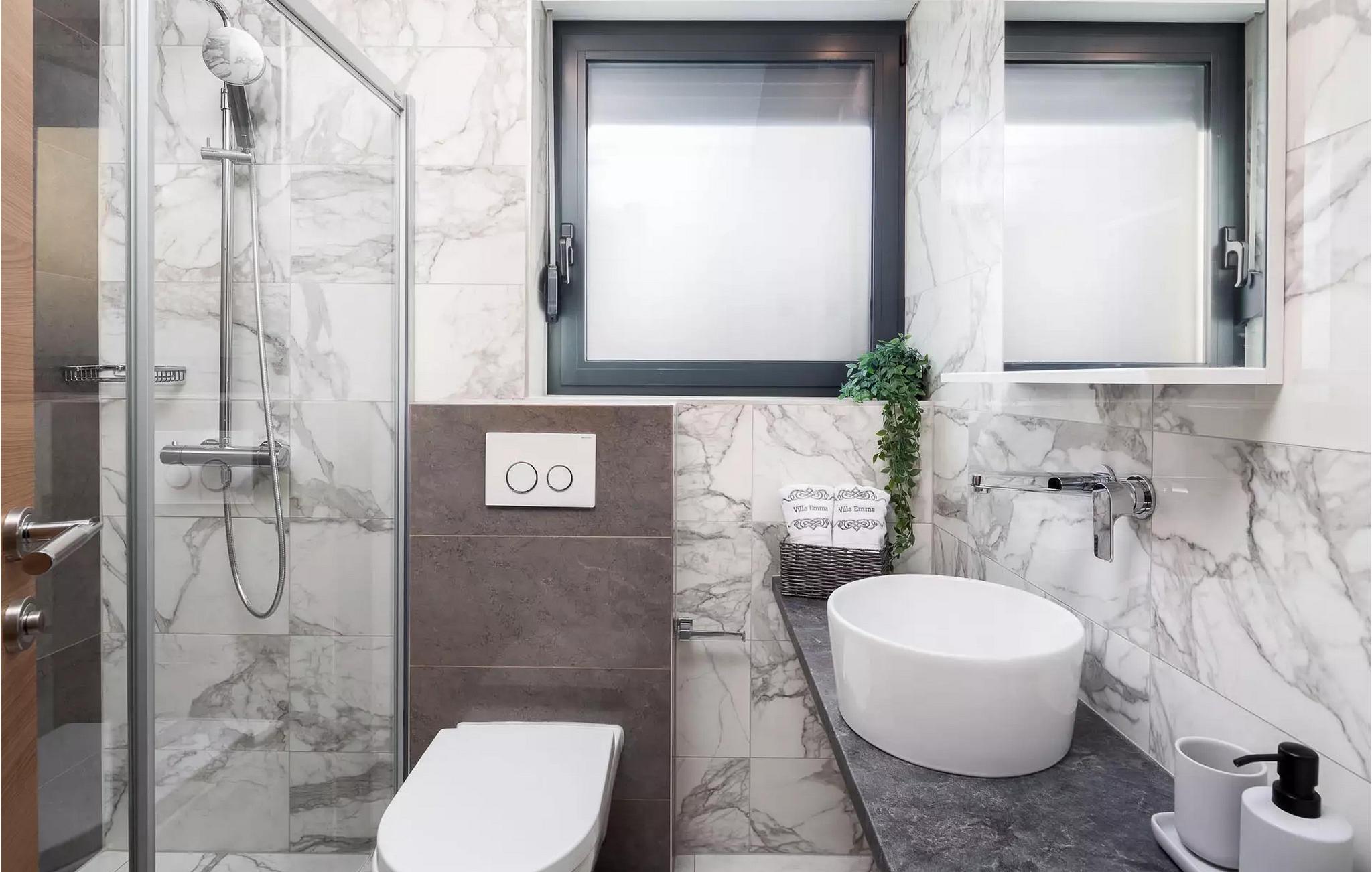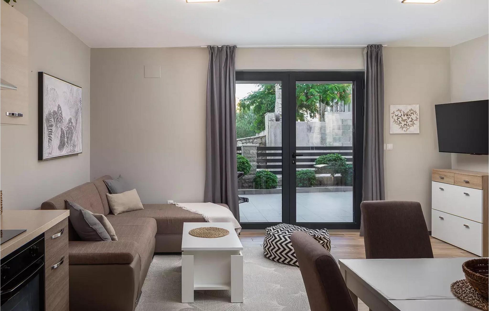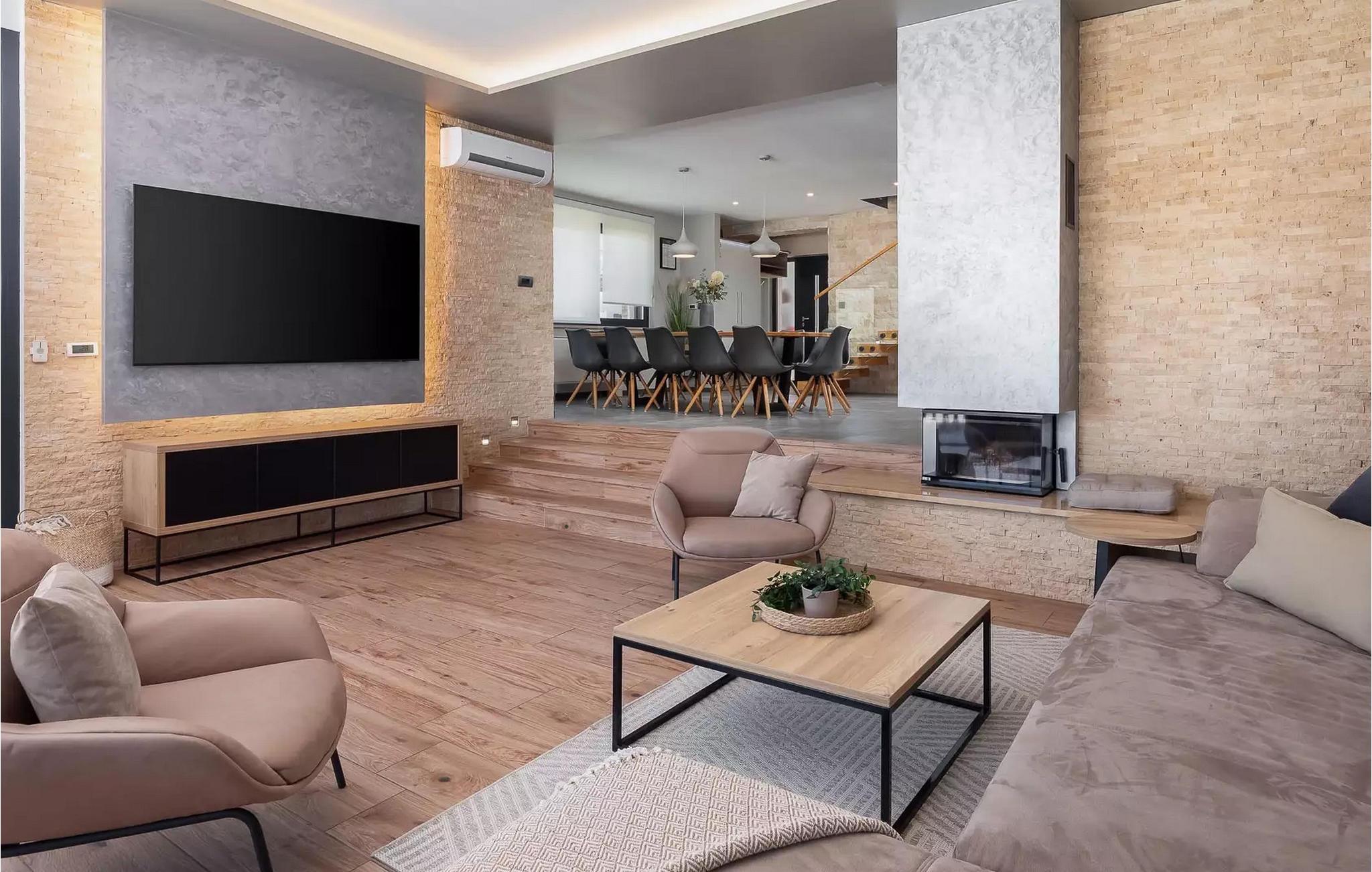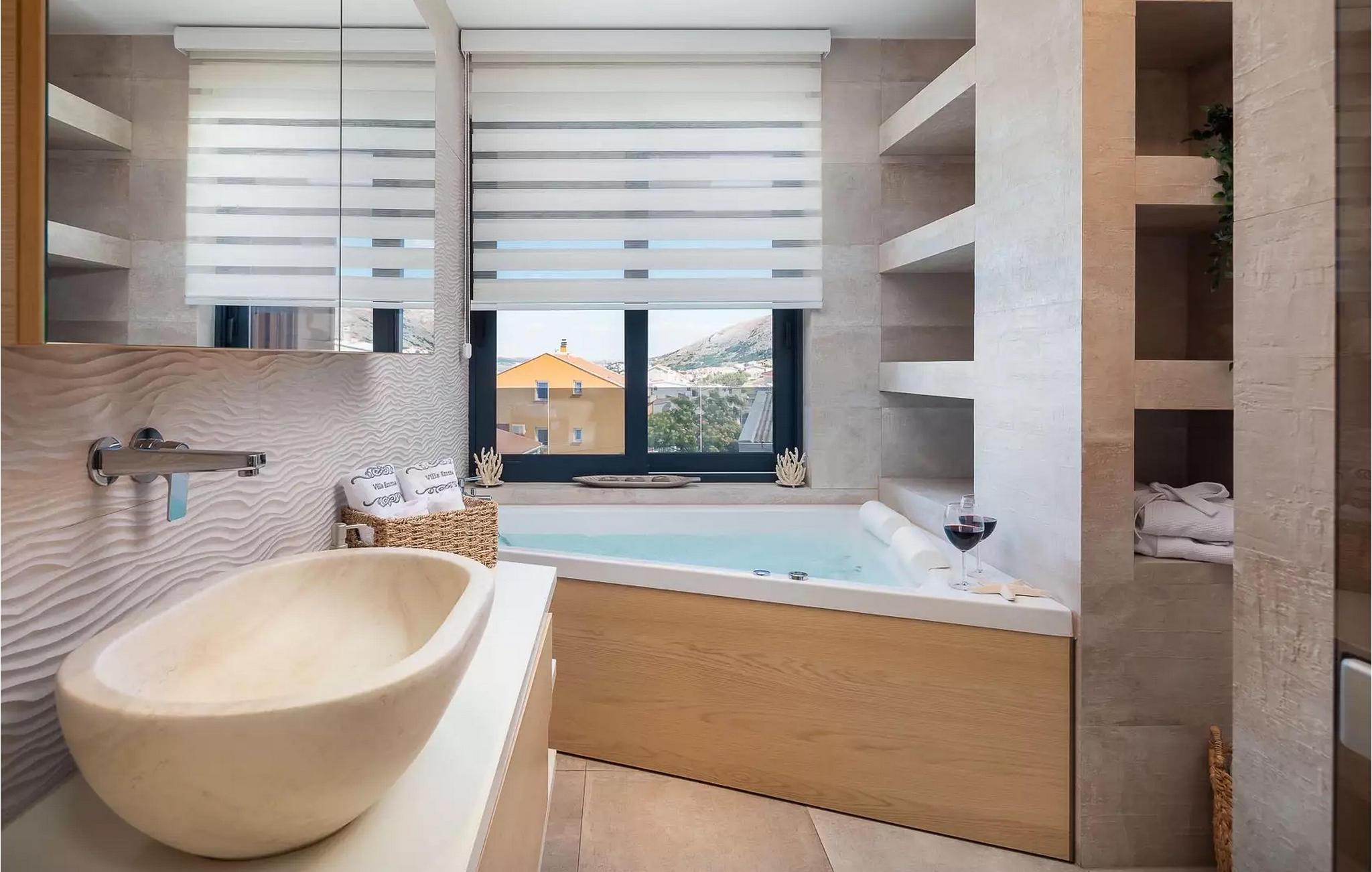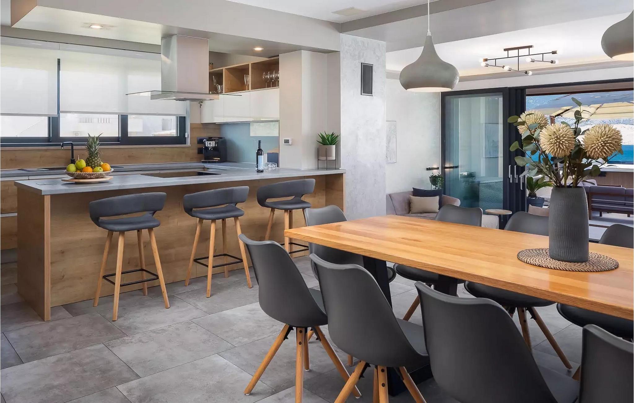 Im Erdgeschoss befindet sich der eindrucksvolle offene Wohn- und Essbereich mit Küche und einem Bad. Ein majestätischer Meerblick, das hochwertige und stilvolle Interieur und ein wunderschöner, moderner Kamin schaffen eine entspannende und zugleich luxuriöse Atmosphäre, die zum Verweilen einlädt. Die professionell ausgestattete Küche bietet den Gästen die Möglichkeit, ihre Kochkünste zum Ausdruck zu bringen und die Rezepte aus der Region nachzukochen. Das Erdgeschoss öffnet sich zu der geräumigen Terrasse mit einem gemütlichen Lounge-Bereich, einem Außenessbereich und einem einladenden Jacuzzi mit herrlichem Meerblick und wunderschöner Aussicht auf die historische Stadt Pag bis hin zum Velebit Gebirge in der Ferne. Ein kurze Treppe führt Sie hinab zur zweiten Terrasse mit dem großzügigen