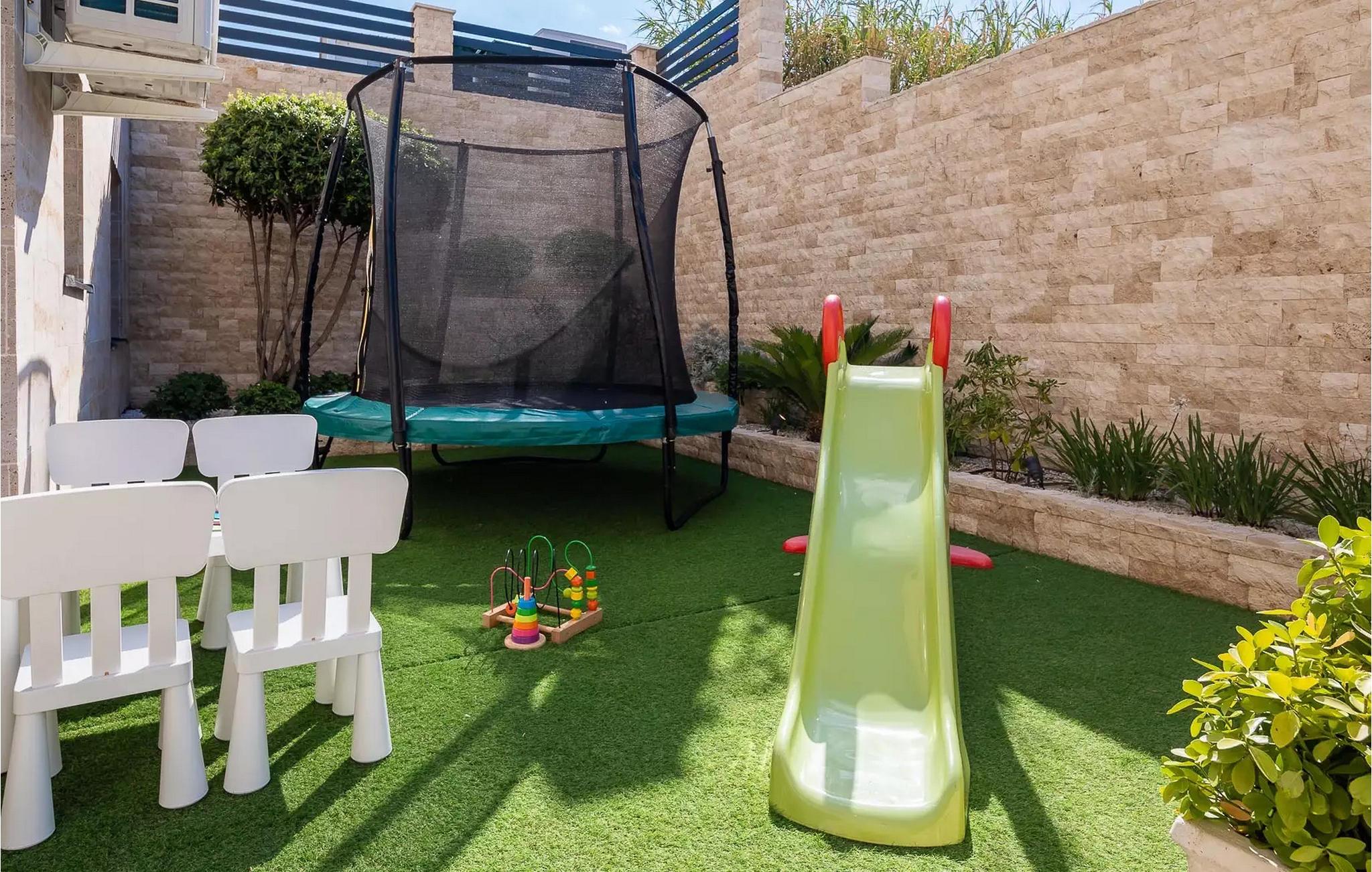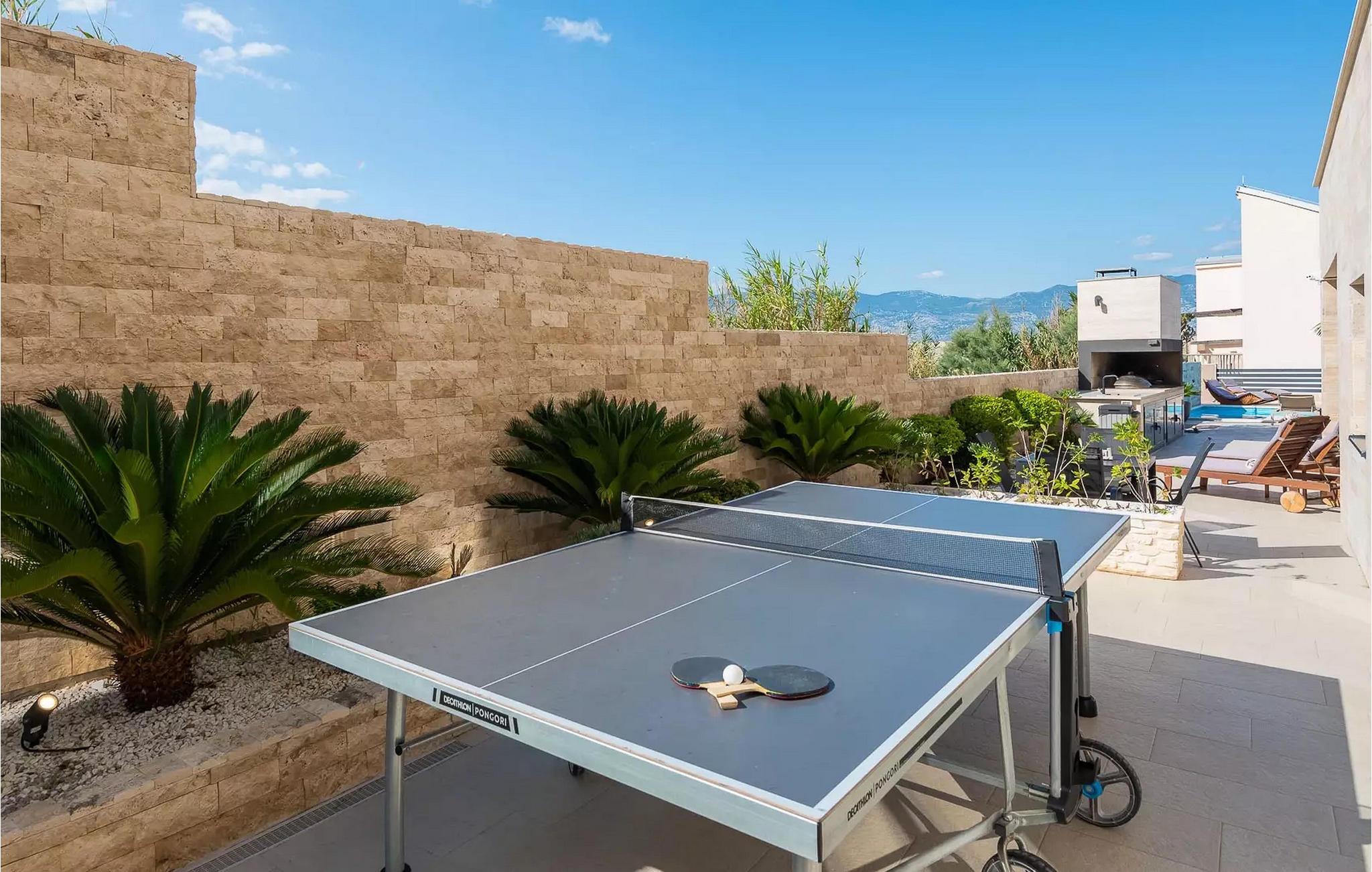 Poolbereich. Dort befindet sich ein weiterer Sitzbereich, ein Spielbereich mit Häuschen und Rutsche, eine Tischtennisplatte, zahlreiche Sonnenliegen, ein großer Holzkohlegrill und natürlich der privater Pool mit Hydromassage, Kaskade und Rutsche und einem flachen Poolbereich, der für Kinder geeignet ist.