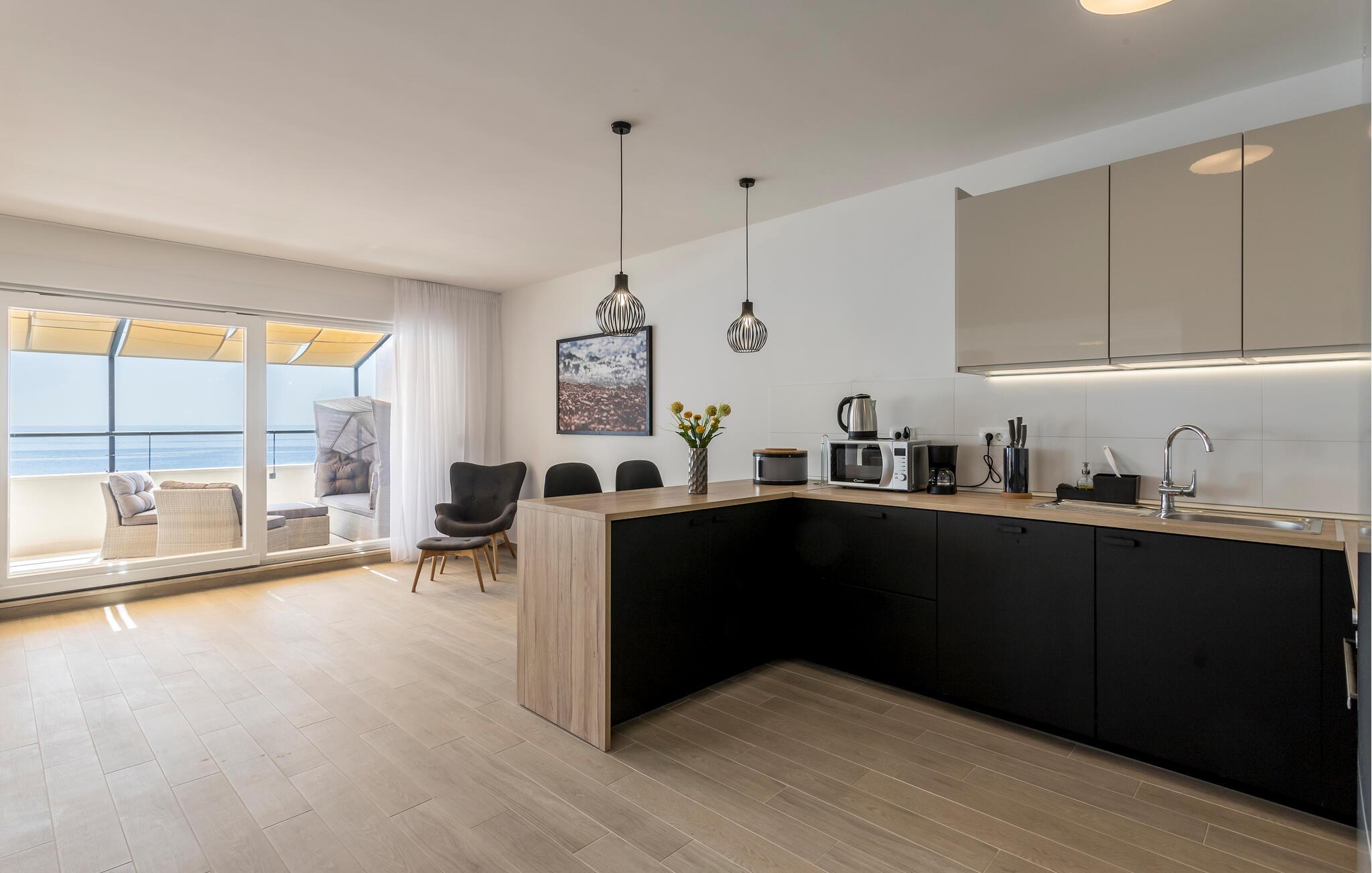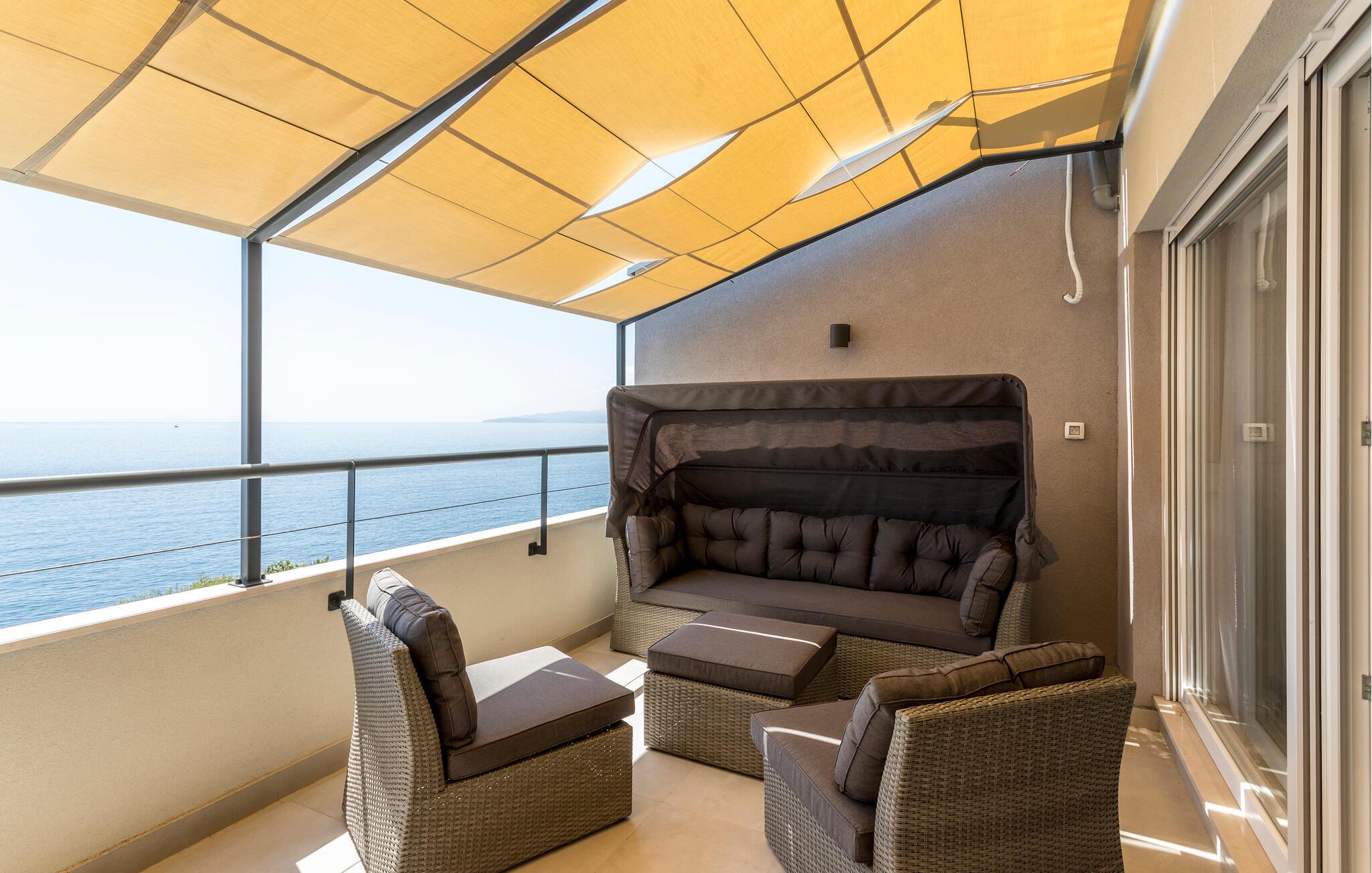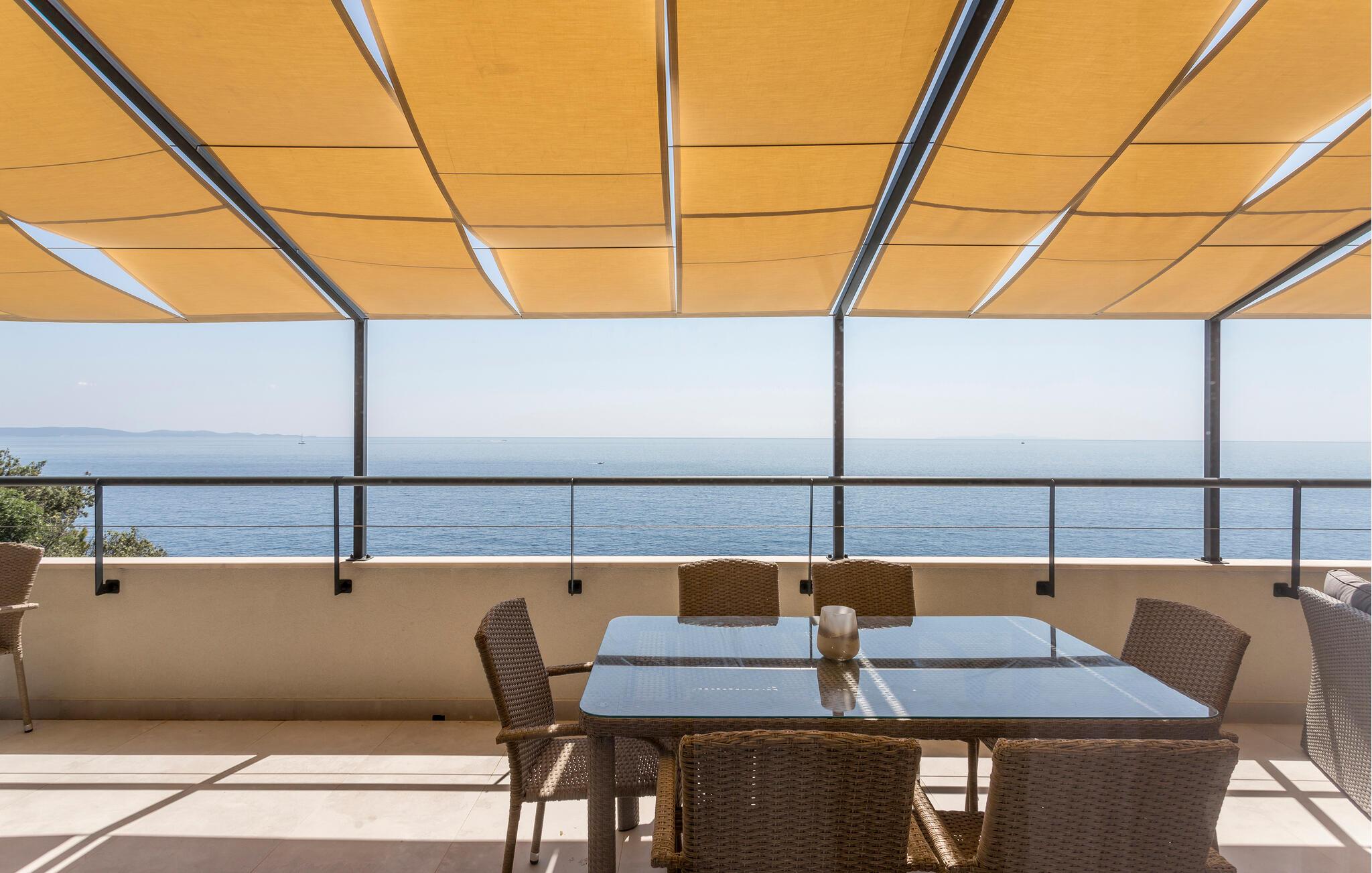 Auf Ihrer großen, einladenden Terrasse können Sie beim Frühstück oder bei einem Glas Wein am Nachmittag den Blick über das blaue Meer schweifen lassen. Erfrischen Sie sich im gemeinsamen Pool und knüpfen Sie nette Kontakte am Grill.