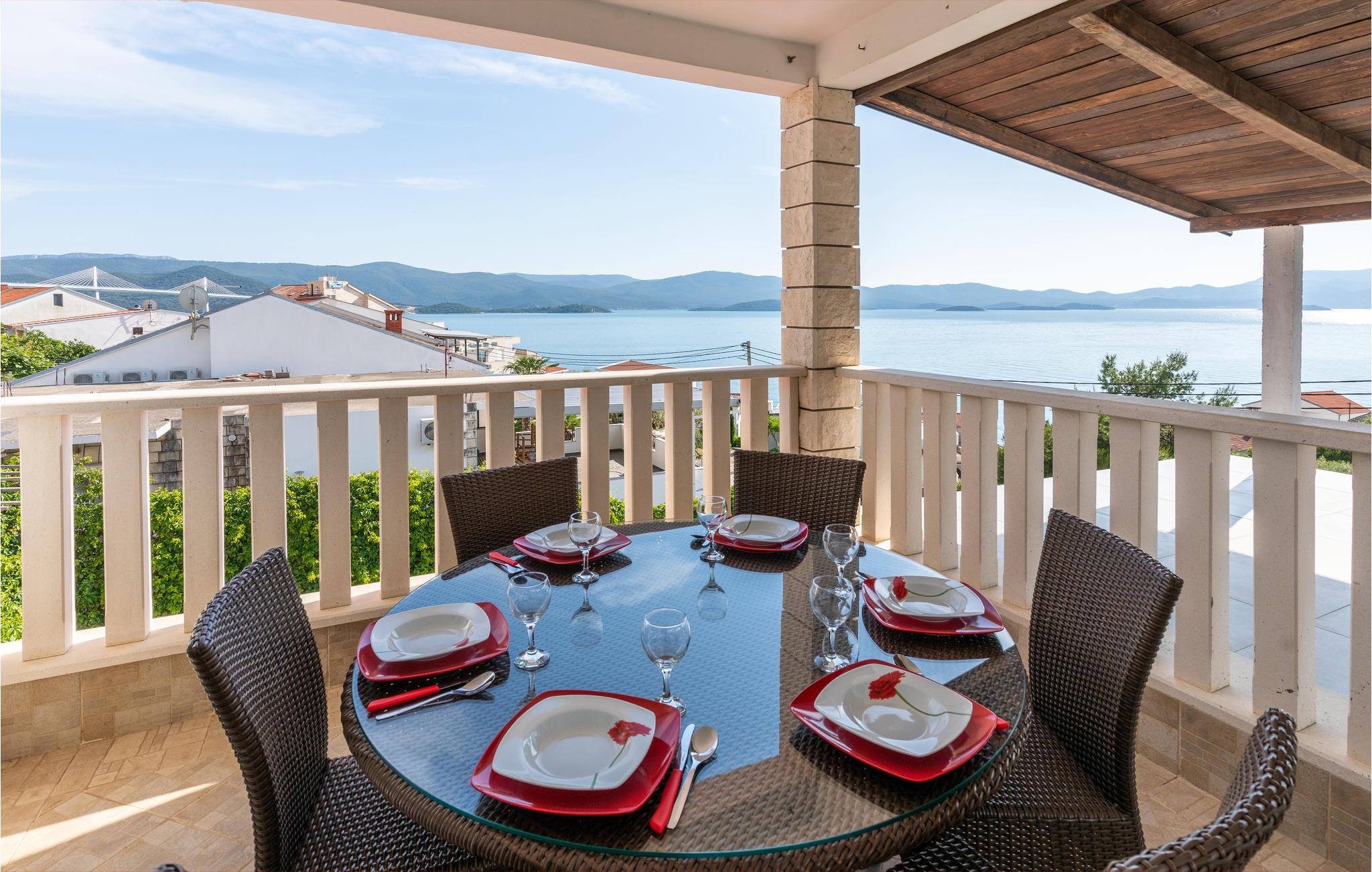 Zwei schöne Ferienwohnungen nahe dem Meer, ein idealer Ort für befreundete Familien, die zusammen verreisen wollen. Im Erdgeschoss befindet sich das CDR315. CDR136 ist größer und im 1. Stock platziert, während CDR166 im 2. Stock liegt. Von den überdachten Terrassen mit Blick aufs Meer erleben Sie abends das verzaubernde Farbenspiel Sonnenuntergangs. Im hinteren Teil des Gartens ist eine überdachte Terrasse mit Sommerküche und Grill. Der Kies-Steinstrand ist ca. 50 m entfernt. Komarna ist ein kleiner Ort mit guten Möglichkeiten für Ausflüge nach Dubrovnik, Mostar oder auf die Insel Korcula.