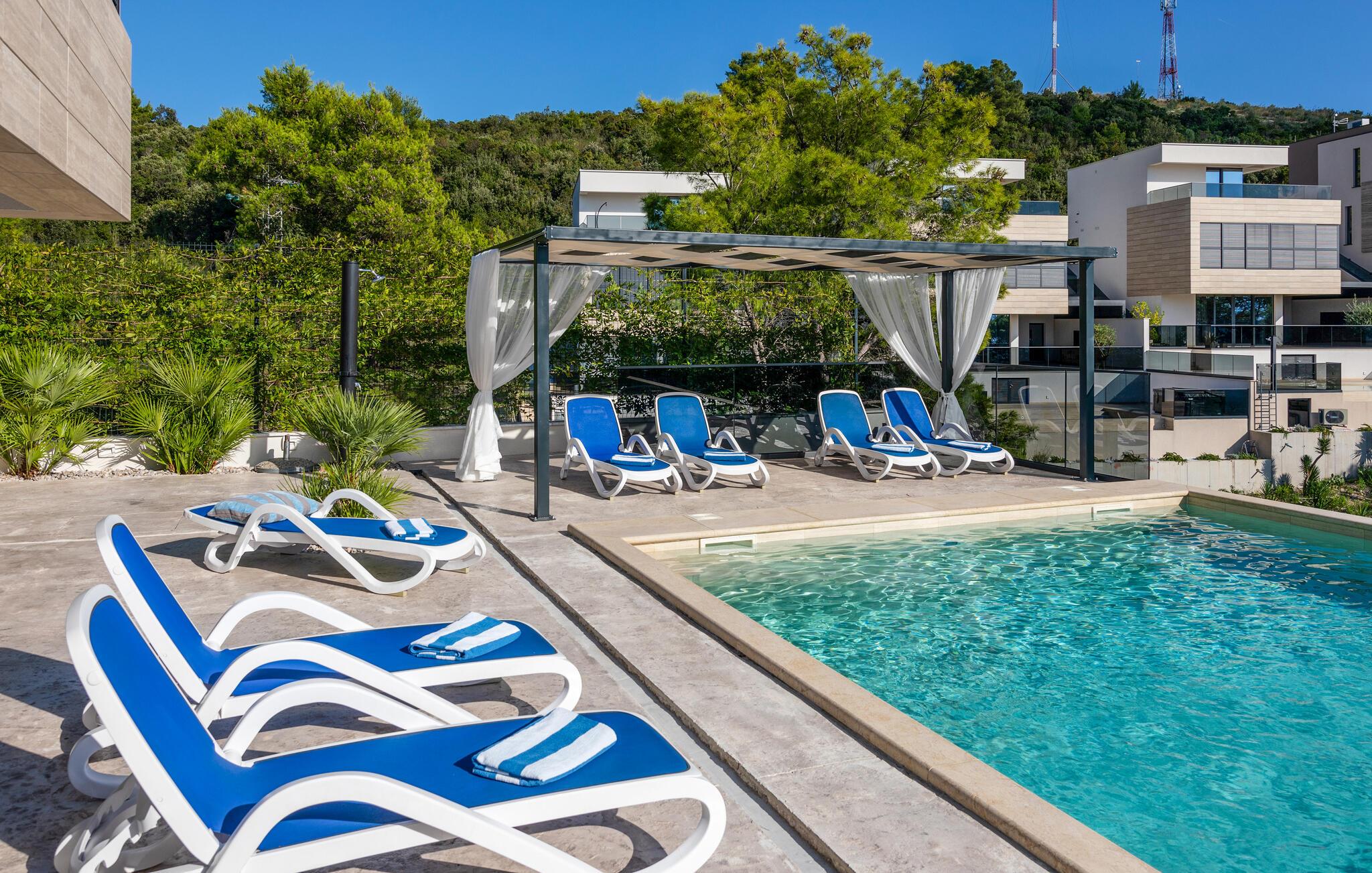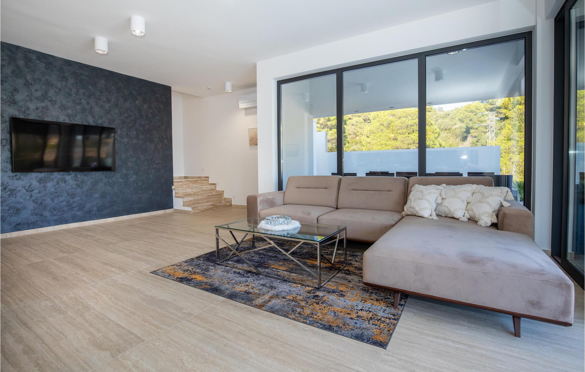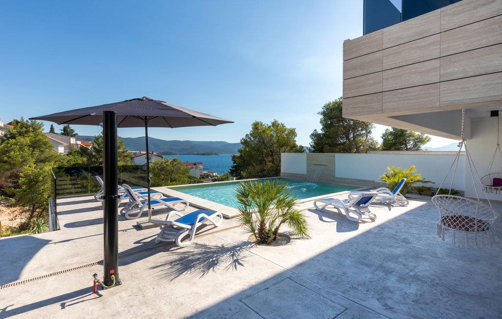 Der Wohnraum ist ein Blickfang, hier können Sie an der langen Küchenzeile Ihre Mahlzeiten zubereiten und am originellen Hochtisch mit der großen Familie einnehmen. Vom großzügigen Wohnraum gelangen Sie auch auf die schöne Terrasse, von der Sie einen Panoramablick auf das Meer haben. Genießen Sie Ihren privaten Pool, die Schaukeln und Sonnenliegen, um zu entspannen.