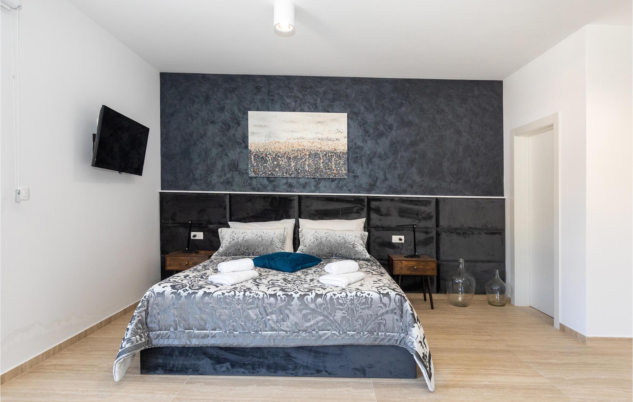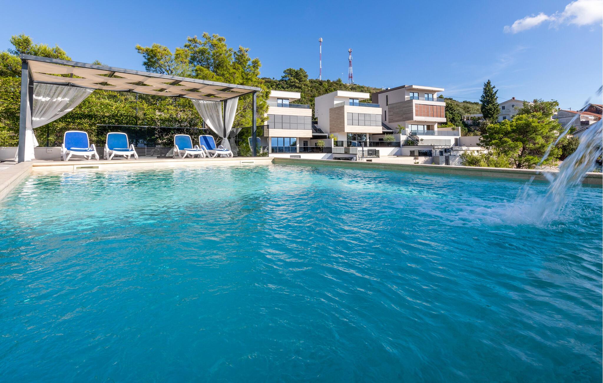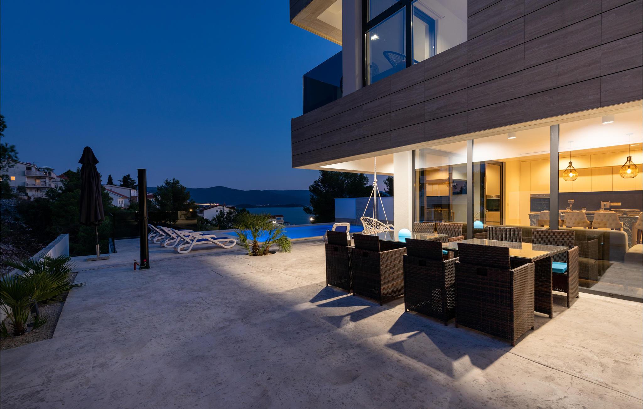 Der Wohnraum ist ein Blickfang, hier können Sie an der langen Küchenzeile Ihre Mahlzeiten zubereiten und am originellen Hochtisch mit der großen Familie einnehmen. Vom großzügigen Wohnraum gelangen Sie auch auf die schöne Terrasse, von der Sie einen Panoramablick auf das Meer haben. Genießen Sie Ihren privaten Pool, die Schaukeln und Sonnenliegen, um zu entspannen.
