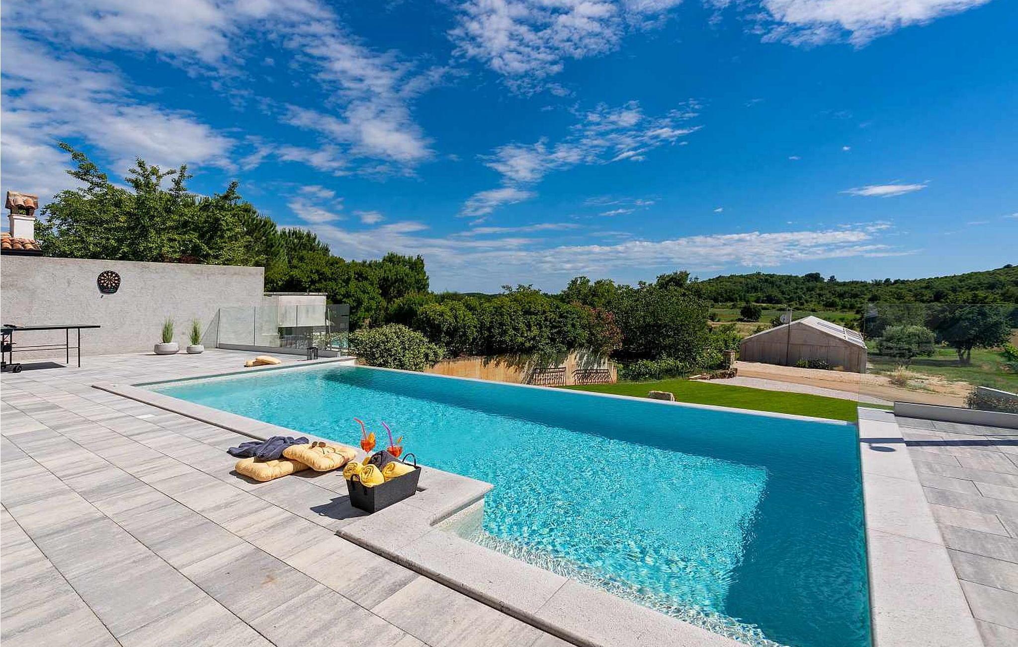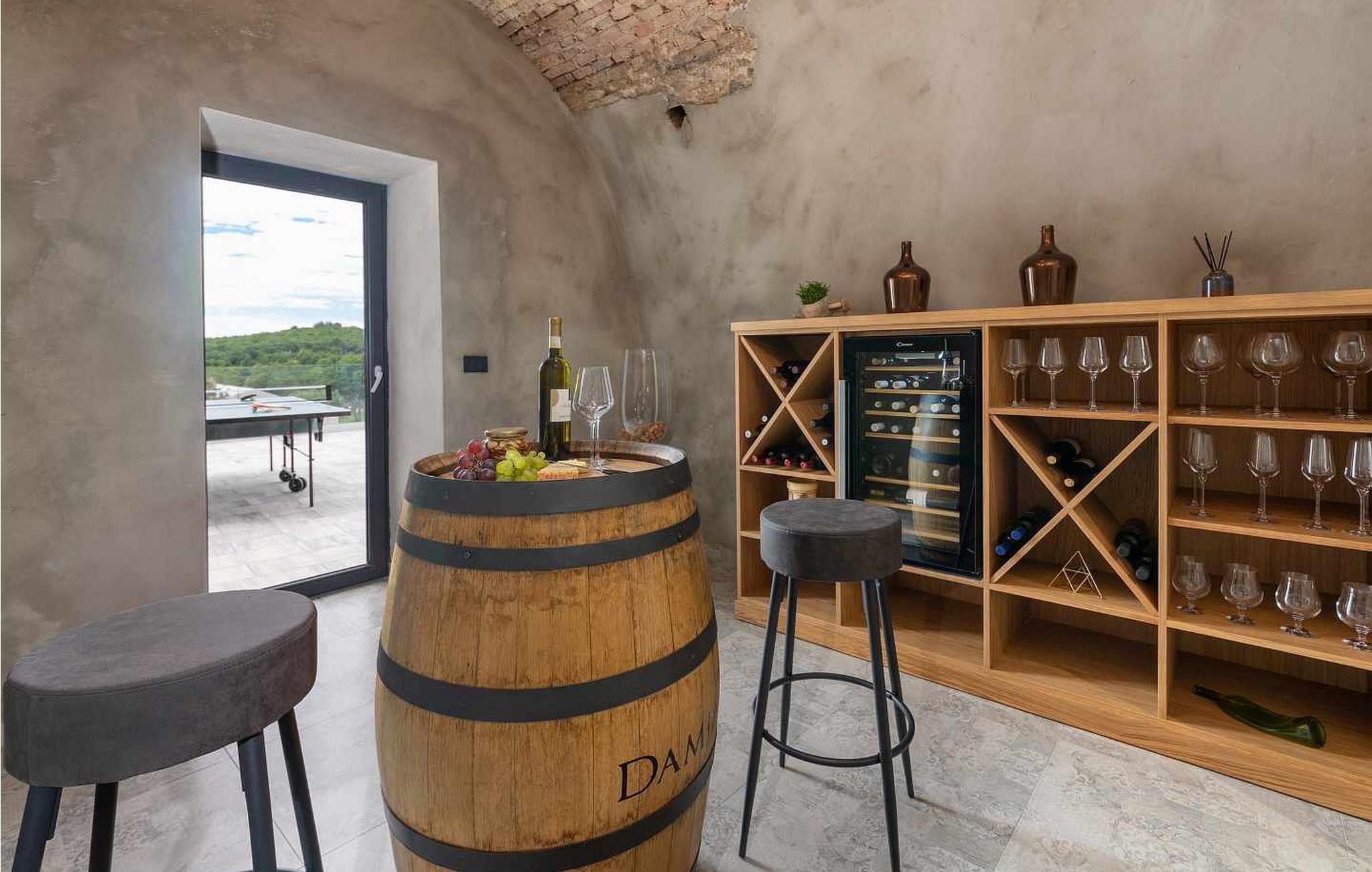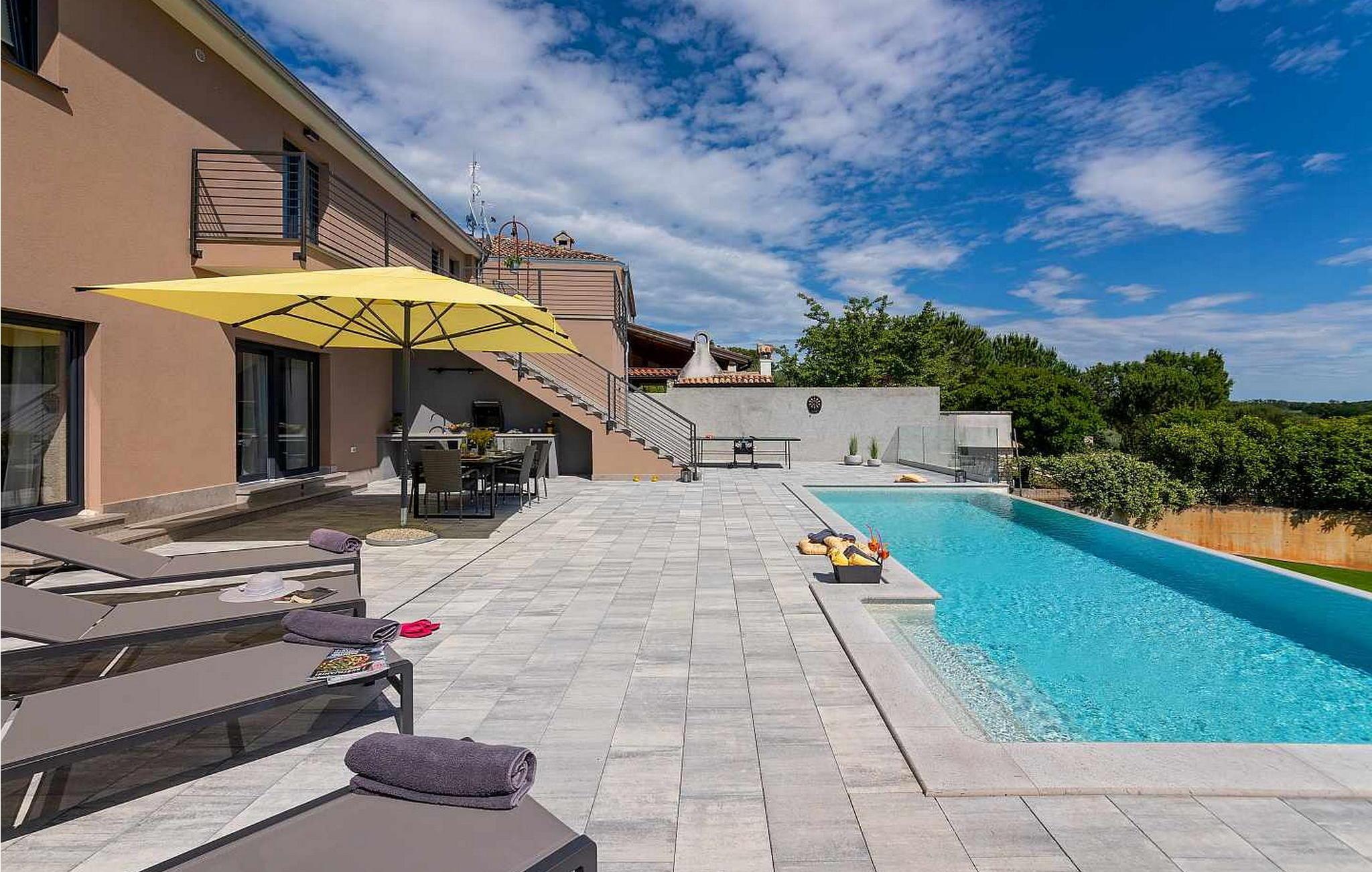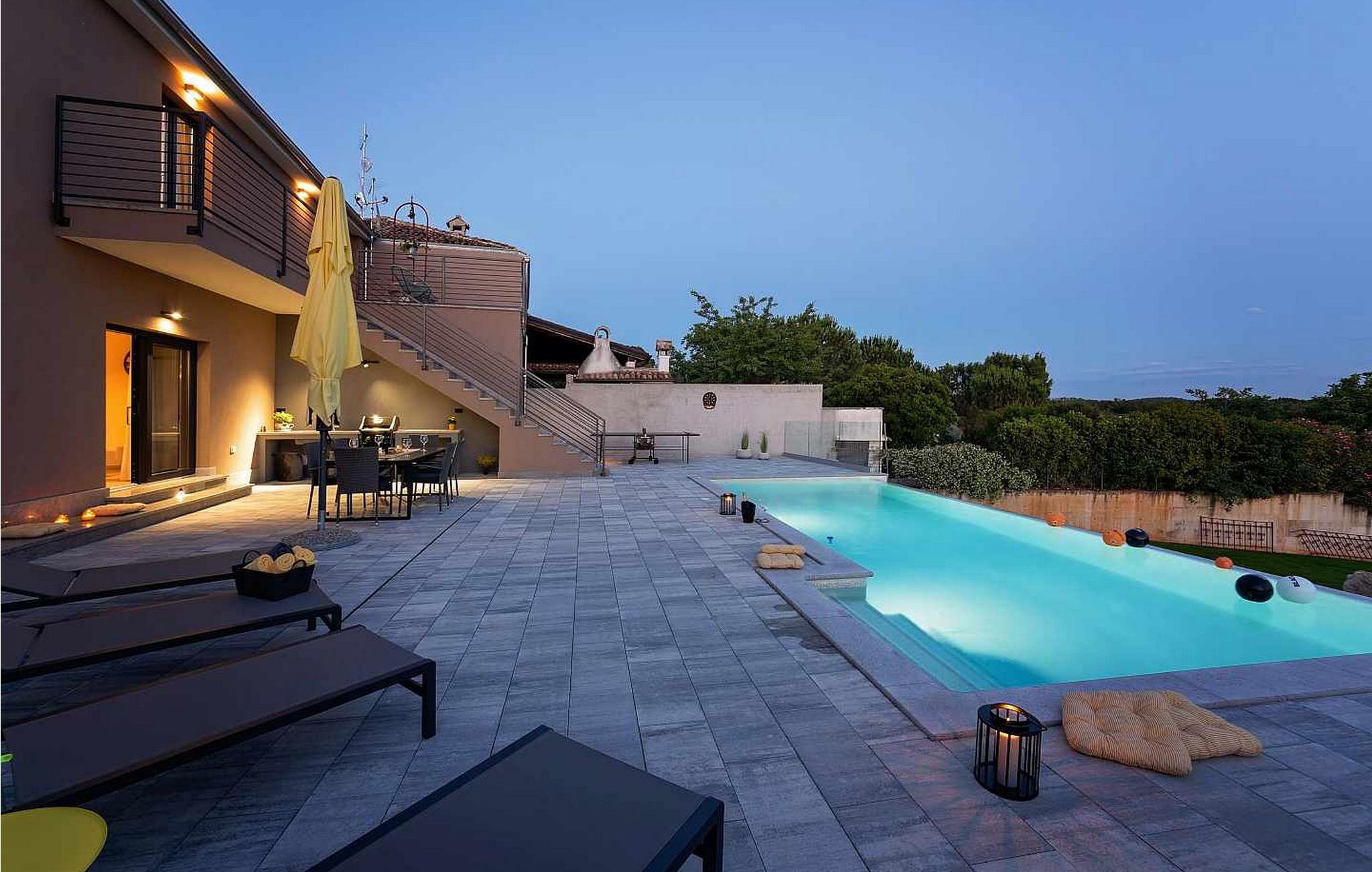Willkommen in der beeindruckenden Villa Sunnyside am Rande des idyllischen Dorfes Dracevac. Dieses moderne Ferienhaus kombiniert zeitgemäßen Komfort mit einem Hauch von Geschichte und schafft so eine einzigartige Atmosphäre. Der aufwendig gestaltete Weinkeller, der aus einer alten Zisterne entstand, verleiht der Unterkunft ihren besonderen Charme. Auf dem privaten Grundstück genießen Sie Ruhe und Entspannung. Tauchen Sie in den Infinity-Pool ein, sonnen Sie sich auf der großzügigen Liegefläche oder verbringen Sie gesellige Stunden am Grill. Der Essbereich im Freien lädt Sie zu kulinarischen Abenden unter dem istrischen Sternenhimmel ein.
