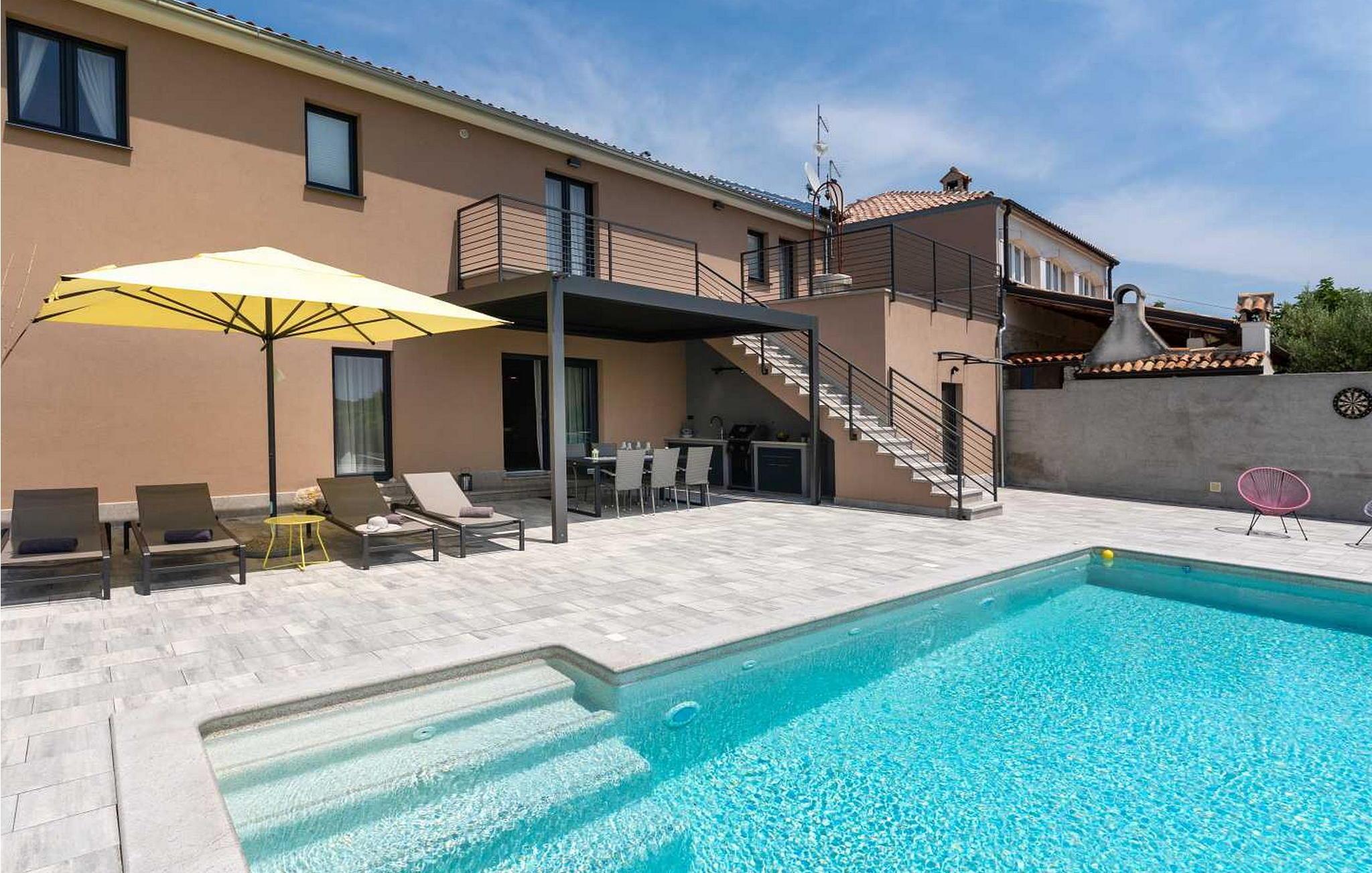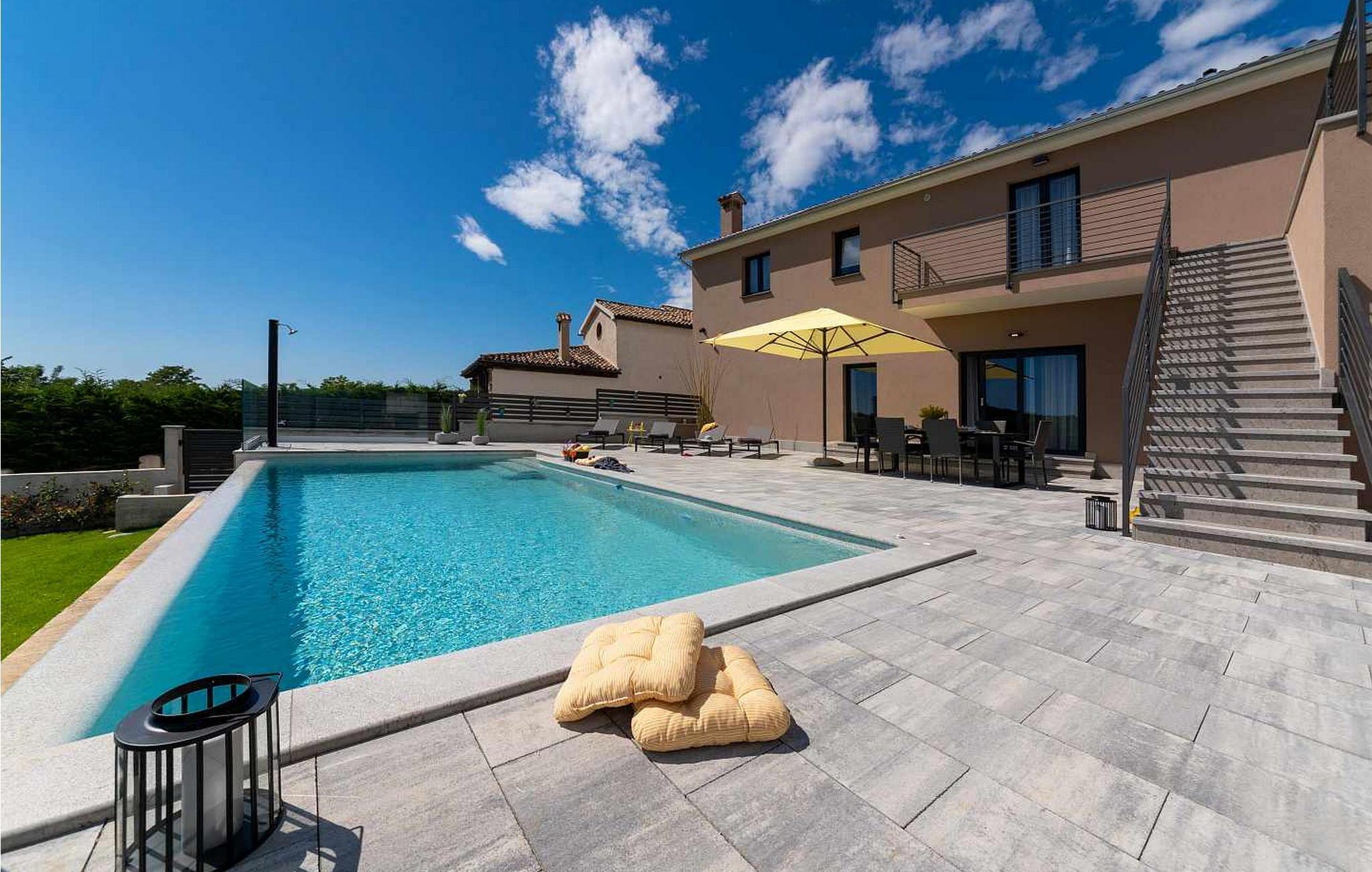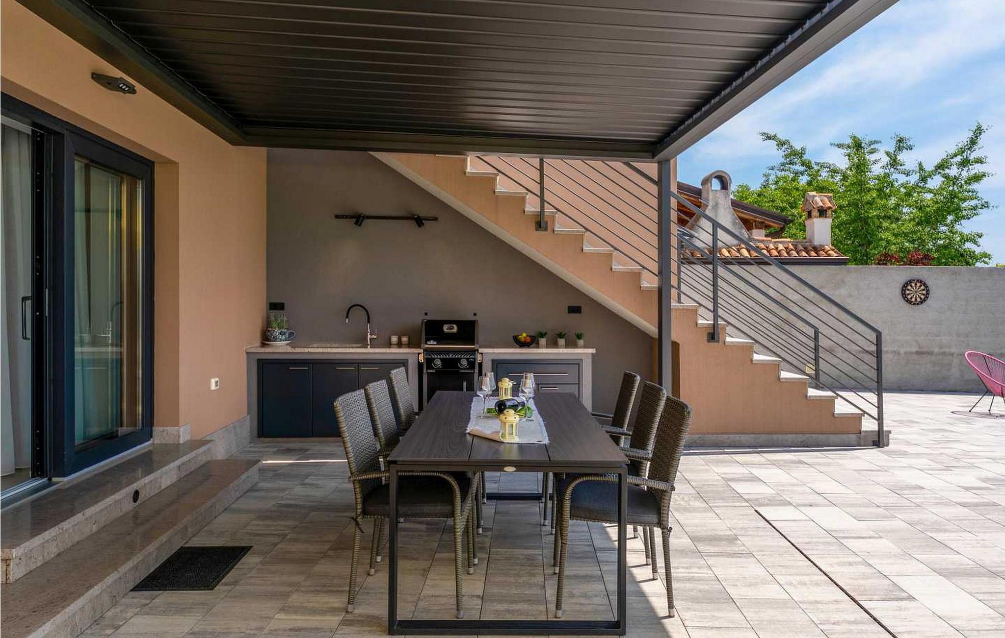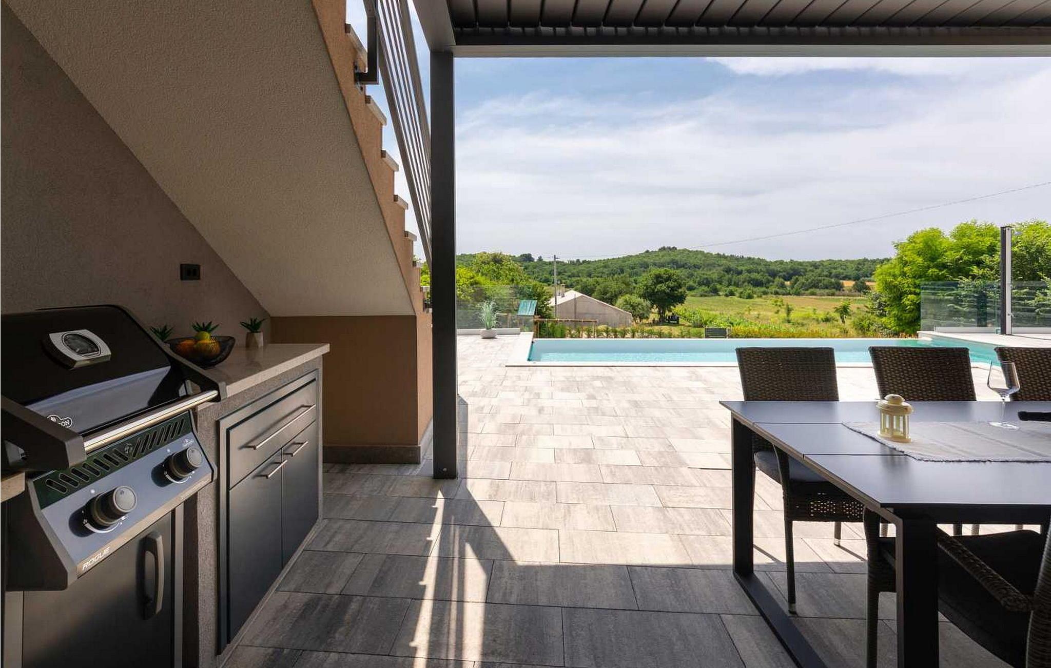 Willkommen in der beeindruckenden Villa Sunnyside am Rande des idyllischen Dorfes Dracevac. Dieses moderne Ferienhaus kombiniert zeitgemäßen Komfort mit einem Hauch von Geschichte und schafft so eine einzigartige Atmosphäre. Der aufwendig gestaltete Weinkeller, der aus einer alten Zisterne entstand, verleiht der Unterkunft ihren besonderen Charme. Auf dem privaten Grundstück genießen Sie Ruhe und Entspannung. Tauchen Sie in den Infinity-Pool ein, sonnen Sie sich auf der großzügigen Liegefläche oder verbringen Sie gesellige Stunden am Grill. Der Essbereich im Freien lädt Sie zu kulinarischen Abenden unter dem istrischen Sternenhimmel ein.
