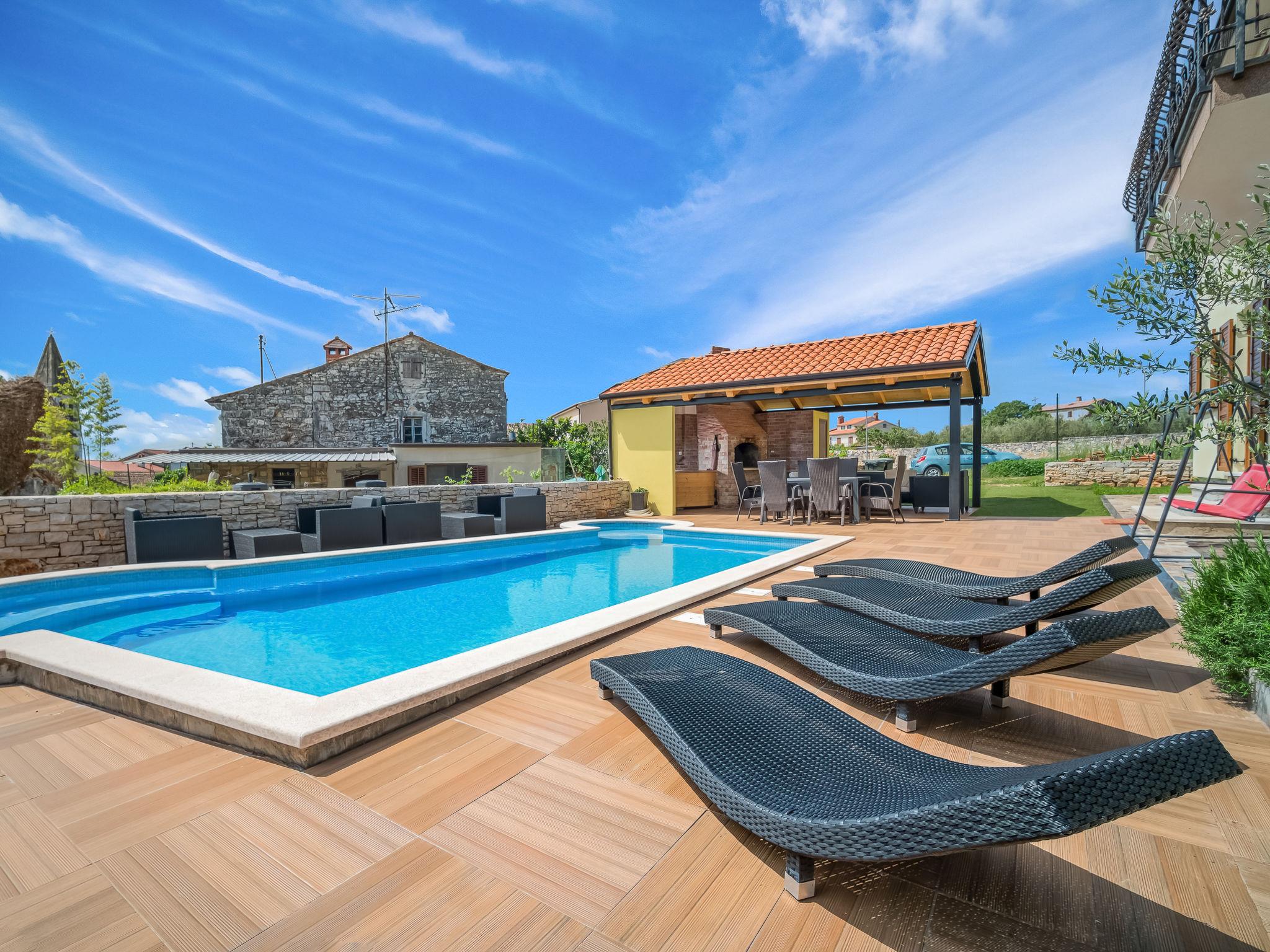 Tar 7 km von Porec: Schönes Mehrfamilienhaus "Ulika". 200 m vom Zentrum von Tar, ruhige, sonnige Lage, 3 km vom Meer, 3 km vom Strand. Zur Mitbenutzung: Grundstück 700 m2, Garten mit Rasen, Schwimmbad (32 m2, 110 - 140 cm tief, saisonale Verfügbarkeit: 15.Apr. - 15.Okt.) mit Innentreppe. Ungleichmässige Schwimmbadform, Kinderbecken, Aussendusche, Grill. Im Hause: Internetzugang, Zentralheizung. Parkplatz beim Haus auf dem Grundstück. Supermarkt 500 m, Restaurant 50 m, Bushaltestelle 300 m, Kieselstrand 3 km, Felsstrand 3 km, Strandbad 3 km. Tennis 3 km, Wanderwege ab Haus 100 m, Radweg 150 m. Schwimmbad mit Hydromassage.