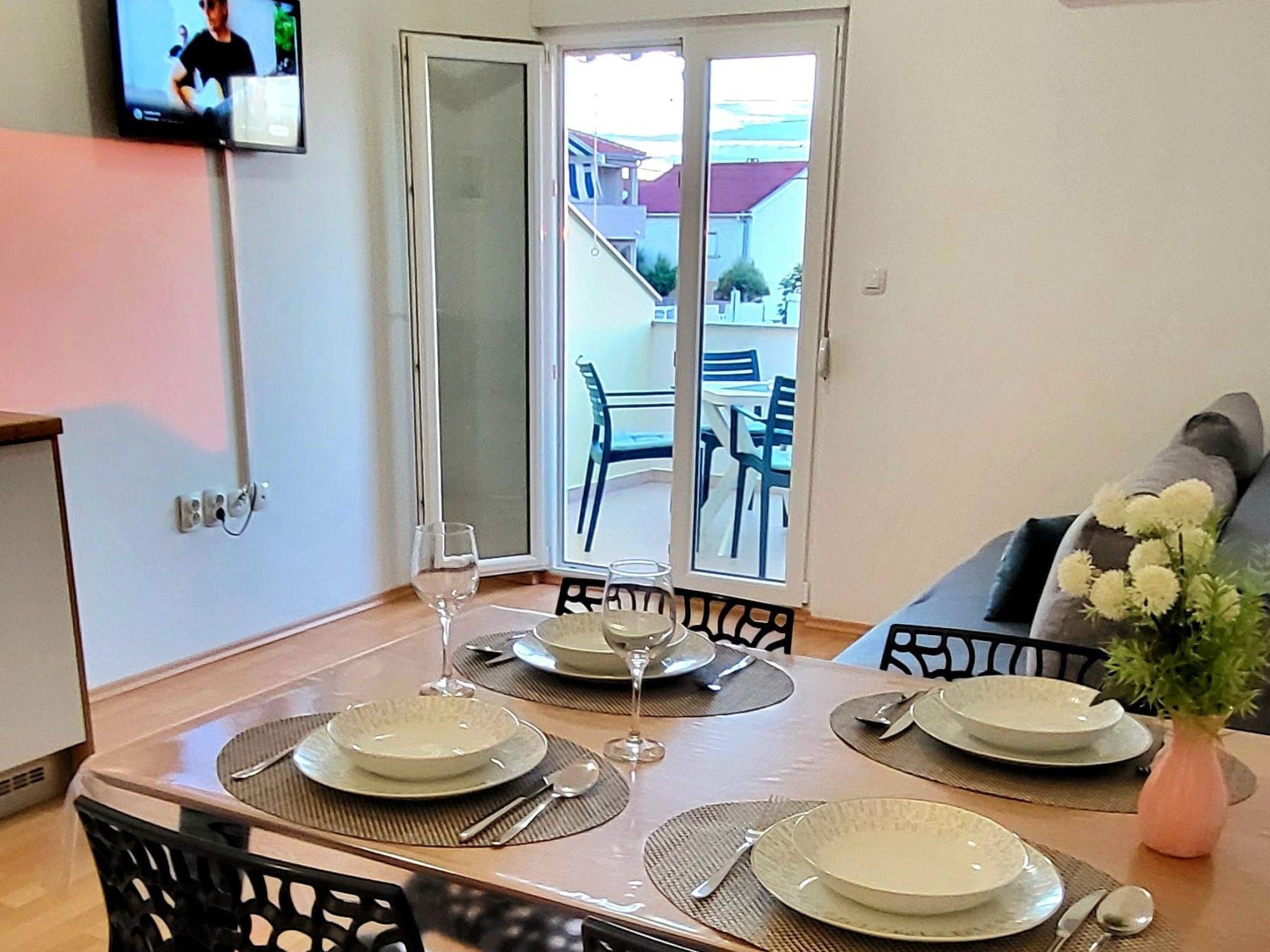 Vom Balkon mit Gartenmöbeln genießen Sie einen wunderbaren Blick auf das Meer und den Velebit Berg.