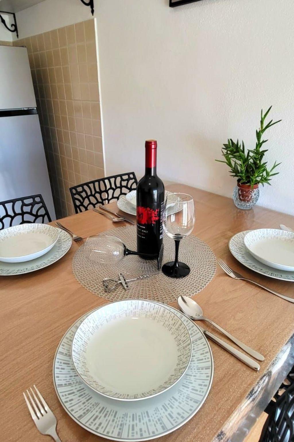 Das Appartement liegt auf der ersten Etage und bietet bis zu vier Personen Platz. Es verfügt über ein Schlafzimmer mit einem Doppelbett sowie einer Schlafcouch im Wohnbereich. Im Wohn- und Essbereich steht zudem ein Fernseher mit Sat.-TV, ein Esstisch mit Stühlen sowie die kleine Küchenzeile, die mit allen erforderlichen Küchengeräten ausgestattet ist. Das Badezimmer ist mit einer Dusche eingerichtet. Zudem sind Klimaanlage und Wlan-Internet verfügbar.