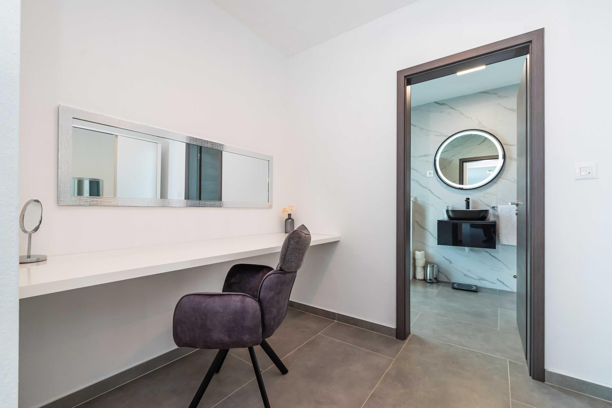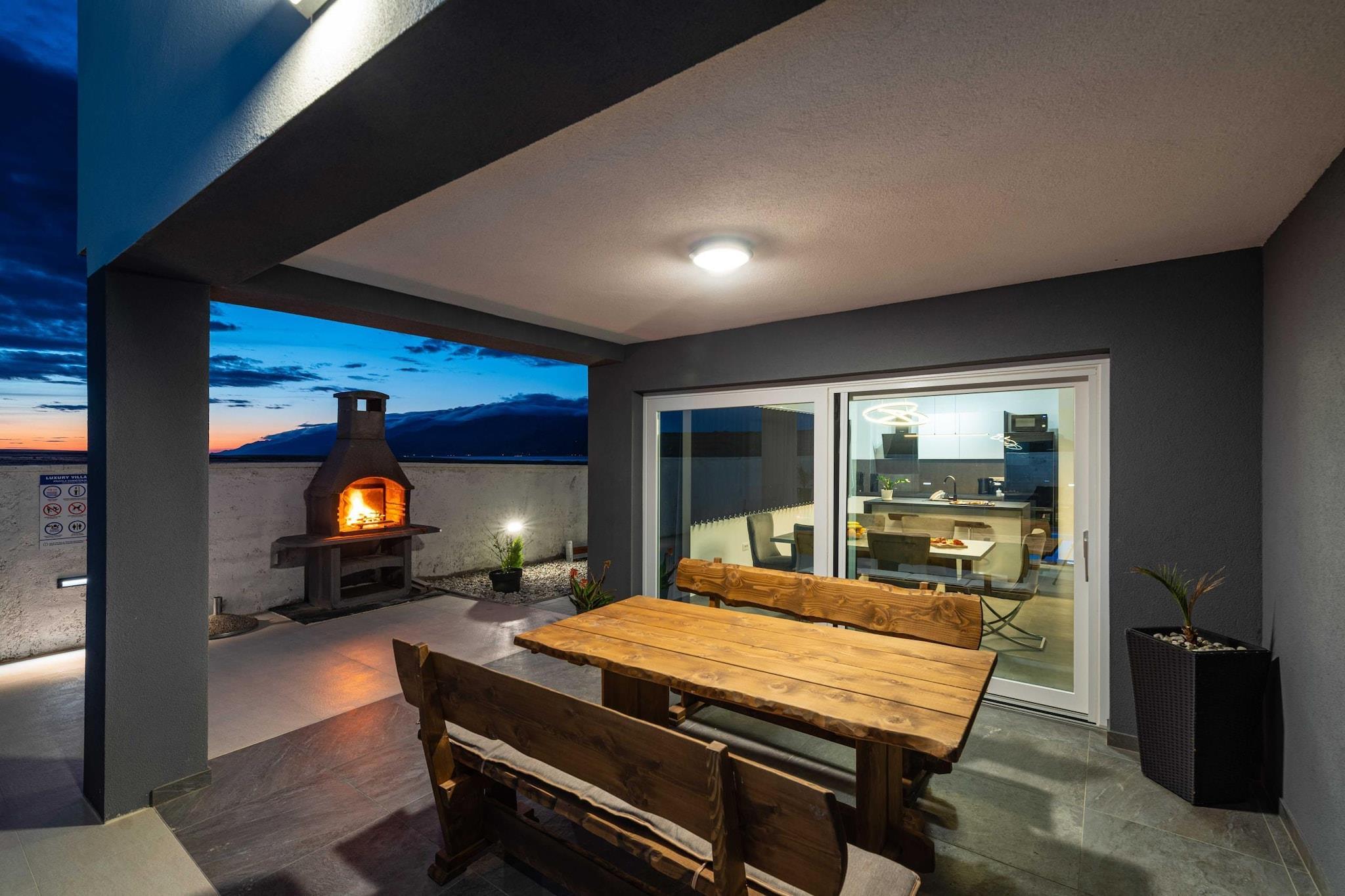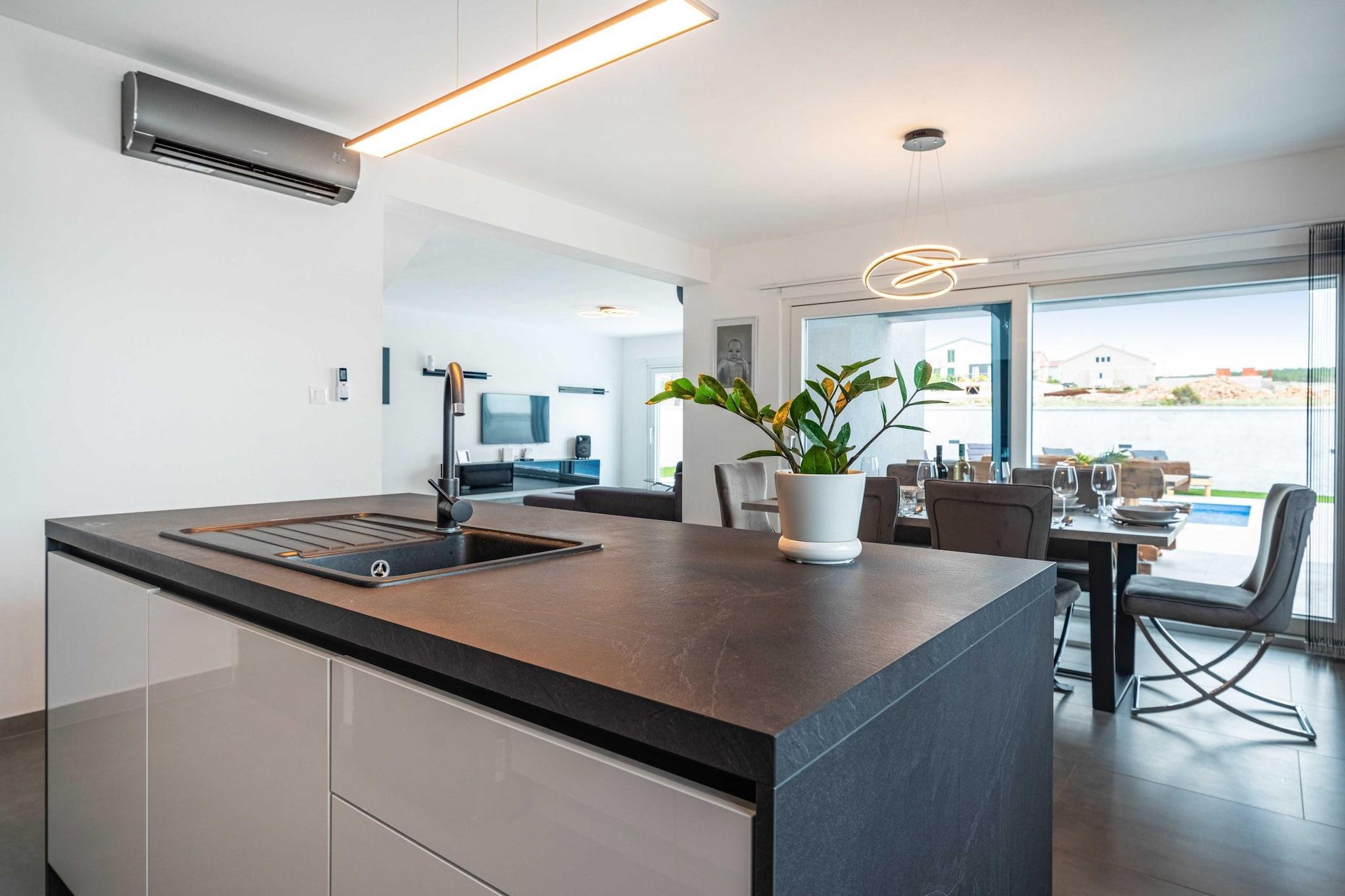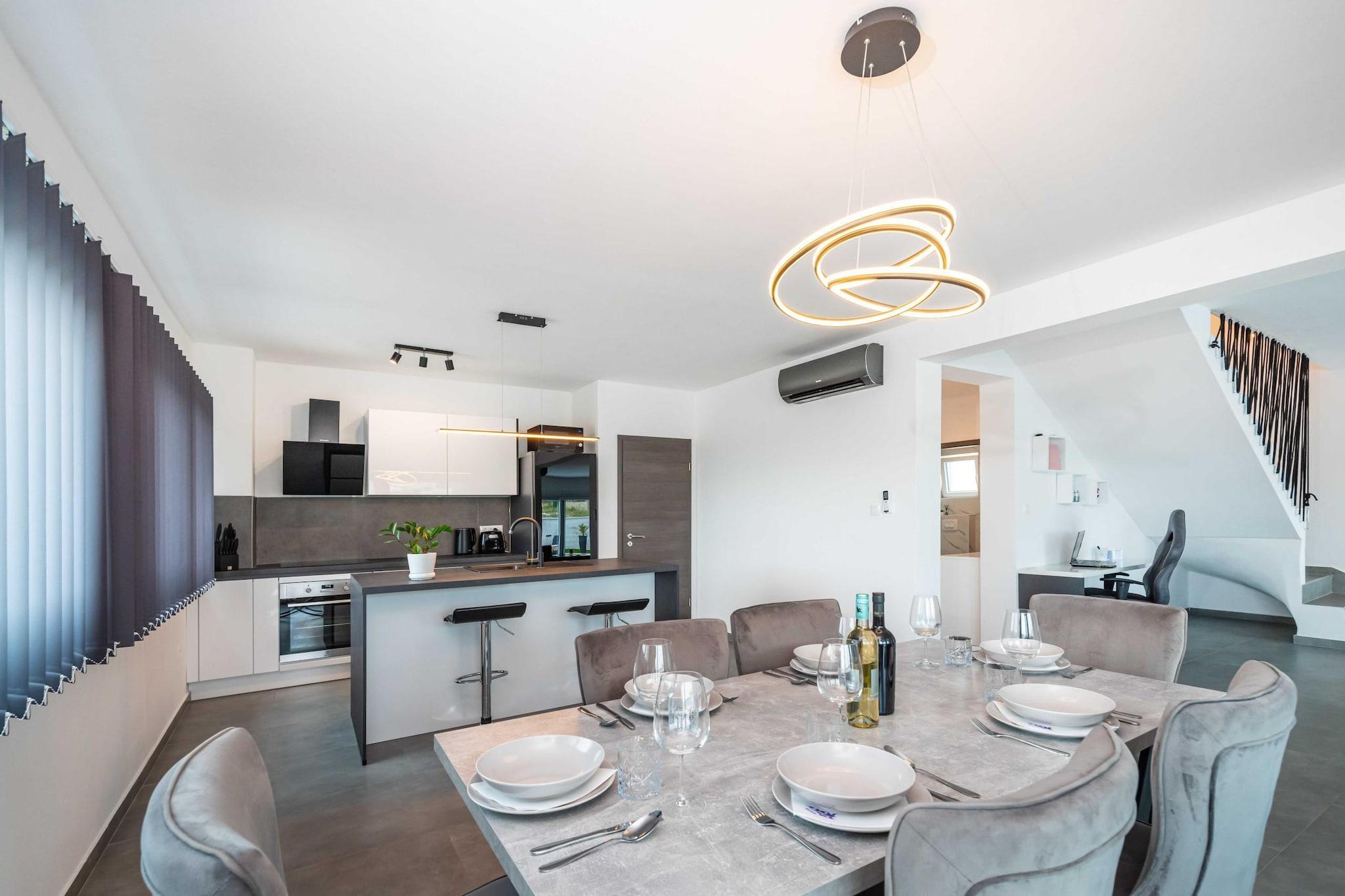 Diese atemberaubende, neu erbaute Villa in Ražanac verspricht die perfekte Kombination aus Luxus, Privatsphäre und erstklassiger Lage. Nur knapp 200 Meter vom nächsten Strand entfernt, bietet diese wunderschöne, 155 m² große Villa bequem Platz für bis zu sechs Erwachsene und zwei Kinder. Genießen Sie den atemberaubenden Panoramablick auf die Adria und das imposante Velebit-Gebirge, den Sie am besten vom privaten Poolbereich oder dem Balkon im Obergeschoss aus bewundern können. Die Villa besticht durch ein modernes, helles und außergewöhnlich komfortables Interieur mit Klimaanlage in allen Räumen. Sie verfügt über drei schöne, klimatisierte Schlafzimmer, jeweils mit eigenem Bad (insgesamt drei Badezimmer plus ein zusätzliches WC). Die Schlafmöglichkeiten umfassen zwei Kingsize-Betten, ein Queensize-Bett und ein Schlafsofa. Der großzügige, offene Wohn-/Essbereich und die voll ausgestattete Küche (mit Induktionskochfeld, Geschirrspüler, Backofen und großem Kühl-/Gefrierschrank) gehen nahtlos in den Außenbereich über. Der Innenhof ist von hohen Mauern umgeben und bietet Ihnen absolute Privatsphäre, um den Pool, die Sonnenliegen und die überdachte Terrasse mit Grillmöglichkeit ungestört zu genießen. Die Villa ist ideal gelegen für Entspannung und Abenteuer gleichermaßen. Lokale Restaurants, Cafés und Supermärkte erreichen Sie in nur fünf Gehminuten. Naturliebhaber können den Nationalpark Paklenica erkunden, der nur eine halbe Stunde entfernt liegt. Zadar ist 20 Autominuten entfernt, und die Insel Pag liegt etwa 10 km entfernt, erreichbar über eine Brücke. Auch der Krka-Nationalpark und der Plitvicer Seen-Nationalpark sind innerhalb einer Autostunde zu erreichen. Bitte beachten Sie, dass Rauchen und Haustiere nicht gestattet sind und Gruppen von Jugendlichen unter 25 Jahren nicht akzeptiert werden.