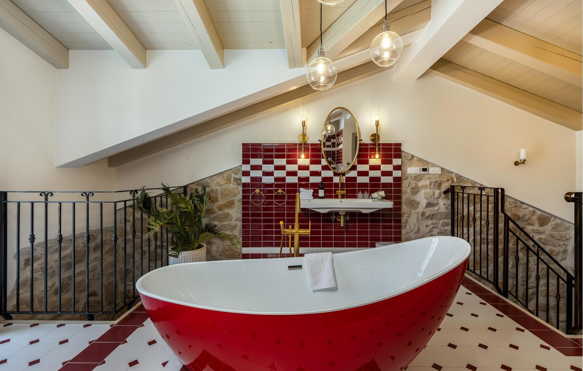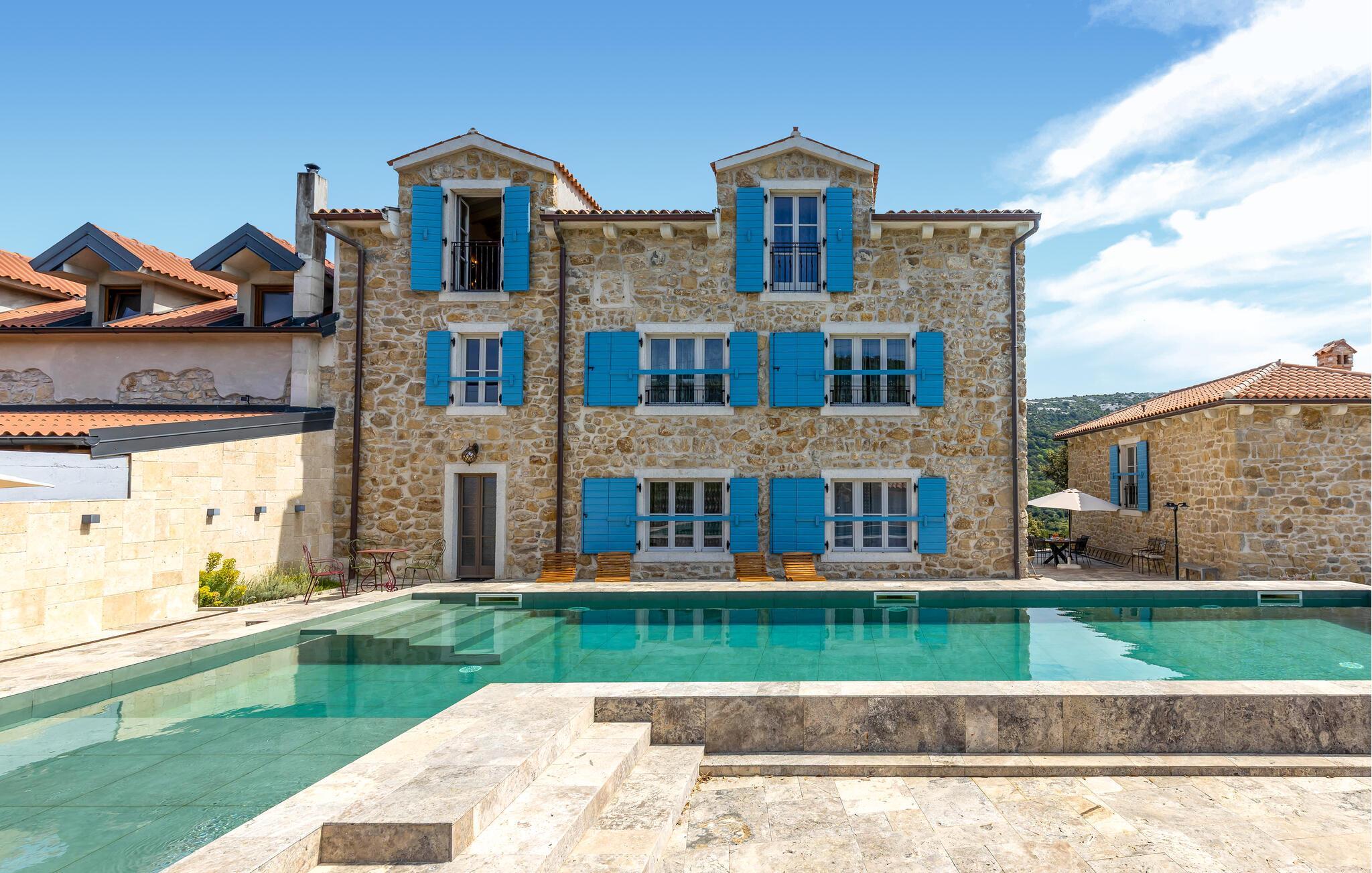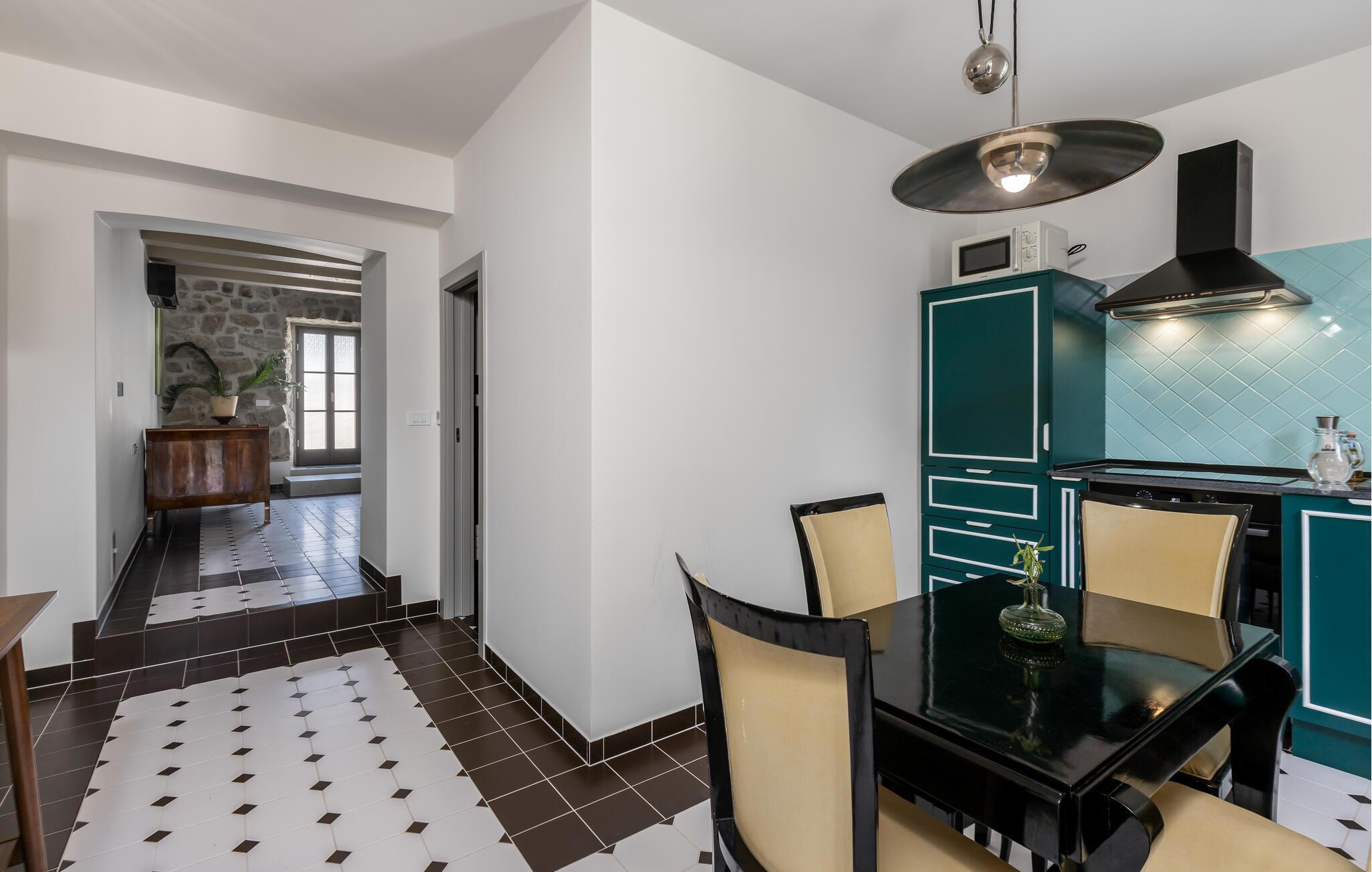 Genießen Sie Ihre Auszeit in diesem stilvoll eingerichteten Ferienhaus inmitten der Natur. Das Haus ist Teil eines traditionellen Steingehöfts, das hochwertig restauriert wurde und über einen großen Gemeinschaftspool verfügt. Verbringen Sie entspannte Stunden im charmanten Innenbereich mit offenem Wohn- und Essraum. Die sichtbaren Steinmauern, rustikalen Holzbalken und modernen Möbel schaffen eine warme Atmosphäre. Nutzen Sie die voll ausgestattete Küche mit stilvollen Fronten und bereiten Sie gemeinsame Mahlzeiten zu. Ruhen Sie sich auf dem gemütlichen Sofa aus oder verbringen Sie den Abend mit einem Glas Wein im Wohnzimmer.