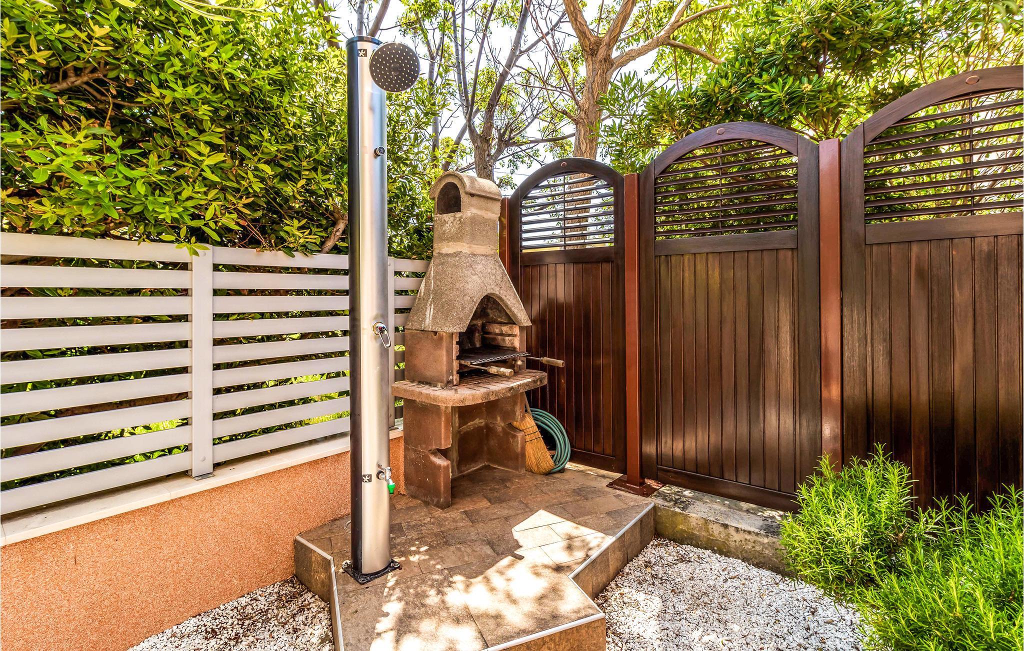 Draußen erwartet Sie ein gepflegter Außenbereich mit überdachtem Pavillon mit hochwertigen Gartenmöbeln, Grill und einer Außendusche. Entspannen Sie hier und genießen Sie angenehme Stunden im Freien.