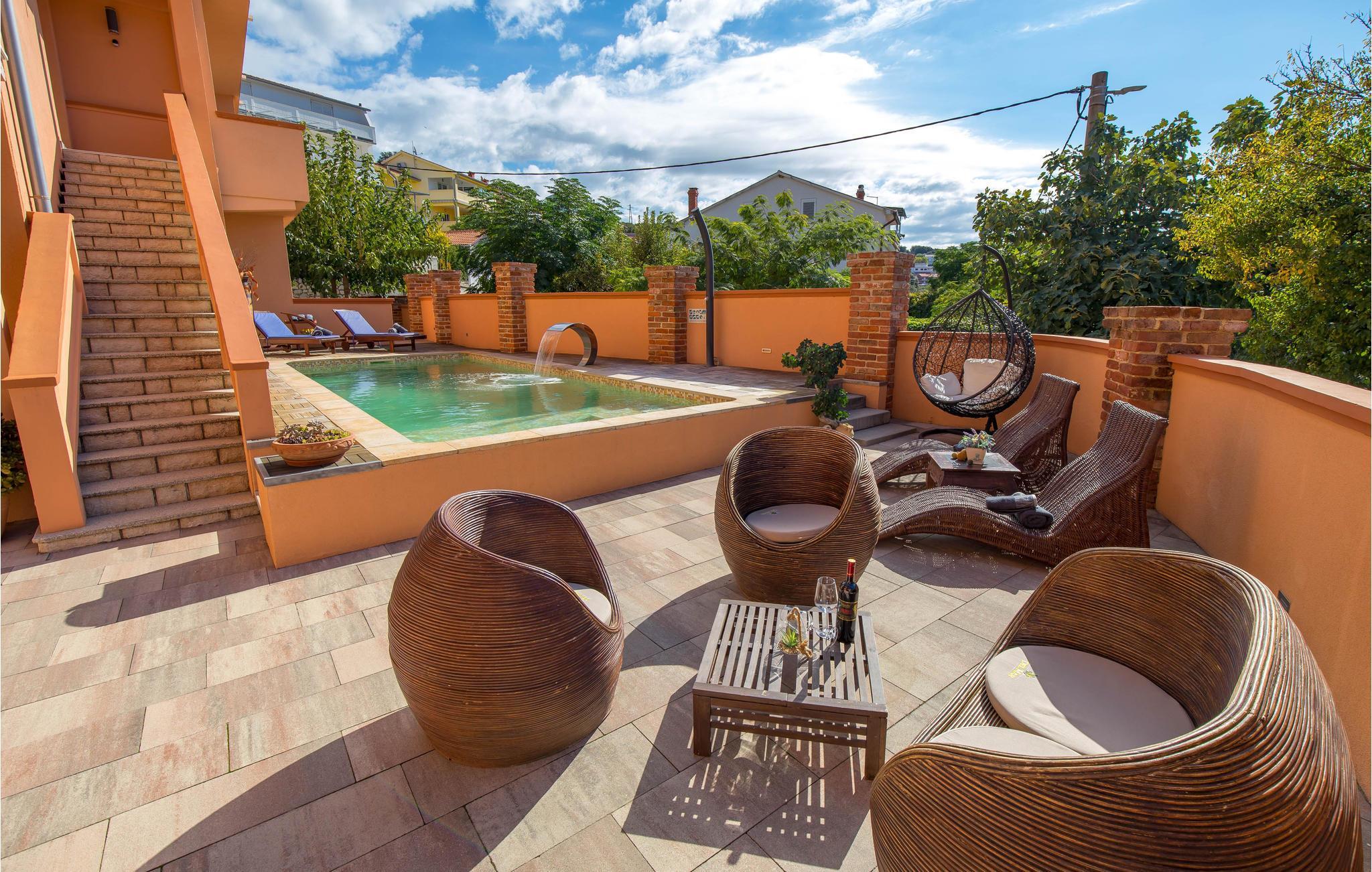 Die Apartments sind geräumig, komfortabel, gut ausgestattet und bestehen aus zwei Etagen. Es gibt eine gemeinsame überdachte Terrasse, auf der sich ein gemeinsamer Grill befindet, um Ihre Lieblingsgerichte zuzubereiten und am kroatischen Leben etwas teilzunehmen. Für Gäste, die aktiv sein möchten, gibt es einen gemeinsamen Aktivitätsraum, der sich im Erdgeschoss befindet, in einem separaten Teil des Hauses. Hier finden Sie Fahrrad, Laufband, Tischtennis und Billard. Für diejenigen, die sich entspannen möchten, gibt es gegen Gebühr einen Wellnessbereich, bestehend aus einem Whirlpool und einer finnischen Sauna. Die Terrassen der Wohnung sind zum Meer hin orientiert und laden tagsüber oder abends zum Entspannen ein, somit können Sie Ihren ersten Kaffee am Morgen oder den Sonnenuntergang genießen.