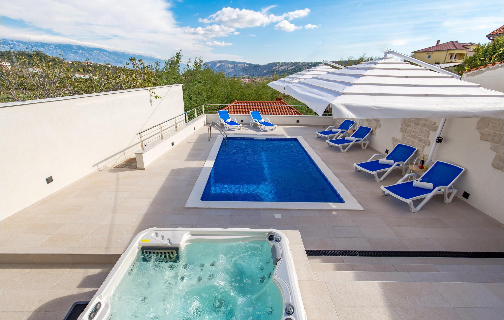 Auf der paradiesischen Insel Rab, im Ort Lopar, befindet sich dieses wunderbare Ferienhaus mit Pool und teilweisem Meerblick. Dieses traumhafte Haus lässt absolut keine Wünsche offen. Neben den großzügigen Terrassen, dem erfrischenden Außenpool und dem Whirlpool auf dem umzäunten Grundstück laden auch die lichtdurchfluteten und geschmackvoll eingerichteten Innenräume zum Entspannen ein. Hier erwartet Sie eine überdachte Grillterrasse, die etwas vom Haus entfernt ist und auf der Sie mit Familie und Freunden köstliche Mahlzeiten zubereiten und genießen können. Ein wichtiger Aspekt ist die wunderschöne Lage, da Sie die fantastischen Sandstrände auch zu Fuß erreichen können. Erkunden Sie während Ihres Aufenthaltes einige der versteckten Buchten, für die die Insel Rab bekannt ist. Vom Festland erreichen Sie die Insel sehr gut mit der Fähre und während der Sommermonate finden dort viele Veranstaltungen statt. Der Hauptort der Insel ist die gleichnamige Stadt Rad mit kulturhistorischen Denkmälern. Der Ort Lopar ist ein beliebter Badeort besonders für Familien mit Kleinkindern, die auf dem leicht abfallenden Sandstrand, der auch als Paradiesstrand bekannt ist, herrlichen Wasserspaß erleben können. Malerische Buchten, klares Wasser, historische Städte und kulturelle Sehenswürdigkeiten sind die Besonderheiten, die Besucher auf der Insel Rab zum Verweilen einladen.