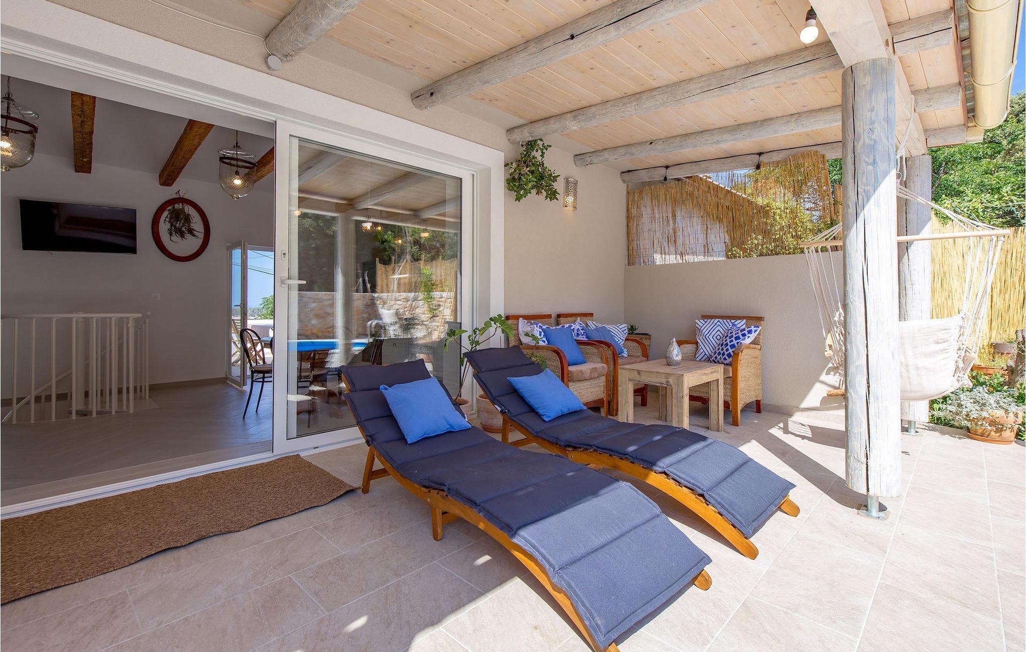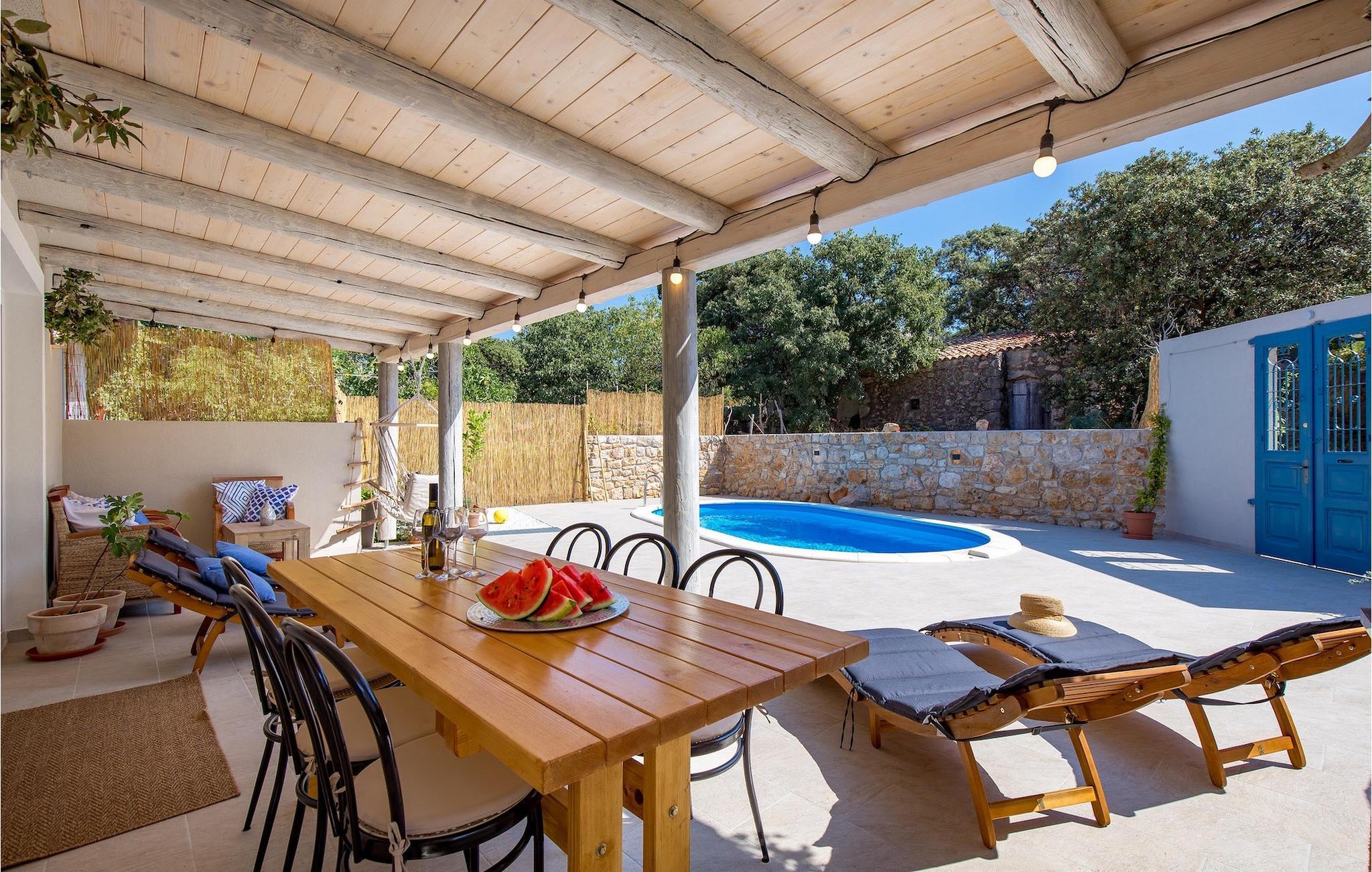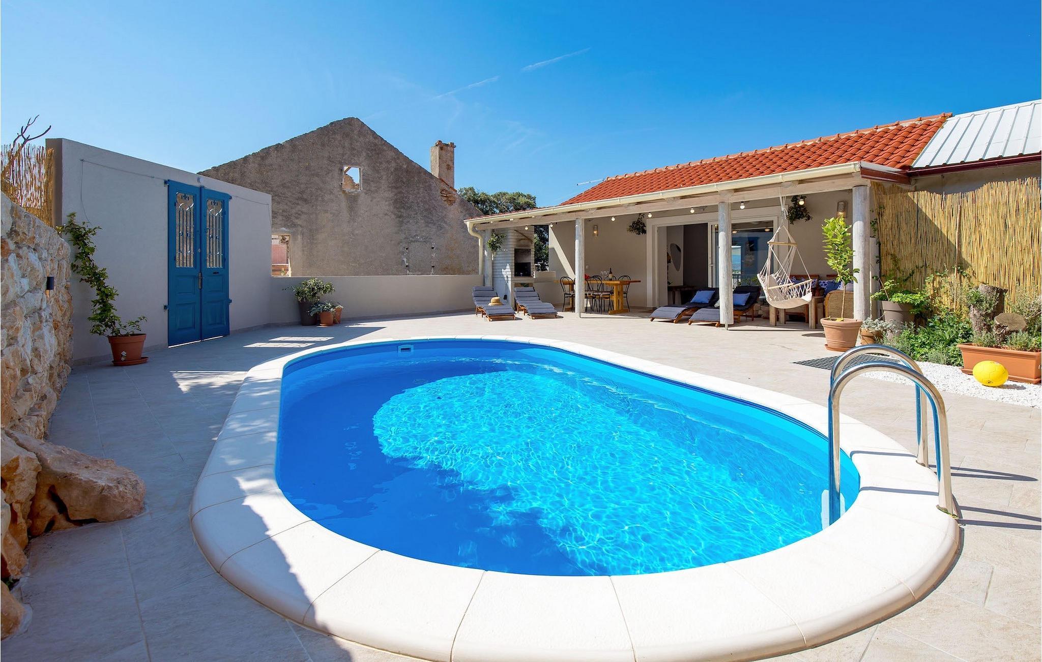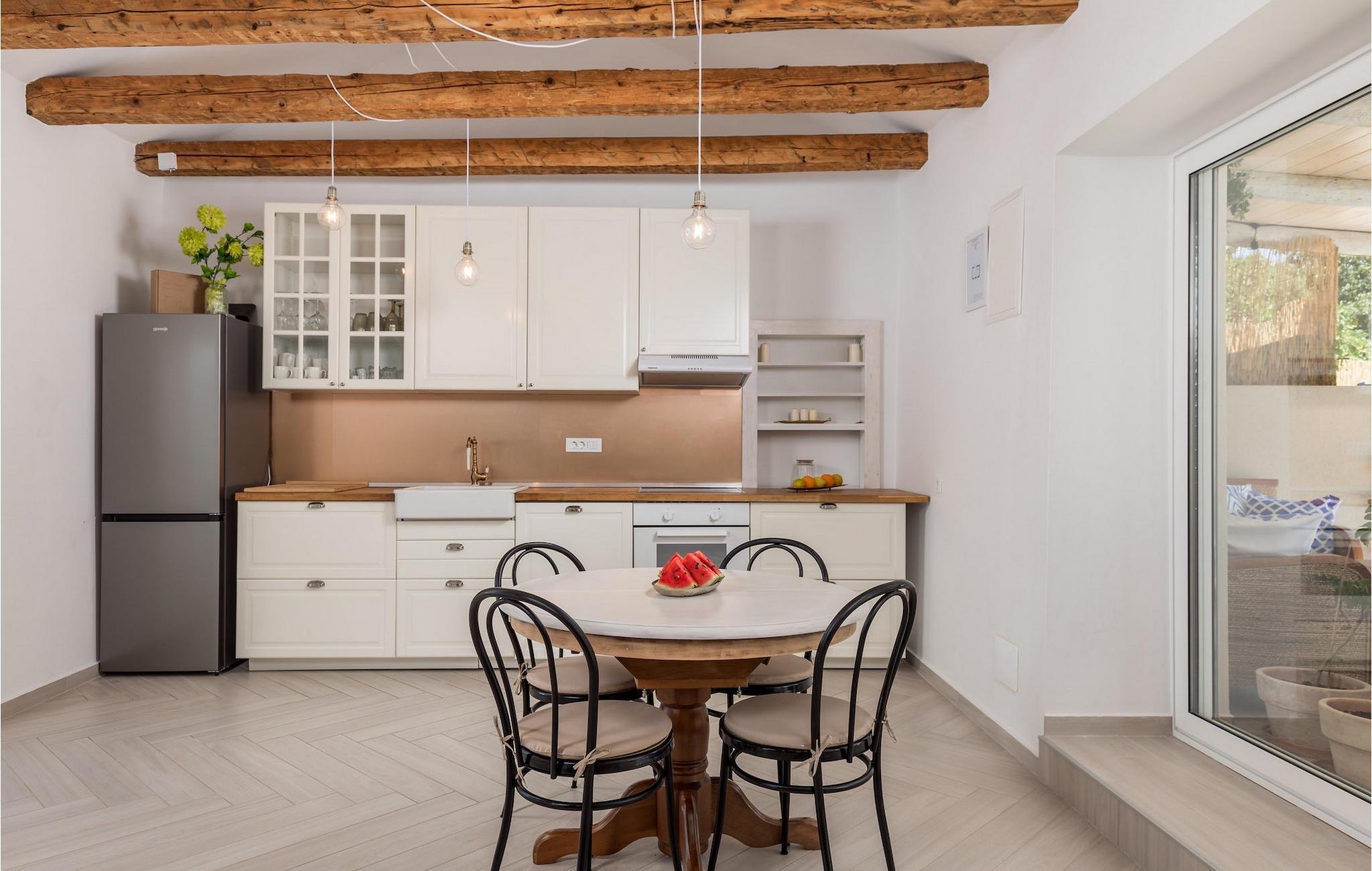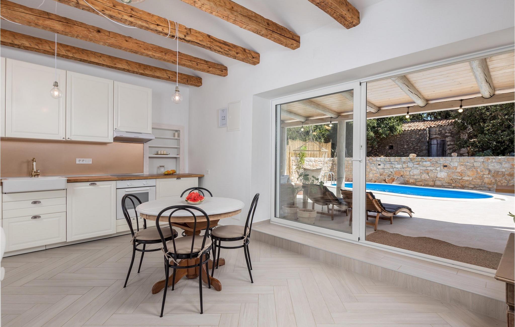 Die charmante Villa Fjaka Rab ist ideal für Liebhaber von Urlaub fernab von Problemen am Meer, Sonne und unberührter Natur der schönen Insel Rab. Diese Villa zeichnet sich durch seine Lage 300 m vom Strand entfernt, die Liebhaber der Nähe zum Meer wird sicherlich zu schätzen wissen. Die Villa ist auch für Haustiere geeignet. Am Eingang der Villa erwartet Sie ein schöner 20 m2 großer Swimmingpool, in dem Sie sich erfrischen können. Entspannen Sie sich auf den Liegestühlen am Pool oder machen Sie ein Nickerchen in der Hängeschaukel. Versuchen Sie sich an der Zubereitung traditioneller Meeresfrüchte-Spezialitäten auf dem Grill vor der Villa. Verbringen Sie unvergessliche Momente mit zubereiteten Mahlzeiten und Lachen mit Ihren Liebsten im überdachten Bereich vor der Villa mit einem Esstisch für 8 Personen. Auf der Ebene des Pools, im Inneren der Villa gibt es einen offenen Bereich mit einer voll ausgestatteten Küche, ein Esszimmer mit 8 Sitzplätzen und Zugang zum Pool, ein Wohnzimmer und ein Badezimmer. In der unteren Etage befinden sich 3 Schlafzimmer mit Doppelbetten und 2 separate Bäder. Das Innere der gesamten Villa strahlt Meer und nautischen Charme aus. Auf dem Balkon der Villa können Sie Ihren Morgen mit Kaffee, mediterraner Atmosphäre und einem wunderschönen, unwiederholbaren Idyllische Aussicht verbringen. Buchen Sie einen tollen Urlaub auf der Insel des Glücks in der Villa Fjaka Rab. Die Villa Fjaka Rab befindet sich im Dorf Barbat auf der Insel Rab. Die Insel Rab liegt an der nordöstlichen Seite der Adria und ist für ihre wunderschönen Sandstrände, Buchten und das kristallklare Meer bekannt. Barbat ist ein bezaubernder Ort, an dem Sie von der Gastfreundschaft der lokalen Bevölkerung und dem gastronomischen Angebot verzaubert werden, bei dem Sie unbedingt die Spezialität von Barbat, die Garnelen, probieren müssen. Erkunden Sie diese wunderschöne Insel des Glücks auf zahlreichen Rad- und Wanderwegen umgeben von duftenden Pinien. Rab bietet zahlreiche gastronomische Einrichtungen, in denen Sie abends bestimmt viel Spaß haben werden. Lassen Sie sich die traditionelle Raber Messe, das älteste und größte mittelalterliche Sommerfest in Kroatien, nicht entgehen. Beim Rab-Fest können Sie auch lokale Fischspezialitäten probieren, sich einen Rab-Kuchen gönnen und andere Köstlichkeiten und Souvenirs genießen, die von den Einheimischen selbst hergestellt wurden. Geschichts- und Kulturliebhaber werden von der wunderschönen Kathedrale von Rab, von deren Glockenturm aus Sie einen magischen Panoramablick genießen können, einem bezaubernden Platz, einem Kloster, zahlreichen Steinstraßen und anderen Kulturdenkmälern begeistert sein. Von der Kathedrale von Raba steigen Sie zum Hauptstrand der Stadt ab. Für Liebhaber eines aktiven Urlaubs ist Barbat ein beliebtes Ziel für Segler. Begeben Sie sich mit dem Boot oder Kajak auf ein Rab-Abenteuer und entdecken Sie andere Orte auf Rab wie Lopar, Banjol, Palit, Kampor. Machen Sie Tagesausflüge zu den Nachbarinseln Krk, Cres und Pag.