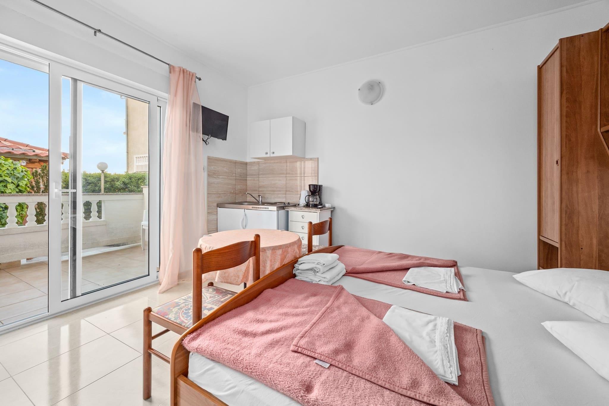 Dieses charmante Studio-Apartment bietet zwei Gästen einen komfortablen Aufenthalt und verfügt über ein großes Doppelbett, eine Küchenzeile und einen Esstisch. Es verfügt über ein modernes Badezimmer mit Dusche und eine private Terrasse mit herrlichem Meerblick. Das Apartment ist klimatisiert und bietet WLAN-Zugang für einen erholsamen Aufenthalt. Haustiere sind nicht erlaubt und es werden keine Jugendgruppen aufgenommen. Kostenlose Privatparkplätze stehen vor Ort zur Verfügung. Bei längeren Aufenthalten bieten die Gastgeber auf Anfrage einen Wäscheservice an. Das Studio liegt auf der malerischen Insel Rab, im ruhigen Viertel Barbat, nur 500 Meter vom Sandstrand entfernt. Gäste können die reiche Geschichte der Insel erkunden, indem sie die antike griechische Militärfestung auf dem Hügel St. Damian besichtigen oder durch die engen Gassen der Altstadt von Rab schlendern. Naturliebhabern bietet der Waldpark Komrcar eine schattige Oase zum Spazierengehen. Darüber hinaus bietet die Unterkunft einfachen Zugang zur Fähre von Stinica nach Misnjak, die die Insel mit dem Festland verbindet und so Reisen erleichtert. Das Apartment verfügt über eine voll ausgestattete Küchenzeile mit allen wichtigen Annehmlichkeiten wie Kühlschrank, Herd und Kaffeemaschine, sodass Gäste Mahlzeiten zubereiten können. Gäste haben außerdem Zugang zu einer Gemeinschaftsterrasse mit Essbereich im Freien und einer Sommerküche, die mit Gasgrill und Geschirrspüler ausgestattet ist. Wer die umliegenden Inseln erkunden möchte, kann nach vorheriger Anmeldung ein kleines Boot nutzen.