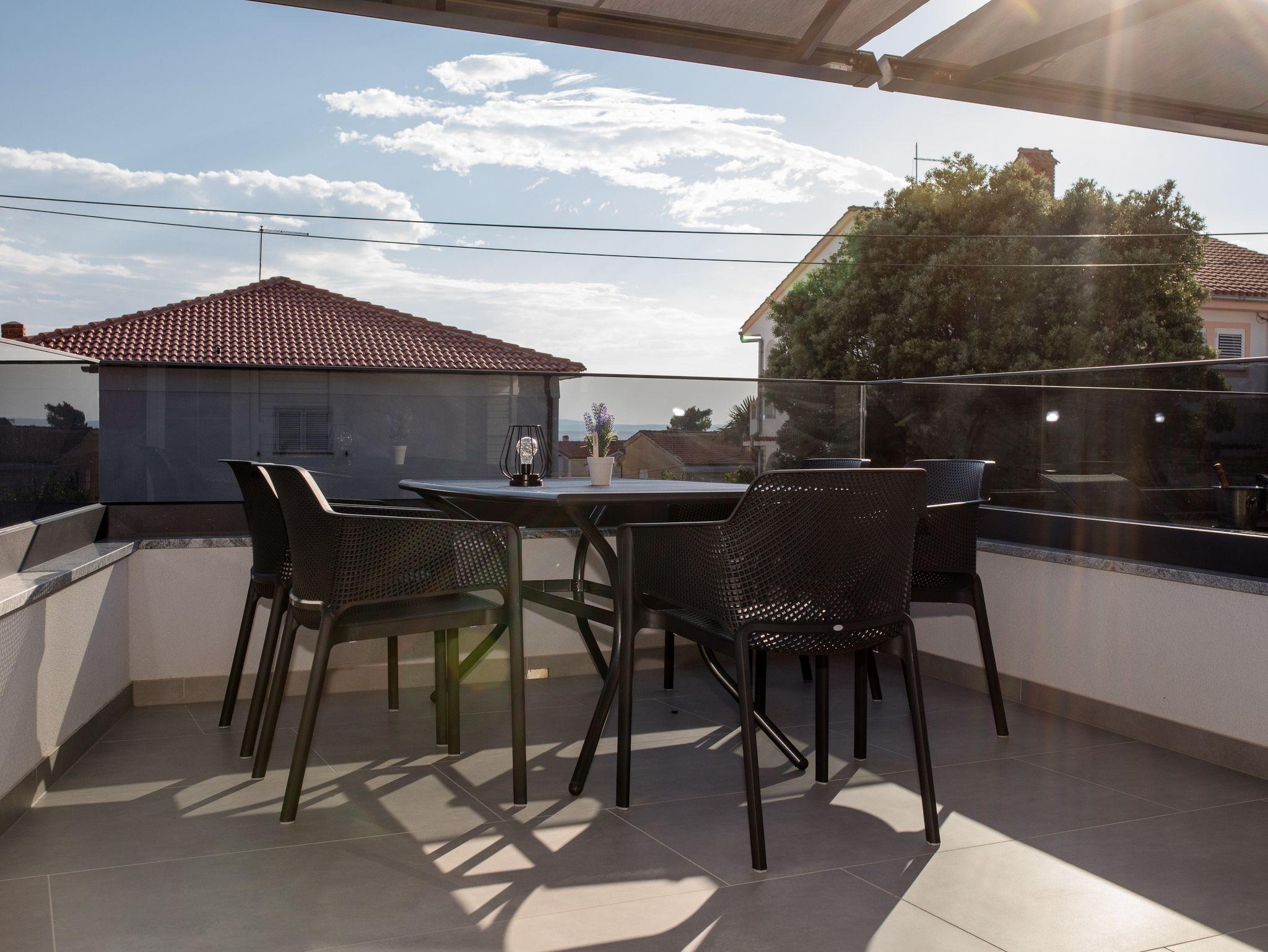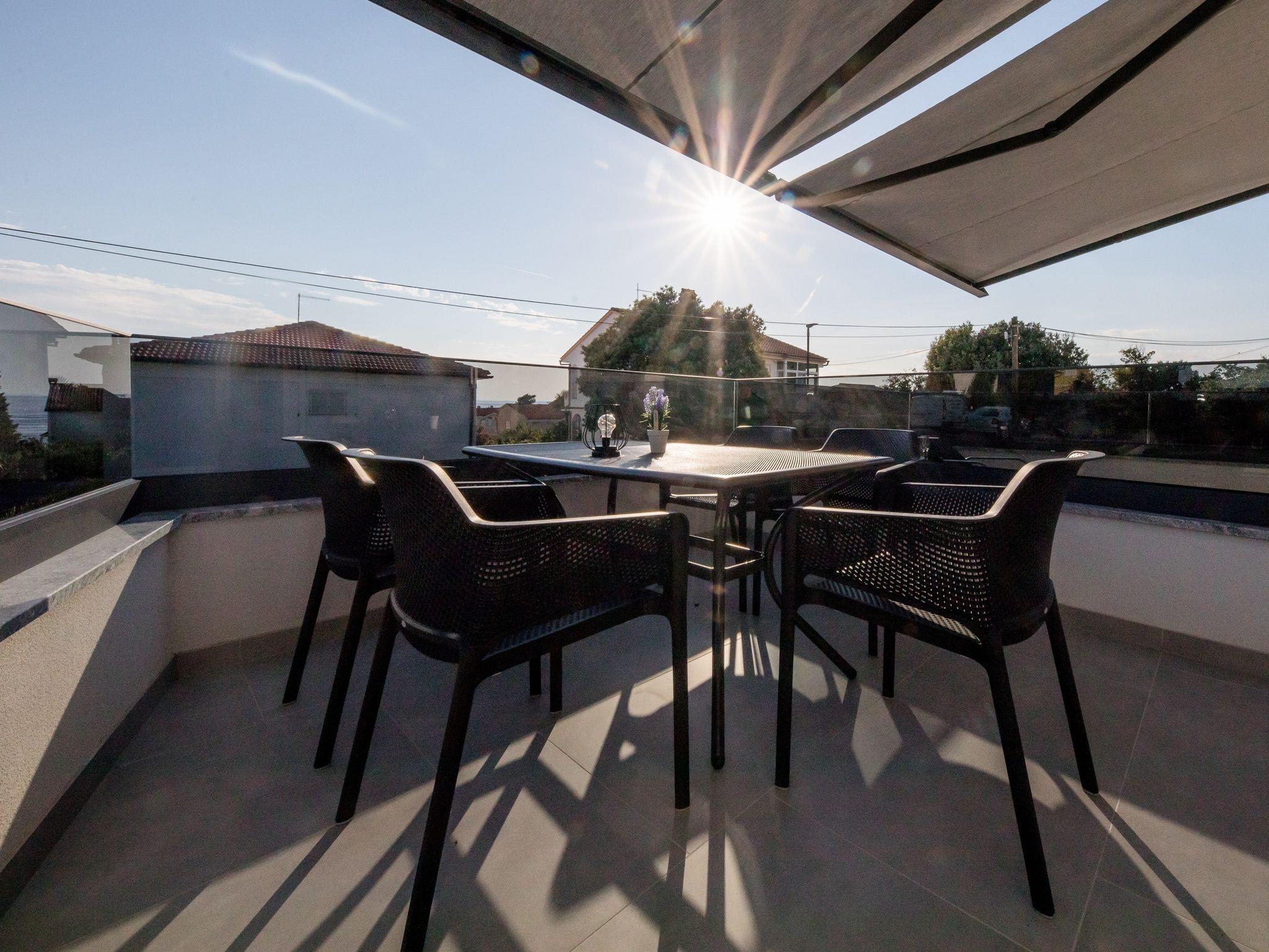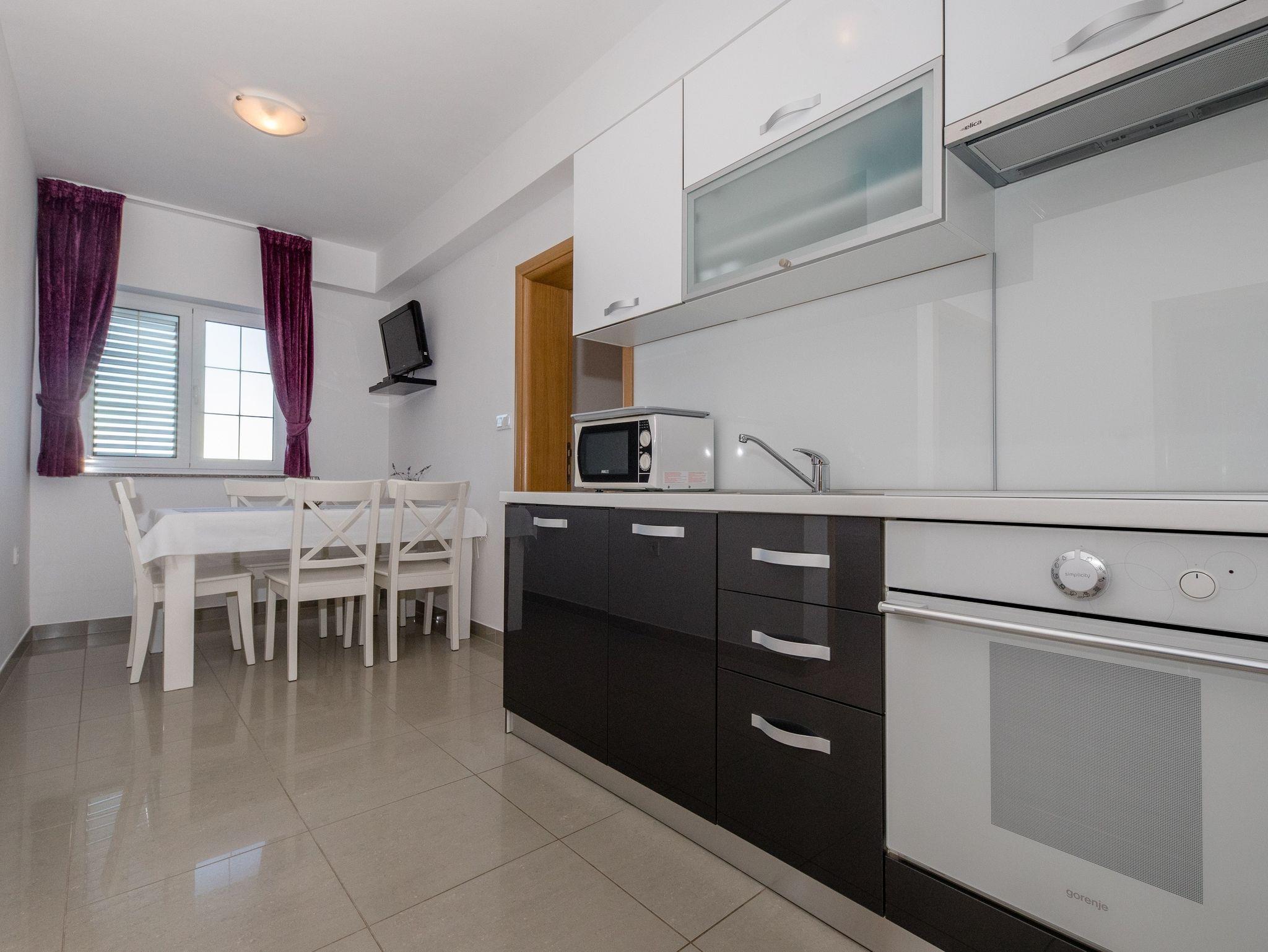 Ferienwohnung bietet Platz für 5 Gäste. Die Betten sind in Schlafzimmern, die es 2 gibt, innerhalb einer Gesamtfläche von 39m2, angeordnet. Die Gäste haben eine eigene Terrasse zur Verfügung, auf der sie in warmen Sommernächten genießen können. Das Apartment bietet Meerblick. Es ist erlaubt, Speisen auf dem Gemeinschafts-Grill vorzubereiten. IM PREIS INBEGRIFFEN: Kurtaxe, Endreinigung, Klimatisierung, Parkplatz, Internet. VERBINDLICHE ZUSÄTZLICHE KOSTEN: Aufzahlung für Kurzaufenthalte (prozentualer Zuschlag pro Nächtigungsanzahl: 30% - 1, 20% - 2, 10% - 3). UNVERBINDLICHE ZUSÄTZLICHE KOSTEN: Bootsanlegeplatz (25,00 € pro Nacht). Die Verfügbarkeit zusätzlicher Dienstleistungen in Ihrem reservierten Termin und die Preise derselben (falls nicht aufgeführt) müssen im Voraus überprüft werden. Zusätzliche Dienstleistungen die in der Zahlungsaufforderung nicht aufgeführt sind werden direkt beim Vermieter bezahlt, angenommen der Gast nutzt auch diese.