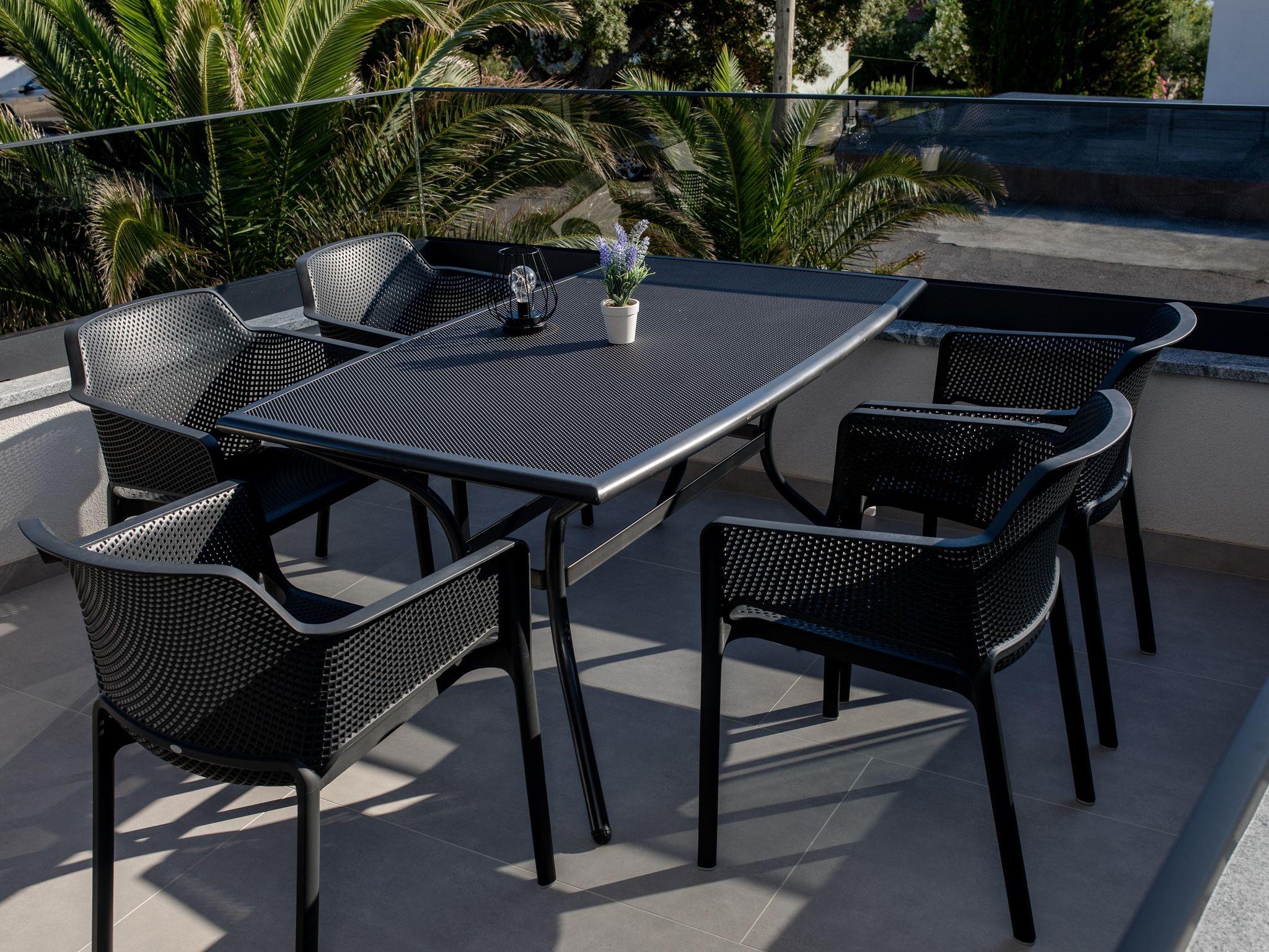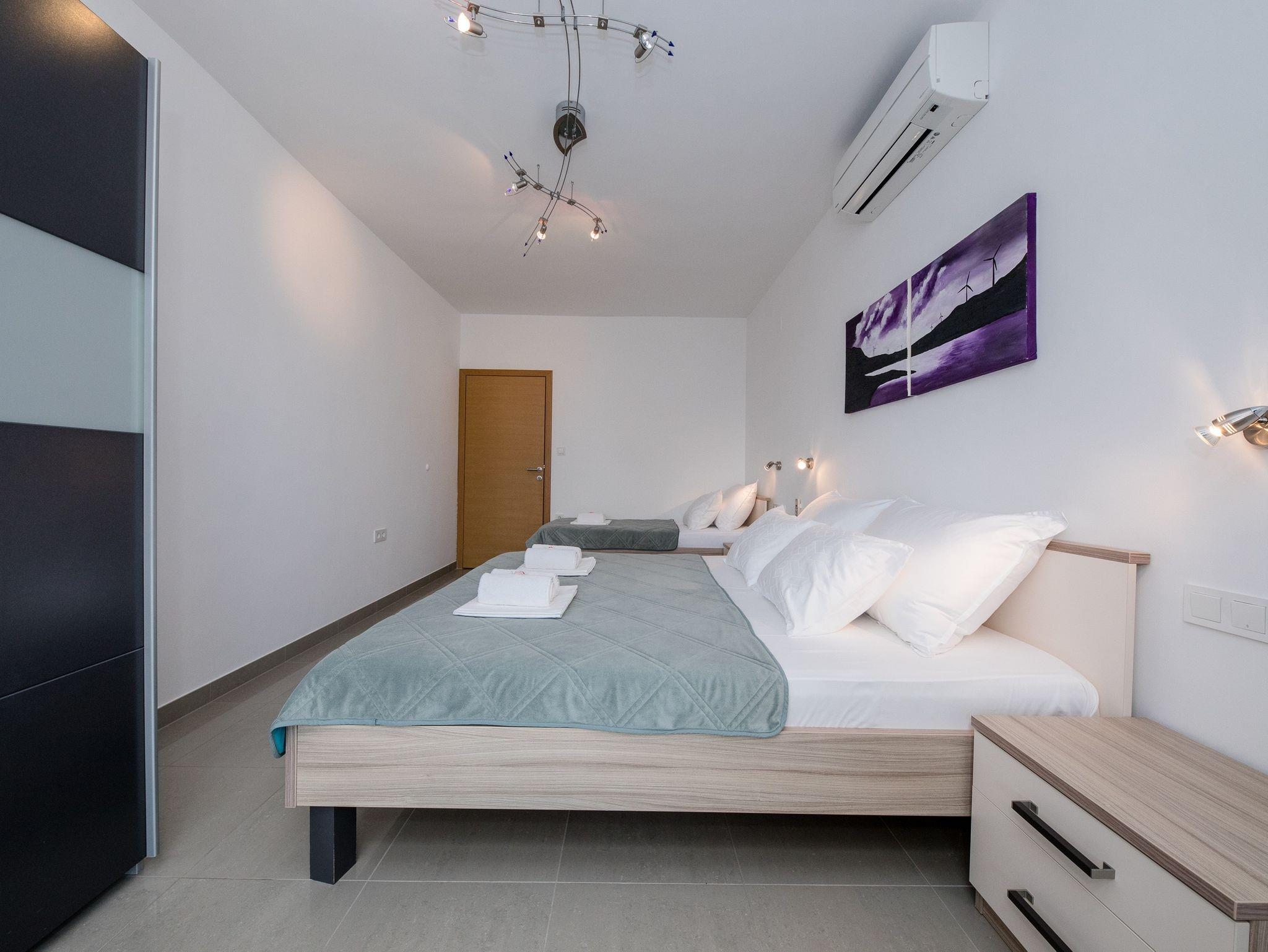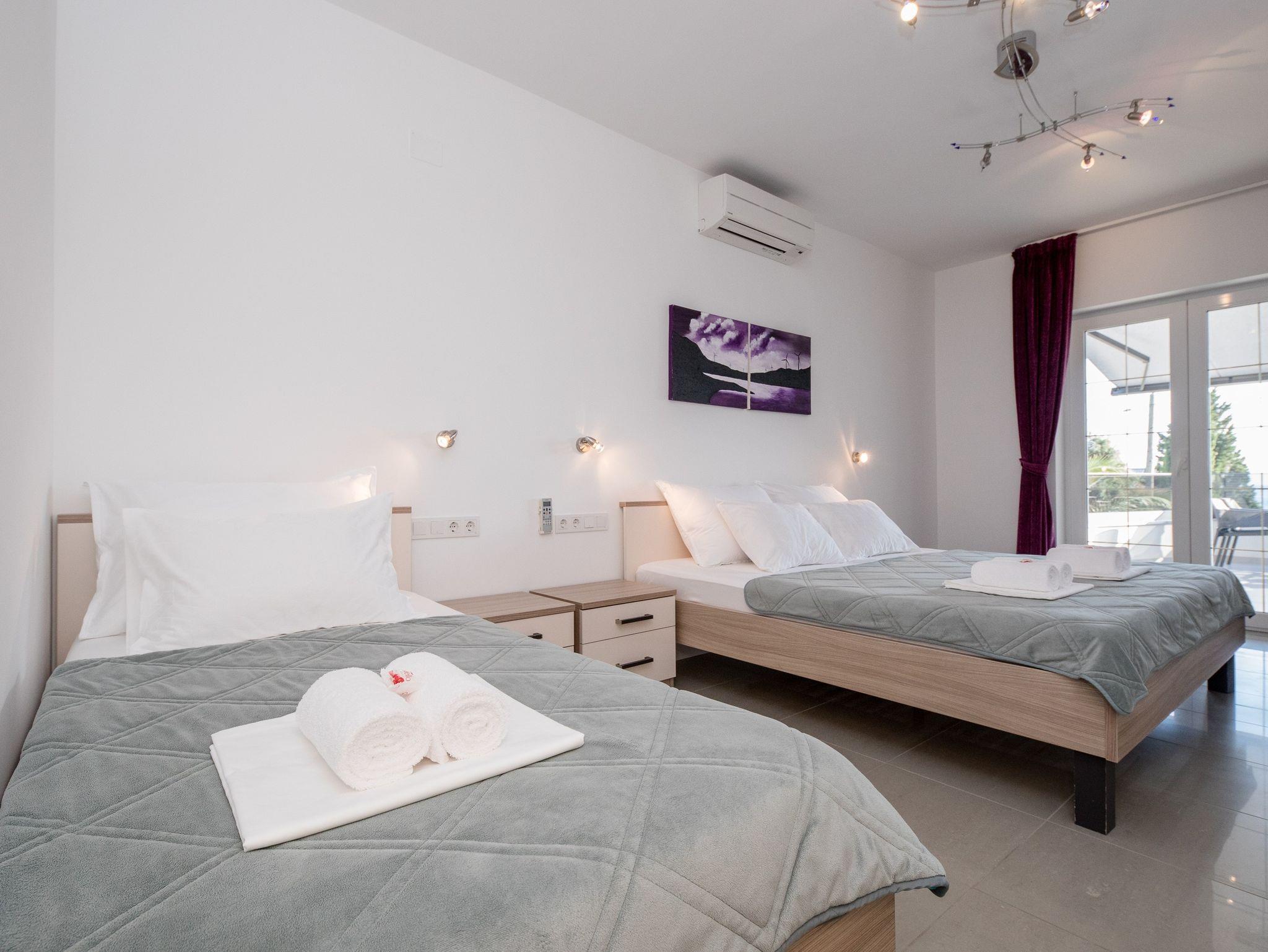 Ferienwohnung bietet Platz für 5 Gäste. Die Betten sind in Schlafzimmern, die es 2 gibt, innerhalb einer Gesamtfläche von 39m2, angeordnet. Die Gäste haben eine eigene Terrasse zur Verfügung, auf der sie in warmen Sommernächten genießen können. Das Apartment bietet Meerblick. Es ist erlaubt, Speisen auf dem Gemeinschafts-Grill vorzubereiten. IM PREIS INBEGRIFFEN: Kurtaxe, Endreinigung, Klimatisierung, Parkplatz, Internet. VERBINDLICHE ZUSÄTZLICHE KOSTEN: Aufzahlung für Kurzaufenthalte (prozentualer Zuschlag pro Nächtigungsanzahl: 30% - 1, 20% - 2, 10% - 3). UNVERBINDLICHE ZUSÄTZLICHE KOSTEN: Bootsanlegeplatz (25,00 € pro Nacht). Die Verfügbarkeit zusätzlicher Dienstleistungen in Ihrem reservierten Termin und die Preise derselben (falls nicht aufgeführt) müssen im Voraus überprüft werden. Zusätzliche Dienstleistungen die in der Zahlungsaufforderung nicht aufgeführt sind werden direkt beim Vermieter bezahlt, angenommen der Gast nutzt auch diese.