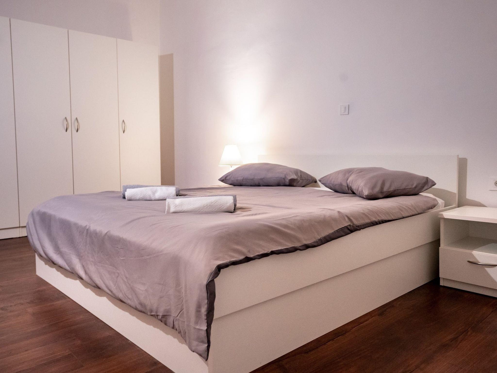 Ferienwohnung bietet Platz für 4 Gäste. Die Betten sind in Schlafzimmern, die es 1 gibt, und in Wohnzimmer, innerhalb einer Gesamtfläche von 61m2, angeordnet. Die Gäste haben einen eigenen Balkon zur Verfügung, auf der sie in warmen Sommernächten genießen können. Es ist erlaubt, Speisen auf dem Gemeinschafts-Grill vorzubereiten. IM PREIS INBEGRIFFEN: Kurtaxe, Endreinigung, Klimatisierung, Zentralheizung, Parkplatz, Internet, Kinderbett, Föhn. VERBINDLICHE ZUSÄTZLICHE KOSTEN: Aufzahlung für Kurzaufenthalte (prozentualer Zuschlag pro Nächtigungsanzahl: 30% - 1, 20% - 2, 10% - 3). UNVERBINDLICHE ZUSÄTZLICHE KOSTEN: Wäschewaschen (8,00 € Waschen). Die Verfügbarkeit zusätzlicher Dienstleistungen in Ihrem reservierten Termin und die Preise derselben (falls nicht aufgeführt) müssen im Voraus überprüft werden. Zusätzliche Dienstleistungen die in der Zahlungsaufforderung nicht aufgeführt sind werden direkt beim Vermieter bezahlt, angenommen der Gast nutzt auch diese.