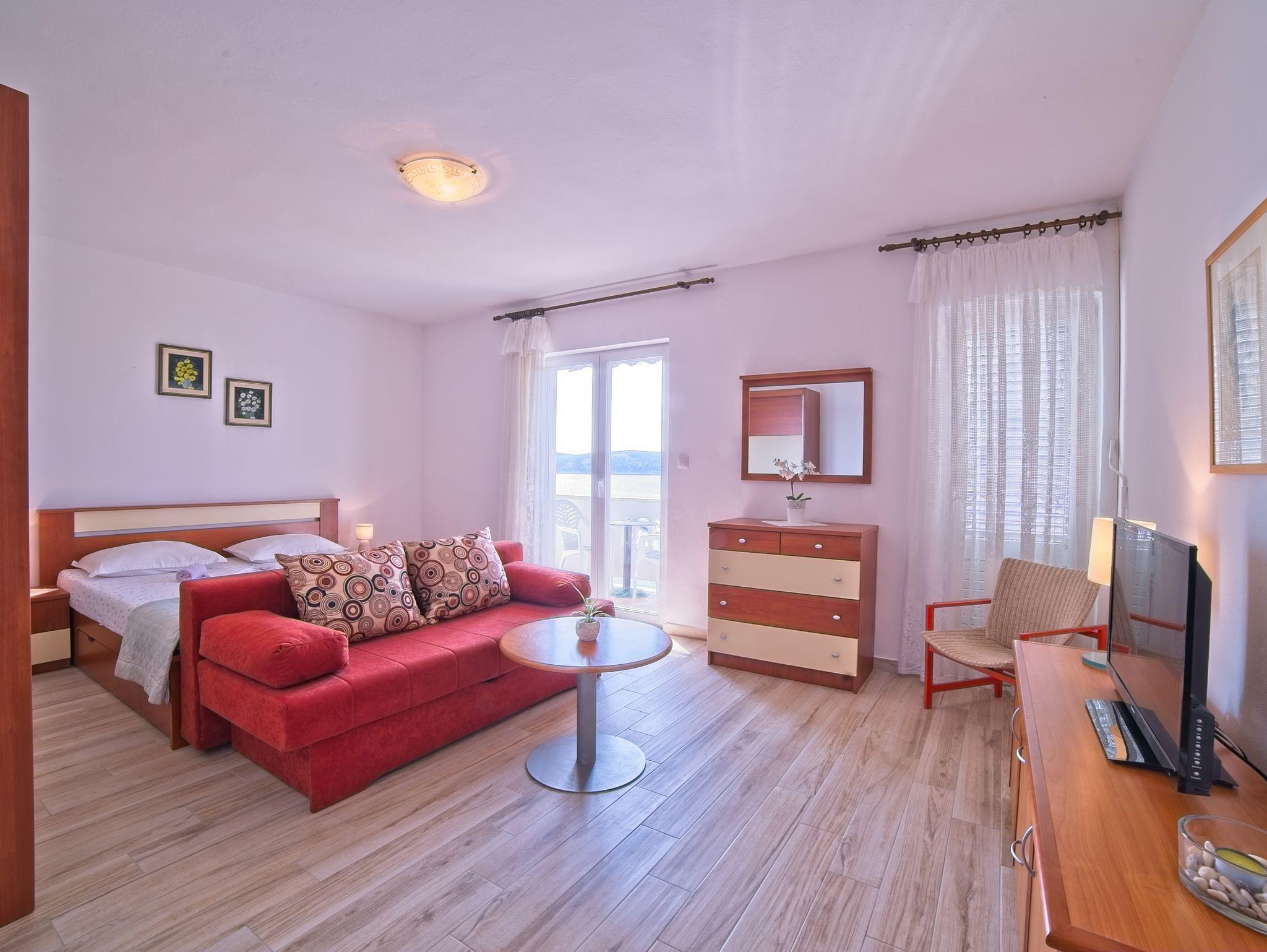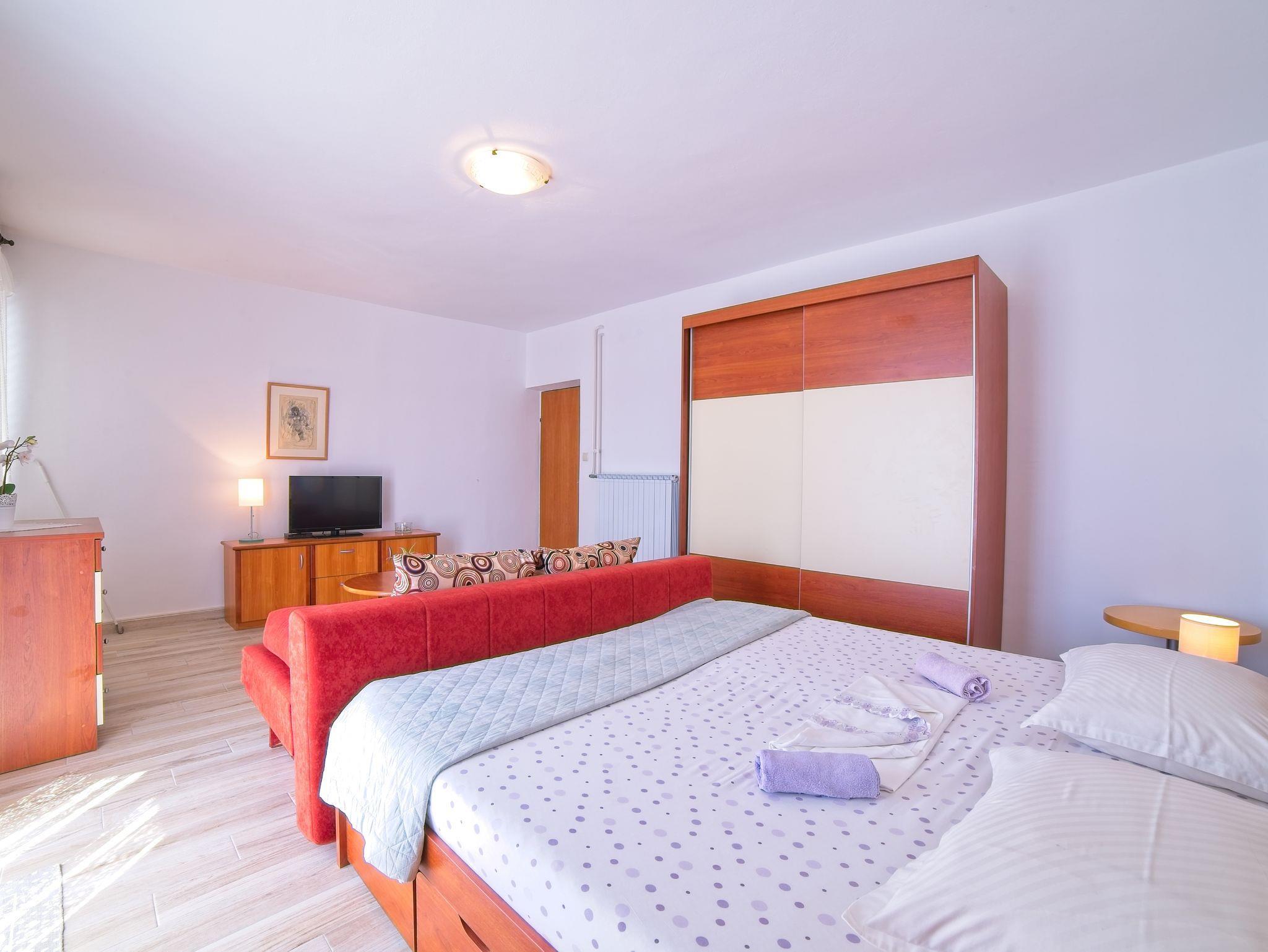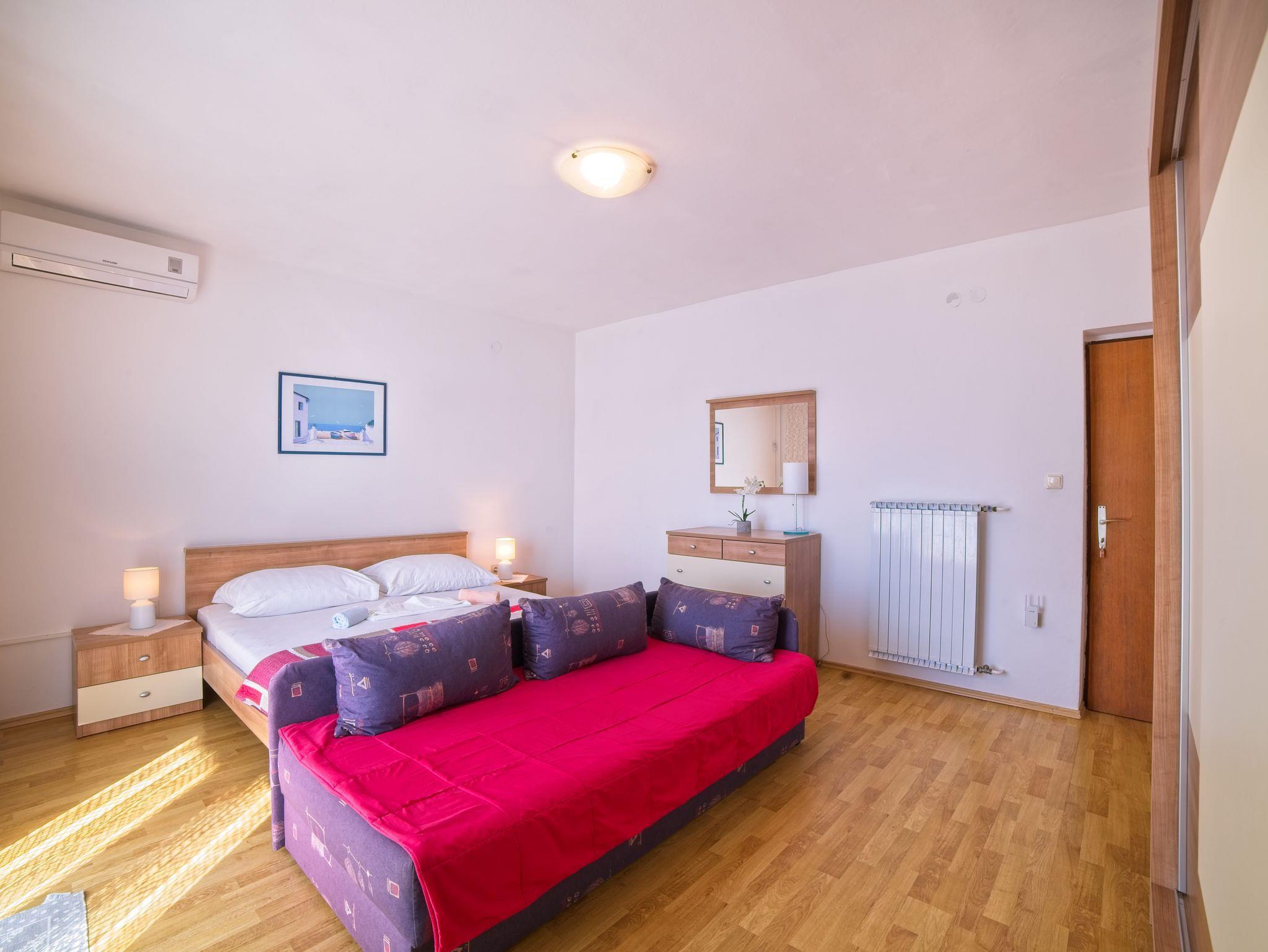 Ferienwohnung bietet Platz für 5 Gäste. Die Betten sind in Schlafzimmern, die es 2 gibt, innerhalb einer Gesamtfläche von 46m2, angeordnet. Die Gäste haben einen eigenen Balkon zur Verfügung, auf der sie in warmen Sommernächten genießen können. Das Apartment bietet Meerblick. Es ist erlaubt, Speisen auf dem Gemeinschafts-Grill vorzubereiten. IM PREIS INBEGRIFFEN: Kurtaxe, Endreinigung, Klimatisierung, Parkplatz, Internet, Bootsanlegeplatz, Liegestühle. VERBINDLICHE ZUSÄTZLICHE KOSTEN: Aufzahlung für Kurzaufenthalte (prozentualer Zuschlag pro Nächtigungsanzahl: 30% - 1, 20% - 2, 10% - 3). UNVERBINDLICHE ZUSÄTZLICHE KOSTEN: Wäschewaschen (5,00 € Waschen). Die Verfügbarkeit zusätzlicher Dienstleistungen in Ihrem reservierten Termin und die Preise derselben (falls nicht aufgeführt) müssen im Voraus überprüft werden. Zusätzliche Dienstleistungen die in der Zahlungsaufforderung nicht aufgeführt sind werden direkt beim Vermieter bezahlt, angenommen der Gast nutzt auch diese. Ermäßigung auf den Grundpreis: Gratistag 14=13 (bei einem Aufenthalt von 14 Tagen oder mehr erhalten Sie einen Gratistag für den Aufenthalt bis 31.12.26).