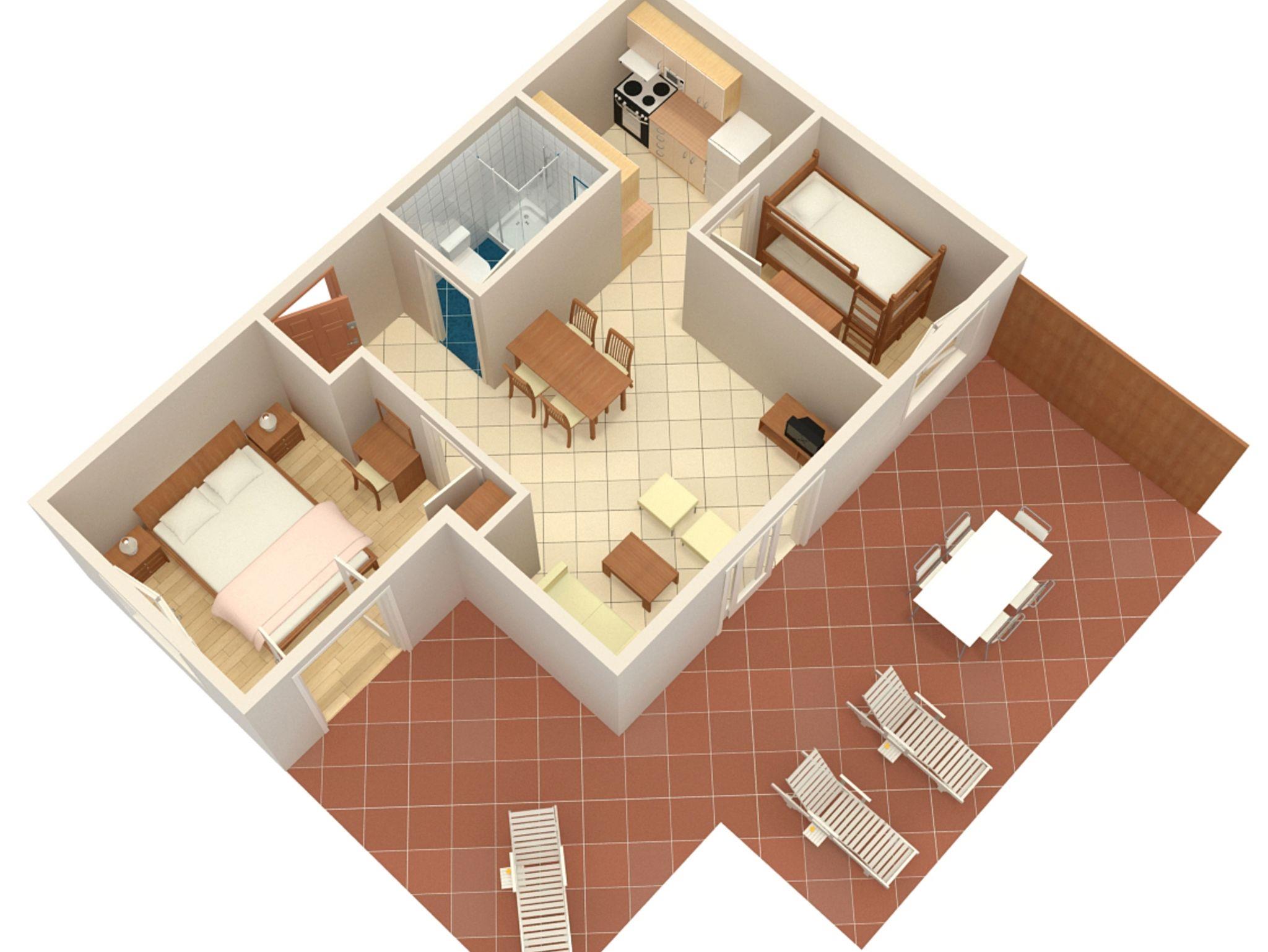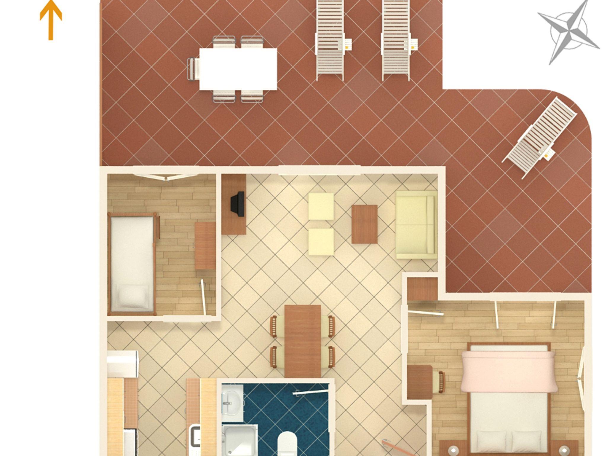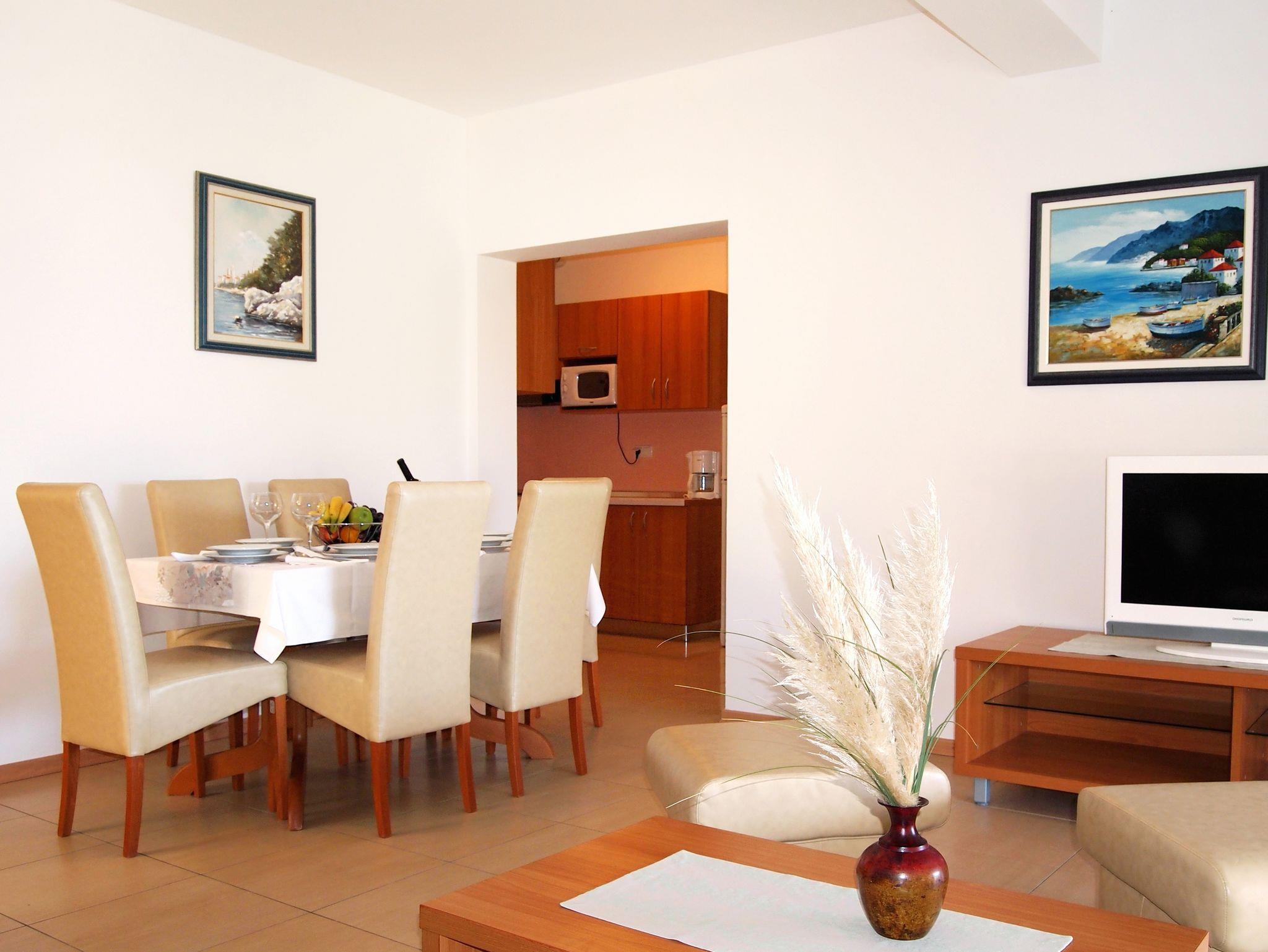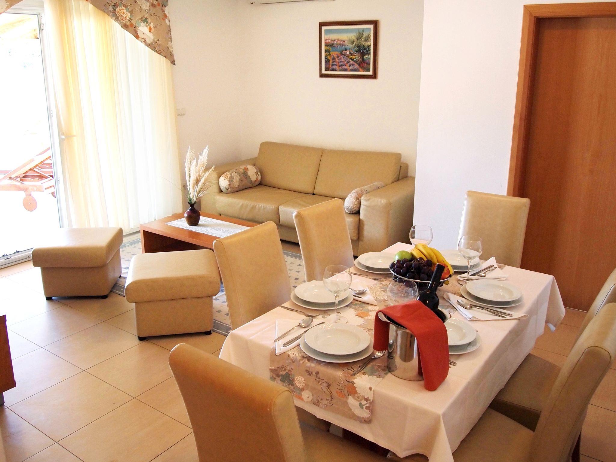 Ferienwohnung bietet Platz für 6 Gäste. Die Betten sind in Schlafzimmern, die es 2 gibt, und in Wohnzimmer, innerhalb einer Gesamtfläche von 46m2, angeordnet. Die Gäste haben eine eigene Terrasse zur Verfügung, auf der sie in warmen Sommernächten genießen können. Das Apartment bietet Meerblick. Es ist erlaubt, Speisen auf dem Gemeinschafts-Grill vorzubereiten. Während ihres Aufenthalts können Gäste das gemeinsam zur Nutzung stehende Schwimmbad benutzen. In der gebuchten Unterkunftseinheit zahlt man am Ort ein Depositum ( der Preis ist an der Internetseite angeführt ). IM PREIS INBEGRIFFEN: Endreinigung, Klimatisierung, Pool, Parkplatz, Internet, Föhn. VERBINDLICHE ZUSÄTZLICHE KOSTEN: Kurtaxe (Erwachsene 0,93 € - 1,90 € Nacht/Person, Kinderermäßigung 12 - 17 Jahre), Kaution (100,00 € Einmalzahlung). Die Verfügbarkeit zusätzlicher Dienstleistungen in Ihrem reservierten Termin und die Preise derselben (falls nicht aufgeführt) müssen im Voraus überprüft werden. Zusätzliche Dienstleistungen die in der Zahlungsaufforderung nicht aufgeführt sind werden direkt beim Vermieter bezahlt, angenommen der Gast nutzt auch diese.