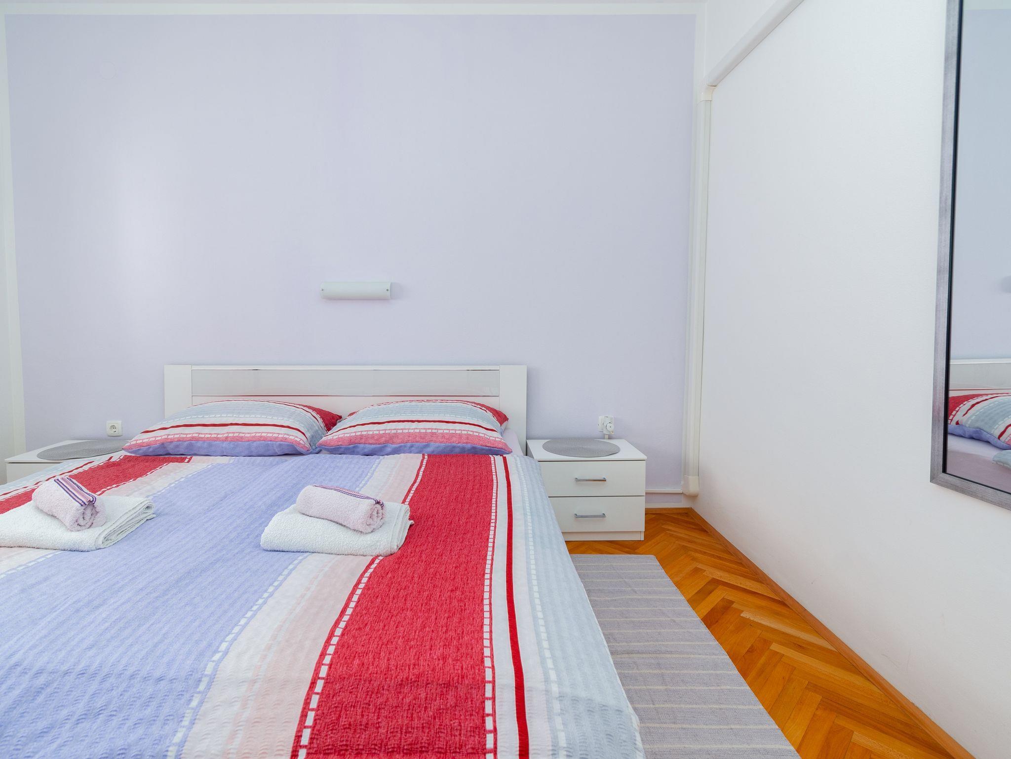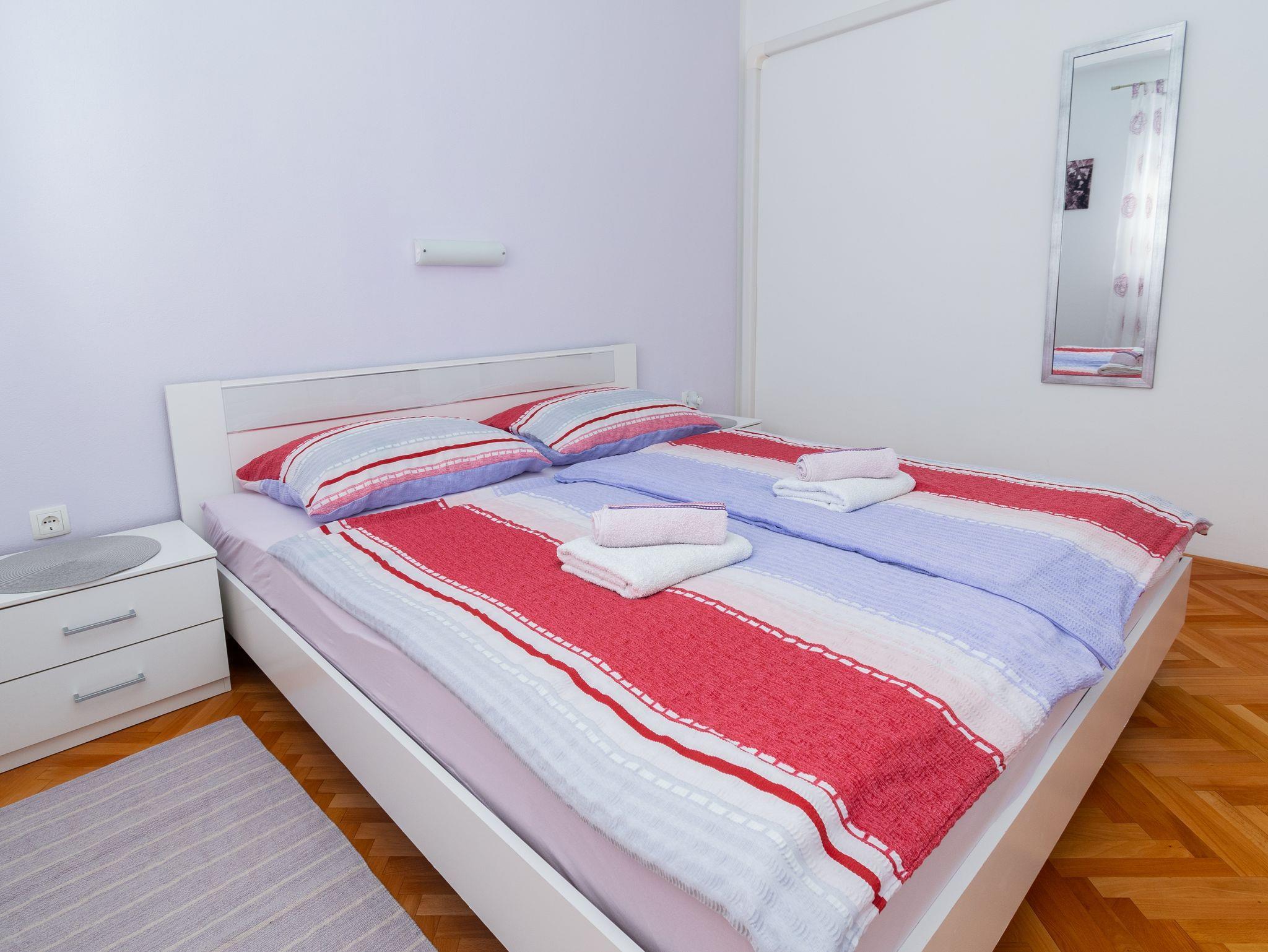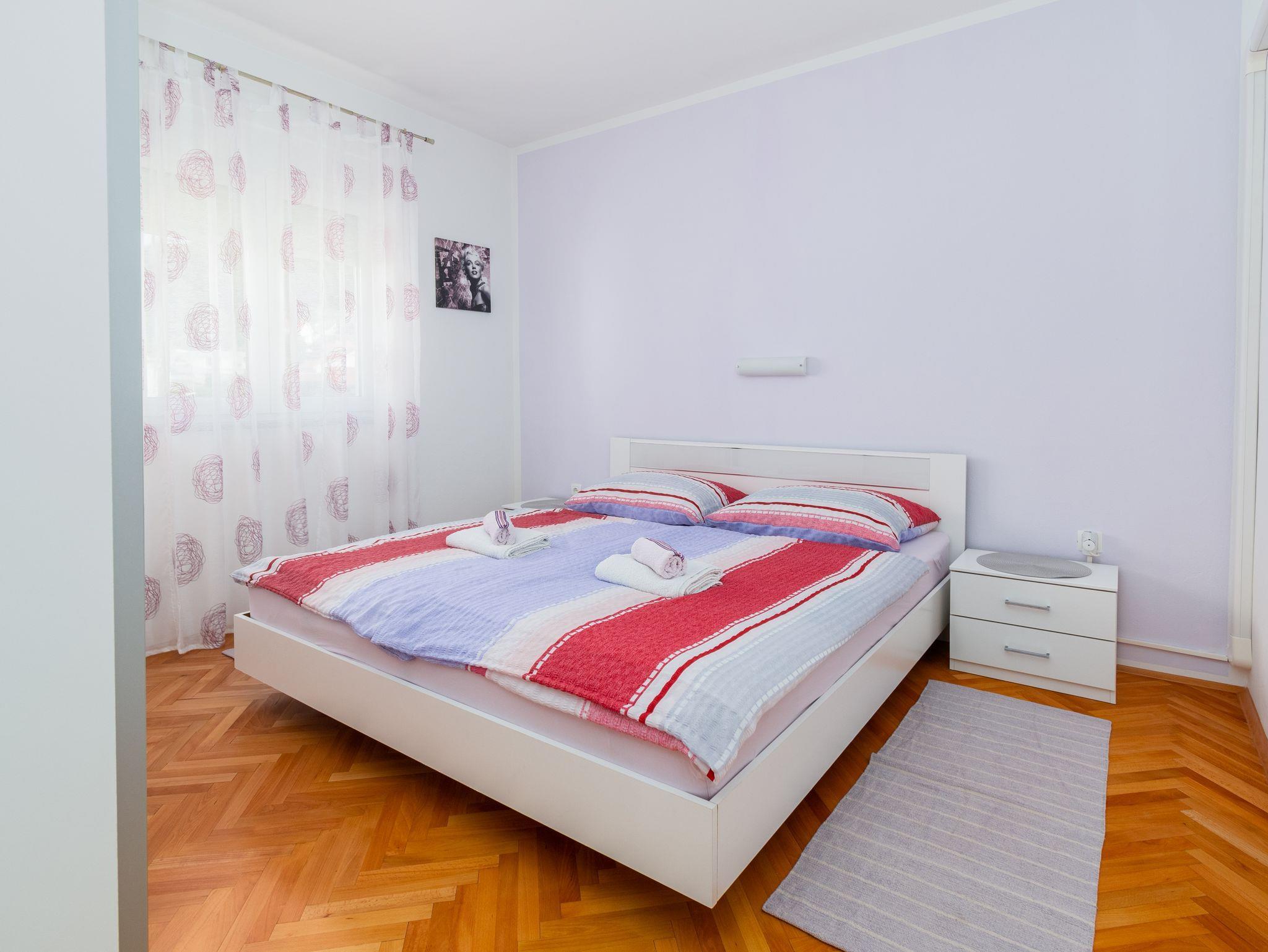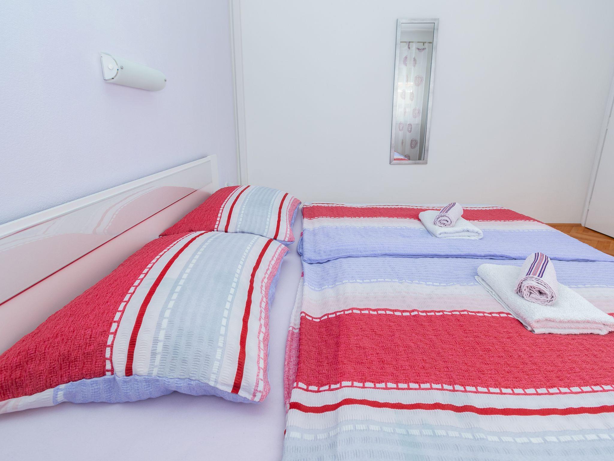 Ferienwohnung bietet Platz für 4 Gäste. Die Betten sind in Schlafzimmern, die es 2 gibt, innerhalb einer Gesamtfläche von 49m2, angeordnet. Die Gäste haben eine eigene Terrasse zur Verfügung, auf der sie in warmen Sommernächten genießen können. Das Apartment bietet Meerblick. Für vollen Genuss und Entspannung gibt es einen privaten Grill für Gäste dieser Unterkunft. IM PREIS INBEGRIFFEN: Kurtaxe, Endreinigung, Klimatisierung, Parkplatz, Internet, Kinderbett, Föhn. VERBINDLICHE ZUSÄTZLICHE KOSTEN: Aufzahlung für Kurzaufenthalte (prozentualer Zuschlag pro Nächtigungsanzahl: 30% - 1, 20% - 2, 10% - 3). Die Verfügbarkeit zusätzlicher Dienstleistungen in Ihrem reservierten Termin und die Preise derselben (falls nicht aufgeführt) müssen im Voraus überprüft werden. Zusätzliche Dienstleistungen die in der Zahlungsaufforderung nicht aufgeführt sind werden direkt beim Vermieter bezahlt, angenommen der Gast nutzt auch diese.