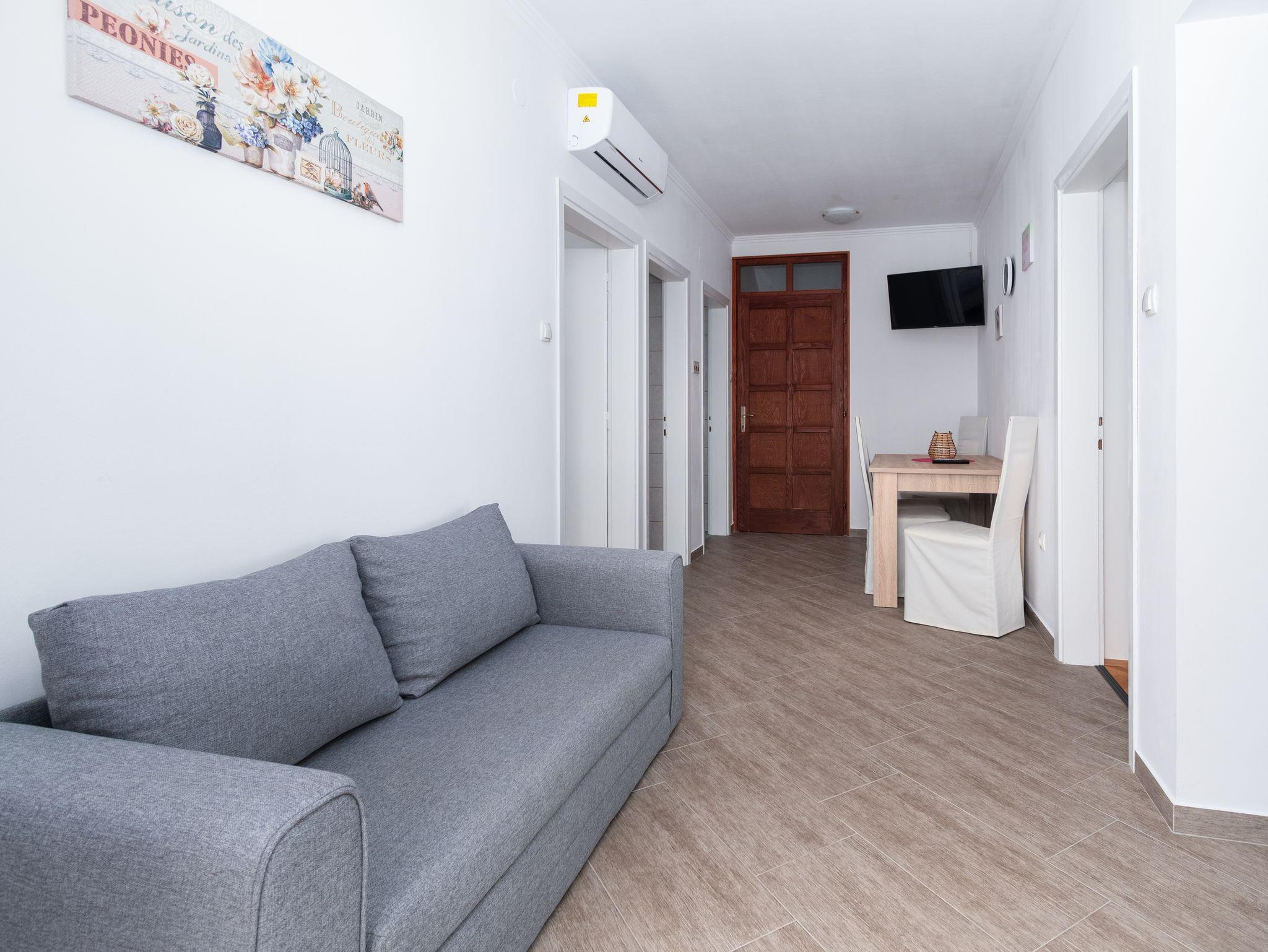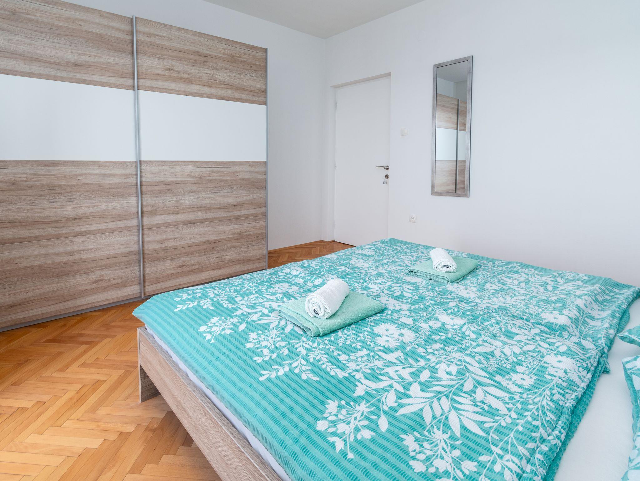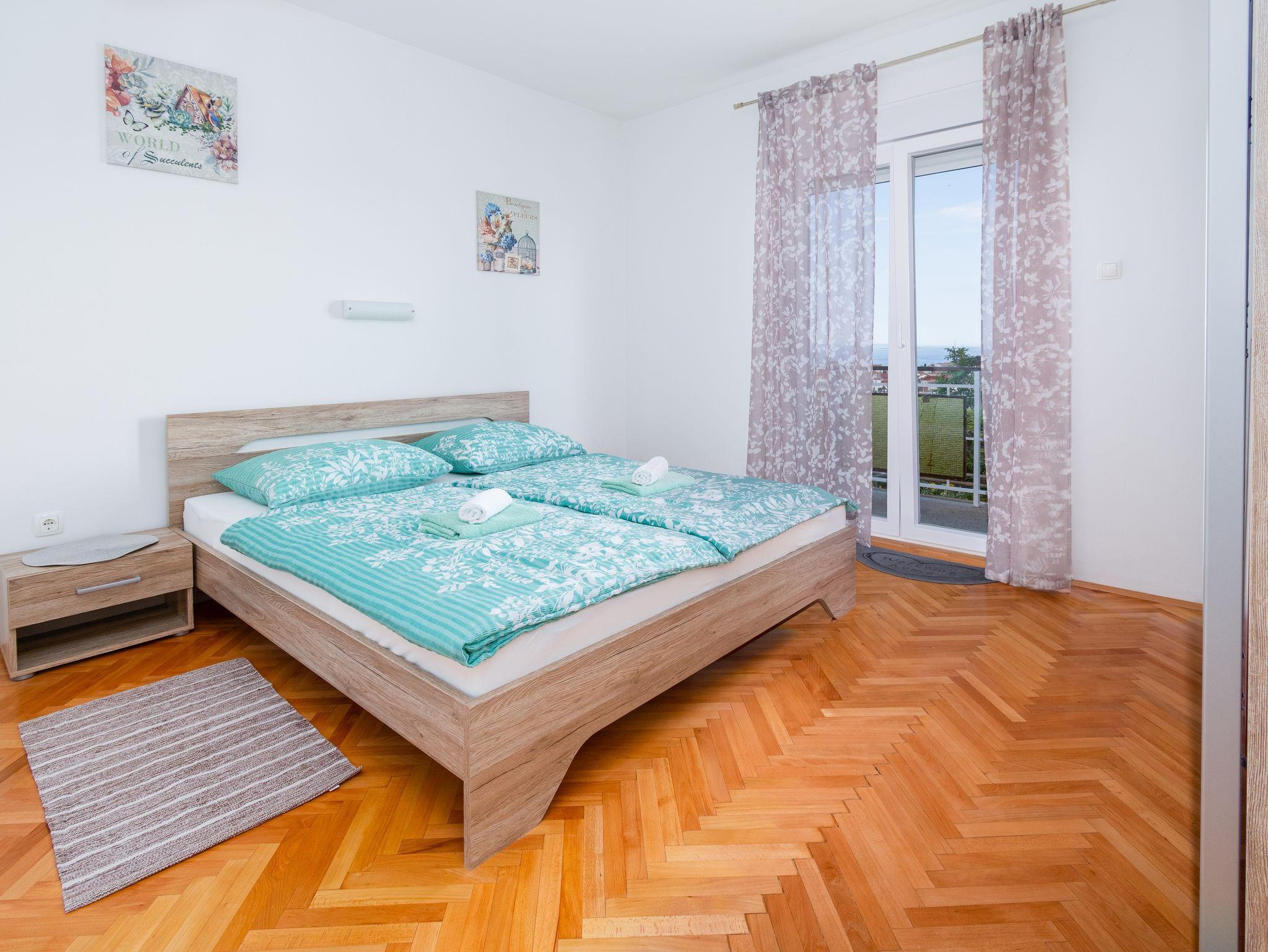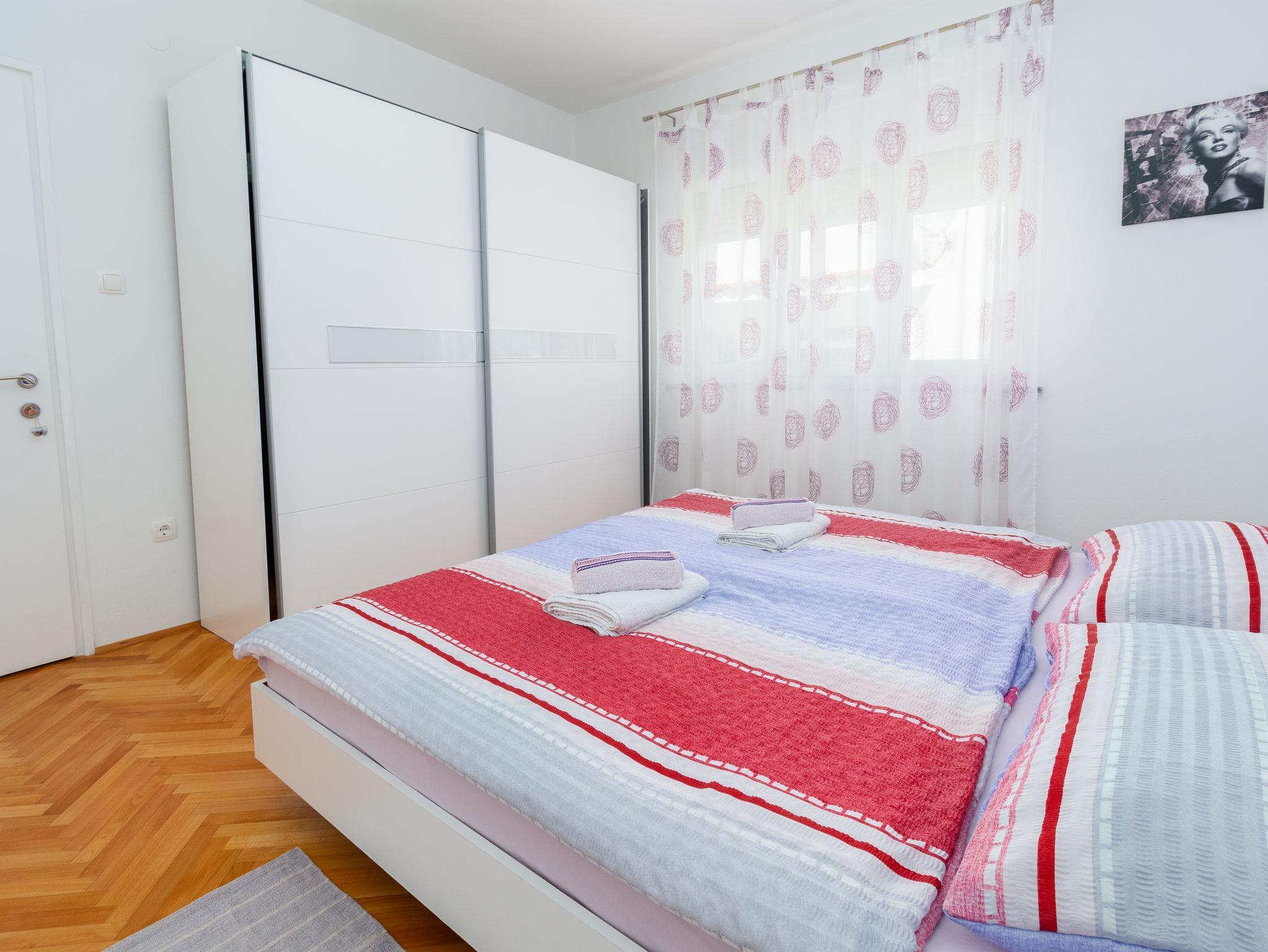 Ferienwohnung bietet Platz für 4 Gäste. Die Betten sind in Schlafzimmern, die es 2 gibt, innerhalb einer Gesamtfläche von 49m2, angeordnet. Die Gäste haben eine eigene Terrasse zur Verfügung, auf der sie in warmen Sommernächten genießen können. Das Apartment bietet Meerblick. Für vollen Genuss und Entspannung gibt es einen privaten Grill für Gäste dieser Unterkunft. IM PREIS INBEGRIFFEN: Kurtaxe, Endreinigung, Klimatisierung, Parkplatz, Internet, Kinderbett, Föhn. VERBINDLICHE ZUSÄTZLICHE KOSTEN: Aufzahlung für Kurzaufenthalte (prozentualer Zuschlag pro Nächtigungsanzahl: 30% - 1, 20% - 2, 10% - 3). Die Verfügbarkeit zusätzlicher Dienstleistungen in Ihrem reservierten Termin und die Preise derselben (falls nicht aufgeführt) müssen im Voraus überprüft werden. Zusätzliche Dienstleistungen die in der Zahlungsaufforderung nicht aufgeführt sind werden direkt beim Vermieter bezahlt, angenommen der Gast nutzt auch diese.