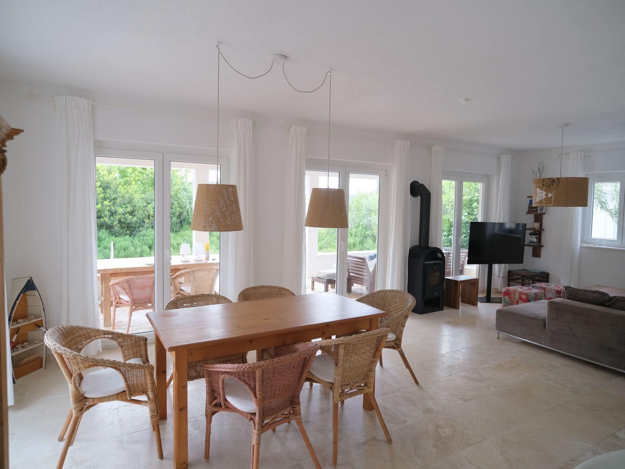 Das sehr gemütlich eingerichtete Haus verfügt im ersten Obergeschoss über drei Schlafzimmer mit jeweils einem Doppelbett (180 x 200 cm) und Klimaanlage sowie einem Badezimmer mit Badewanne. Im Erdgeschoss befinden sich ein Duschbad sowie der Wohn- und Essbereich mit offener Küche und Holzofen. Über das ebenfalls klimatisierte Wohnzimmer gelangt man auf die überdachte Terrasse mit einem weiteren Essplatz und einer gemütlicher Lounge. Unmittelbar an die Terrasse schließt sich der Pool an, welcher Ihnen von Anfang Mai bis Ende Oktober zur Verfügung steht. Zudem gibt es einen windgeschützten Hof mit Sonnenliegen und einer Hängematte. Ein Holzkohlegrill ist auch vorhanden. Das Grundstück ist nicht vollständig eingezäunt.