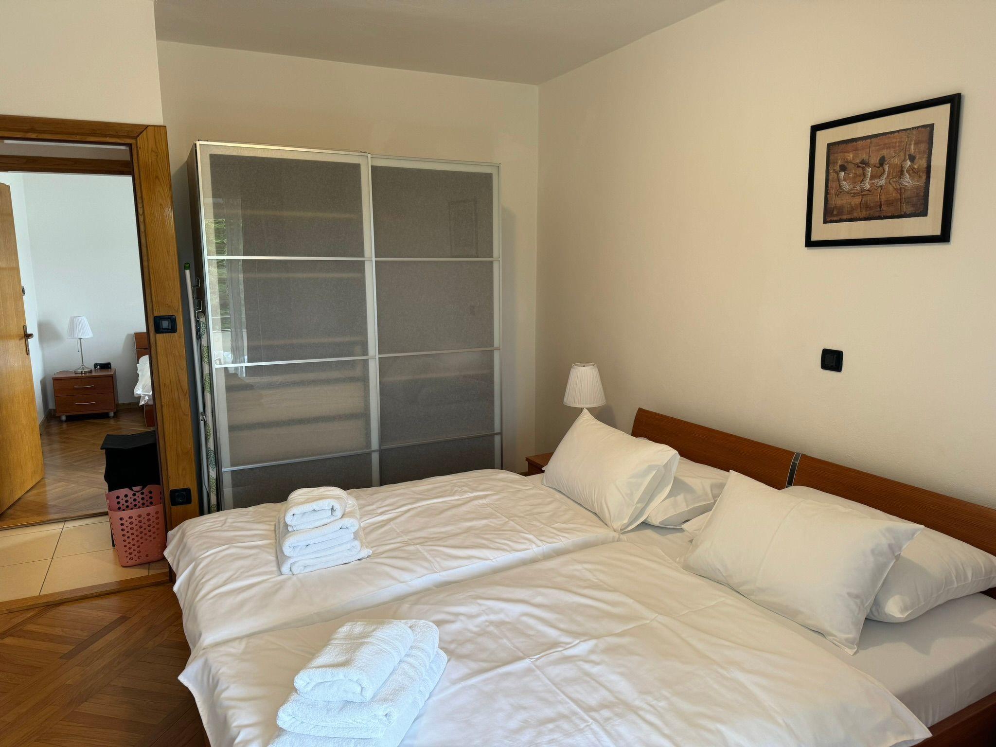 Die 80 m² große Ferienwohnung im ersten Stock besteht aus einem Wohn- und Essbereich mit integrierter, offener Küche, zwei Schlafzimmern und zwei modernen Bädern. Der klimatisierte (Heizung und Kühlung) Wohnbereich ist mit zwei bequemen Sofas, einem wandmontierten Flachbildfernseher mit Satellitenempfang und USB-Anschluss, einer Stereoanlage, einem Safe für Ihre Wertsachen und einem Esstisch mit Stühlen ausgestattet. Die moderne, offene Einbauküche ist mit einer Spülmaschine, einem Cerankochfeld mit eleganter Edelstahl-Dunstabzugshaube, einem Backofen, einem Kühlschrank mit Gefrierfach, einer Mikrowelle, einem Wasserkocher und einer Kaffeemaschine ausgestattet. Beide Schlafzimmer verfügen über je ein 180 cm x 200 cm großes Doppelbett, Nachttische mit Leselampen und Kleiderschränke mit viel Stauraum für Kleidung und Gepäck. Außerdem kann eines der Sofas im Wohnbereich in ein zusätzliches Bett (120 cm x 180 cm) für eine weitere Person umgewandelt werden. Die beiden Bäder sind jeweils mit einer geräumigen Duschkabine, einem Waschtisch mit Unterschrank und Wandspiegel sowie einer Toilette ausgestattet. Eine Waschmaschine und ein Babybett sind vorhanden, Bettwäsche und Handtücher werden in ausreichender Menge zur Verfügung gestellt und ein zuverlässiger Wi-Fi-Internetzugang ist ebenfalls kostenlos in Ihrer Ferienwohnung verfügbar.